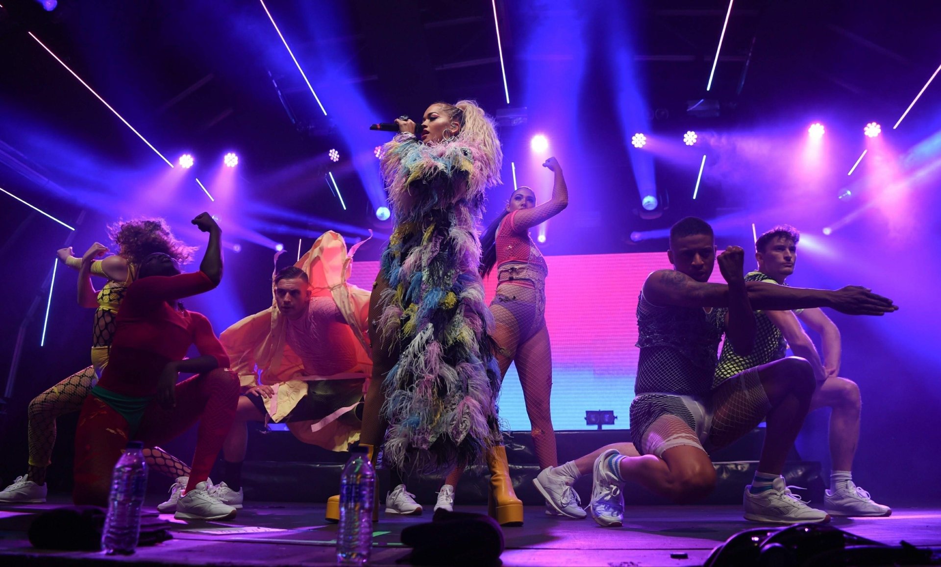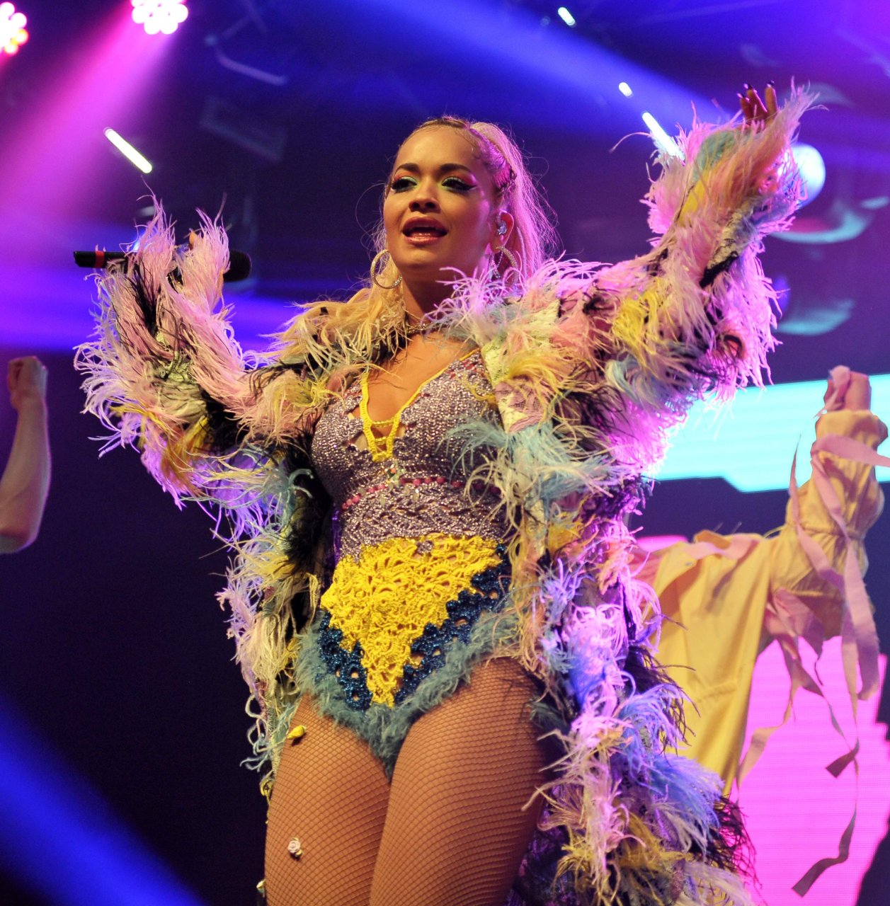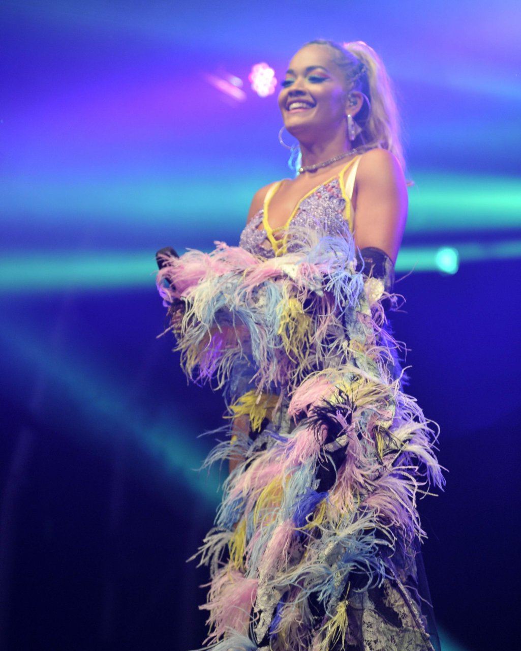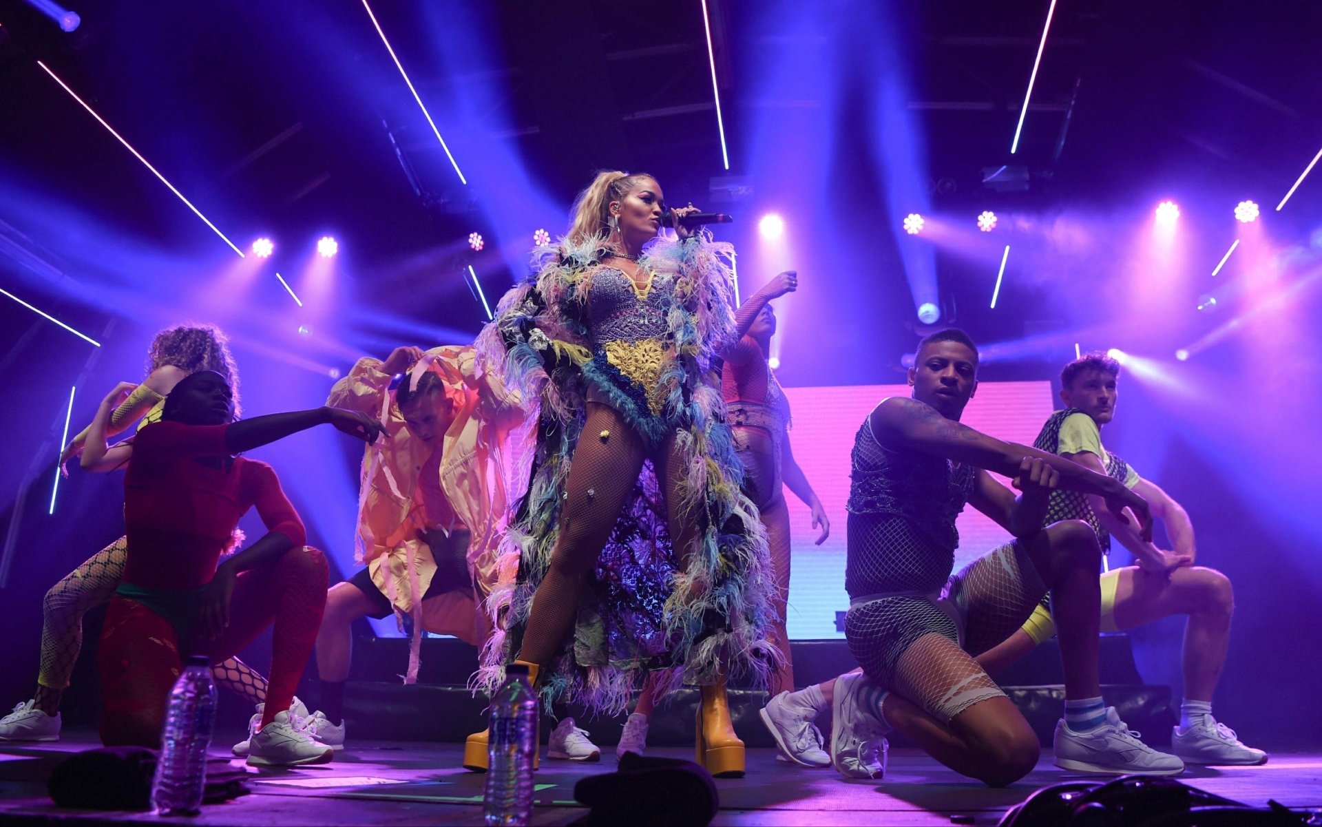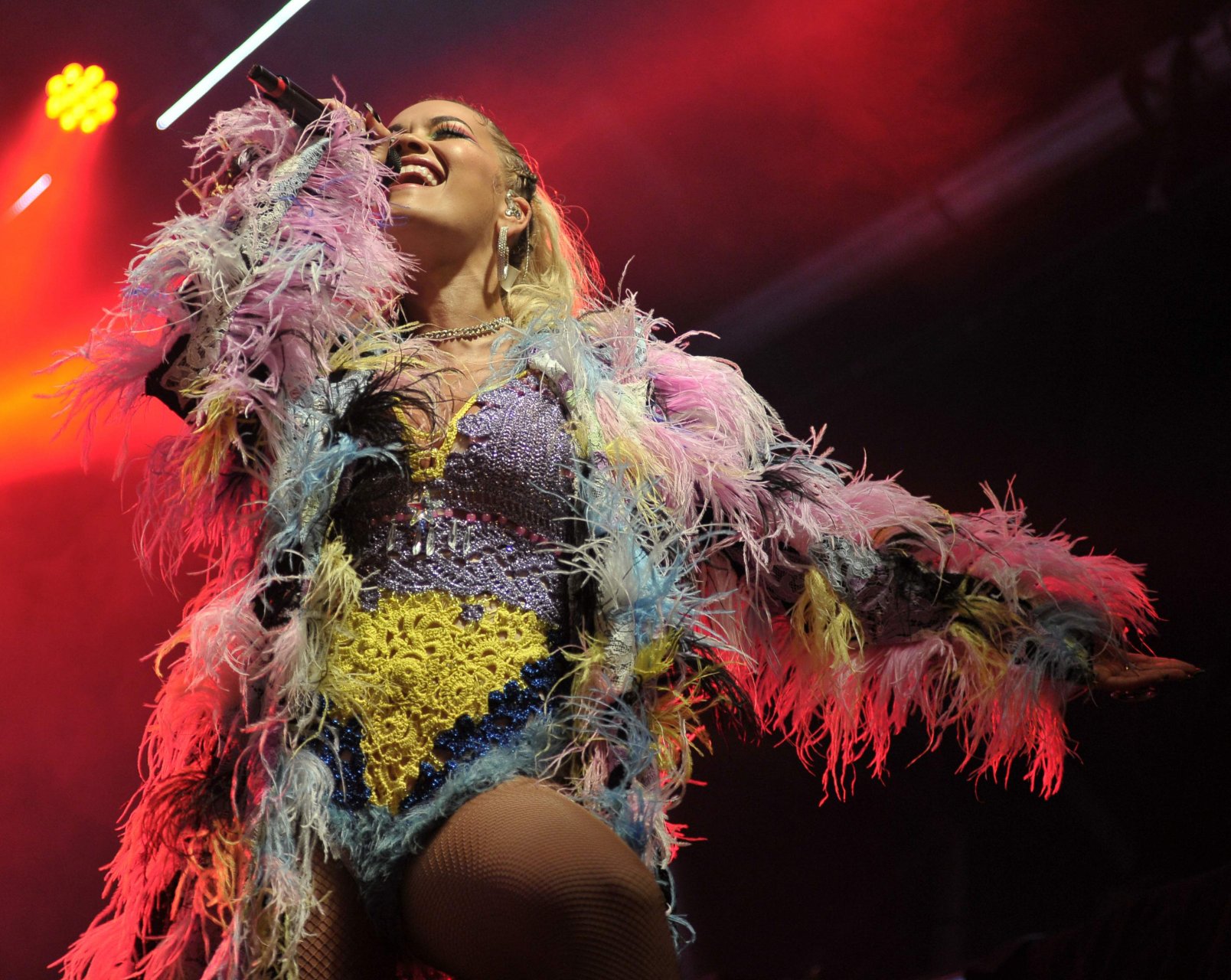 Рита Ора выступает на Главной сцене на Big Weekend Manchester Pride 2018 в Лондоне, 26.08.2018. 27-летняя британская певица выбрала наряд с перьями и сетчатыми колготками.