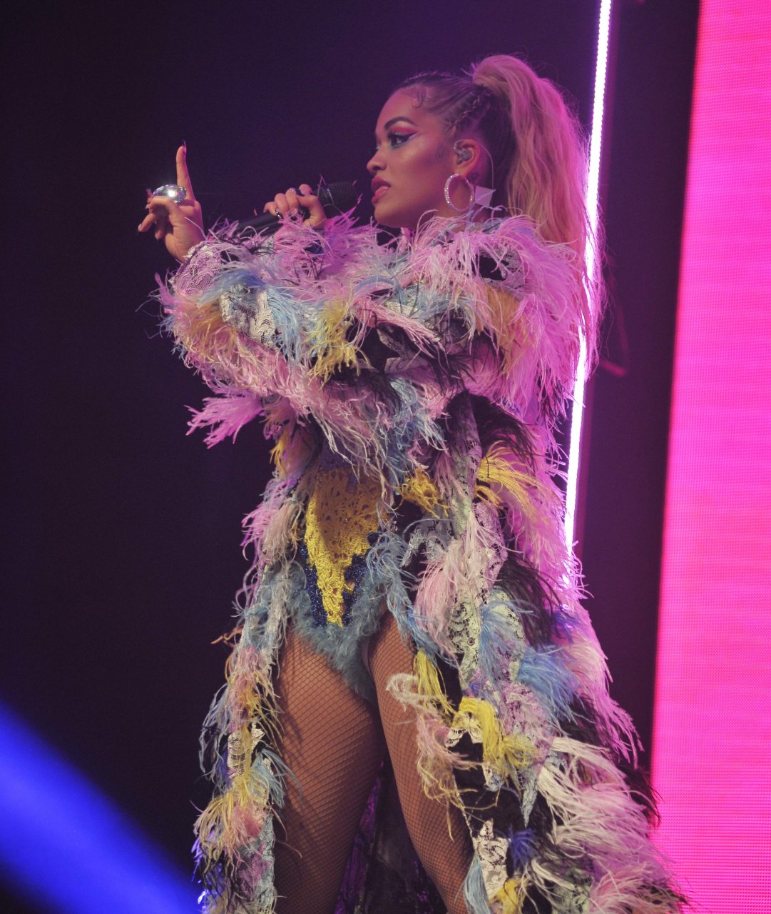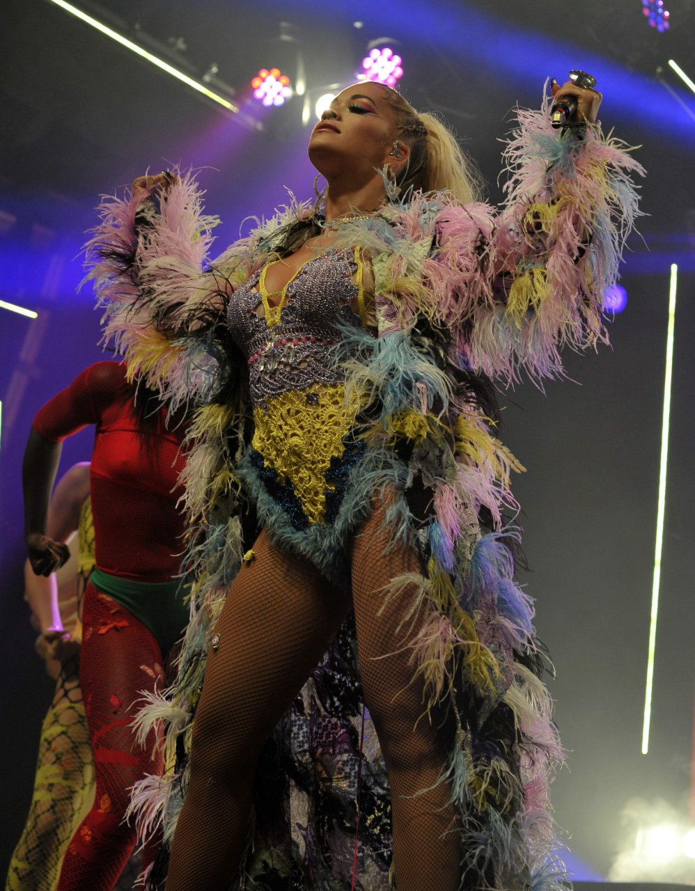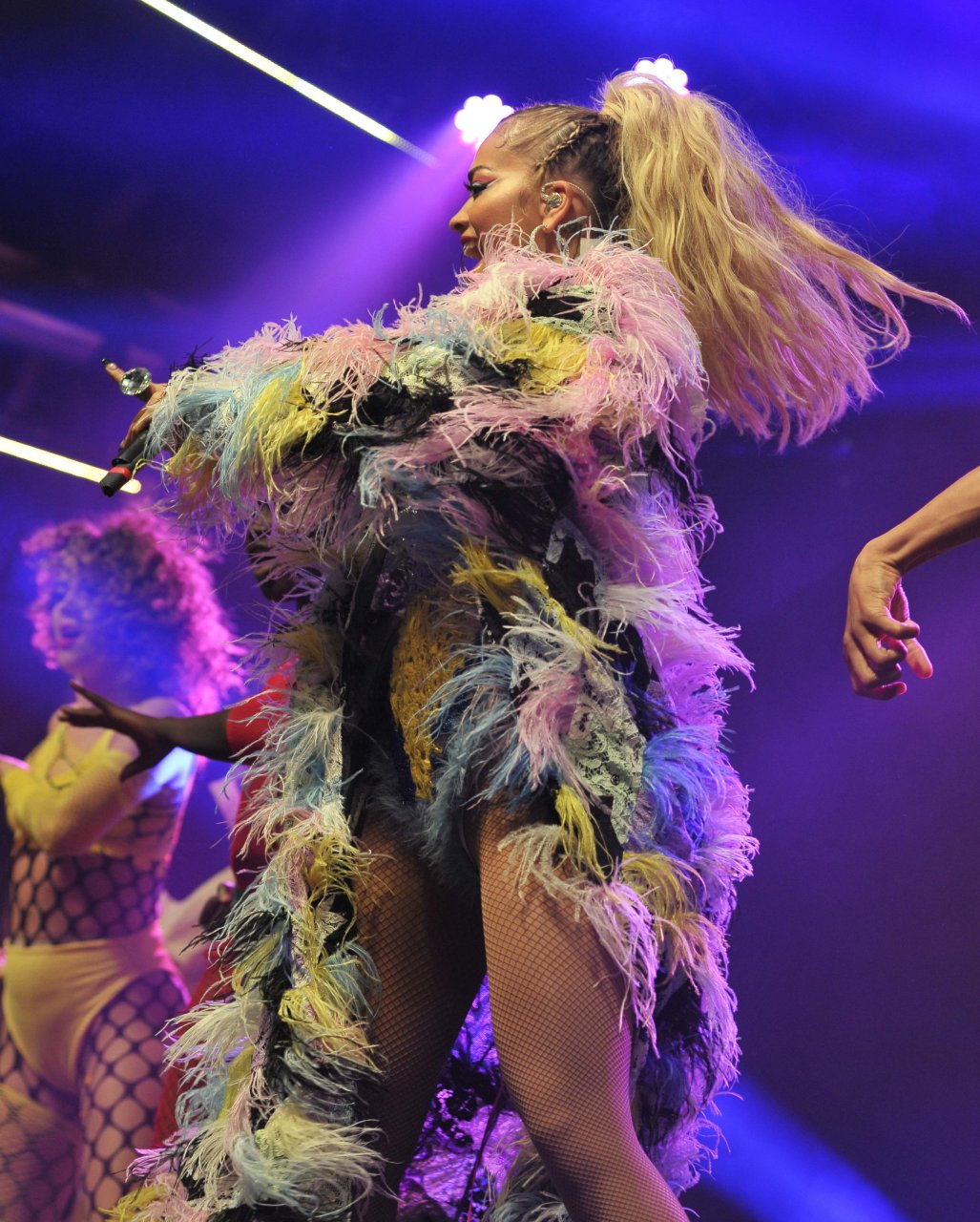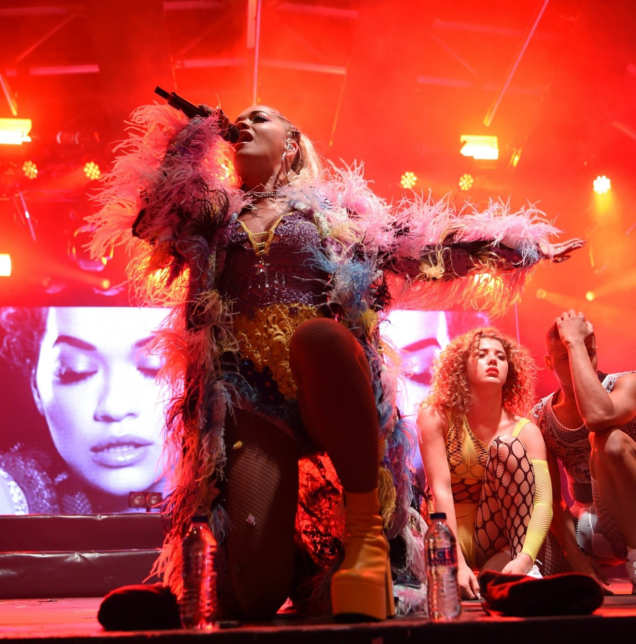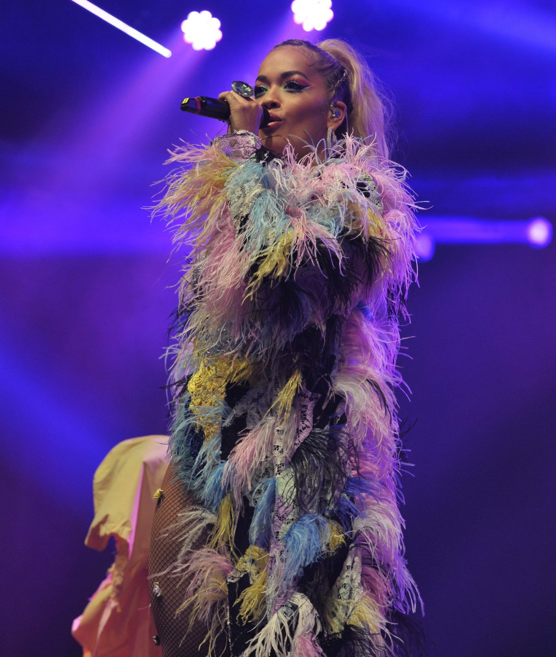 Рита Ора выступает на Главной сцене на Big Weekend Manchester Pride 2018 в Лондоне, 26.08.2018. 27-летняя британская певица выбрала наряд с перьями и сетчатыми колготками.