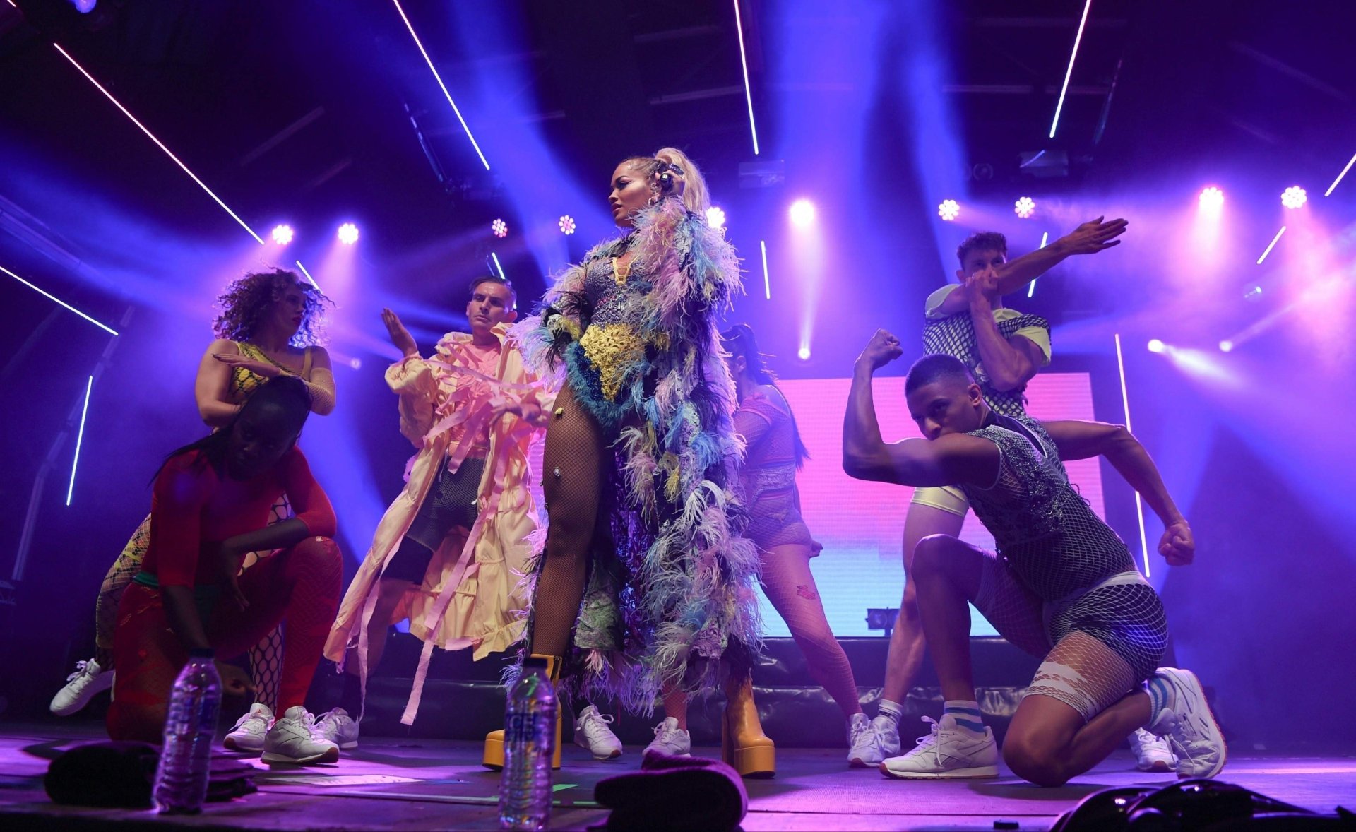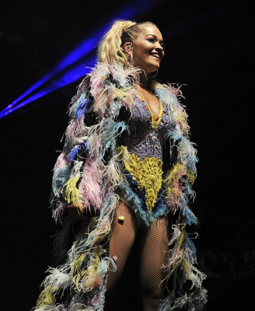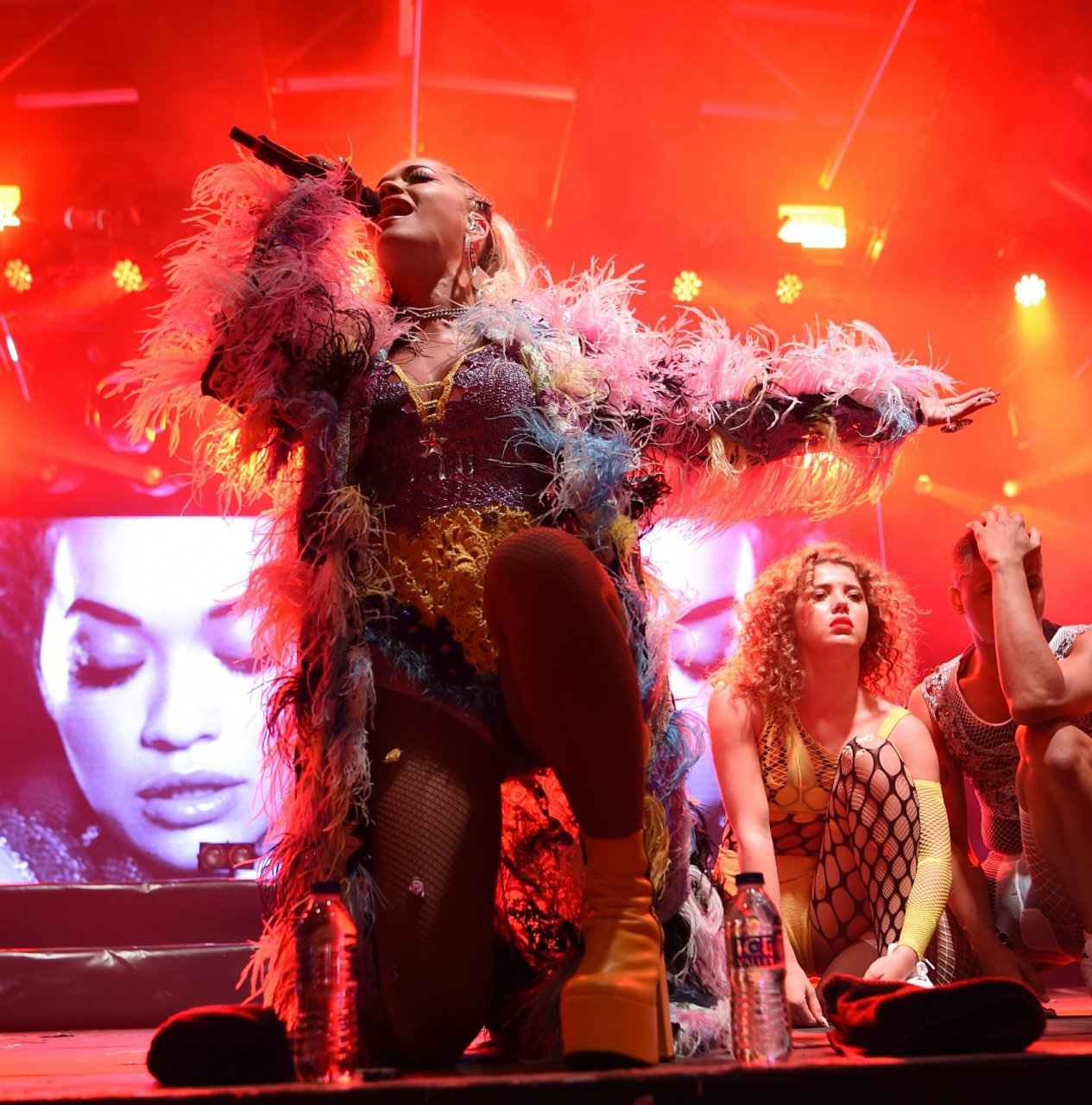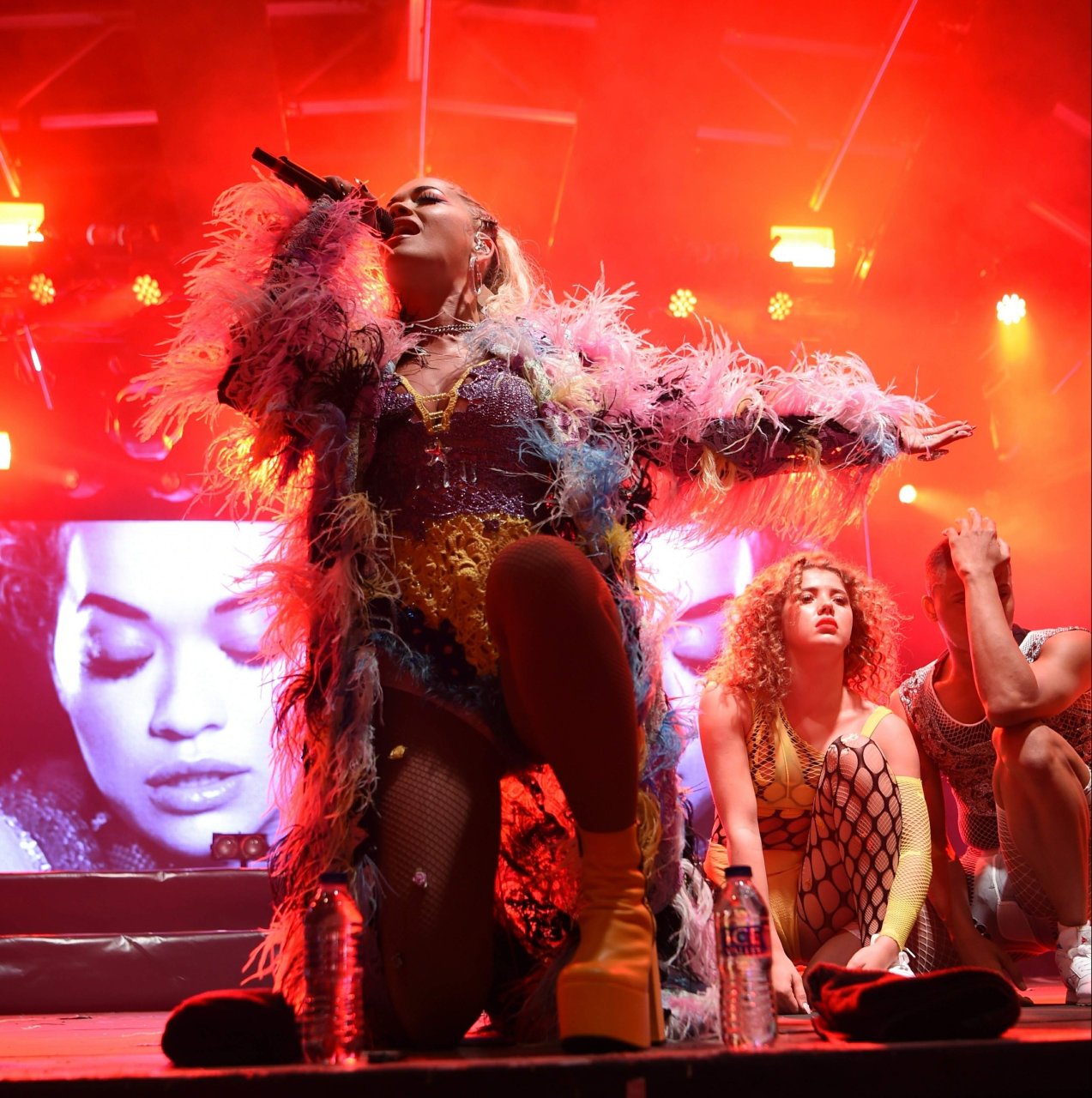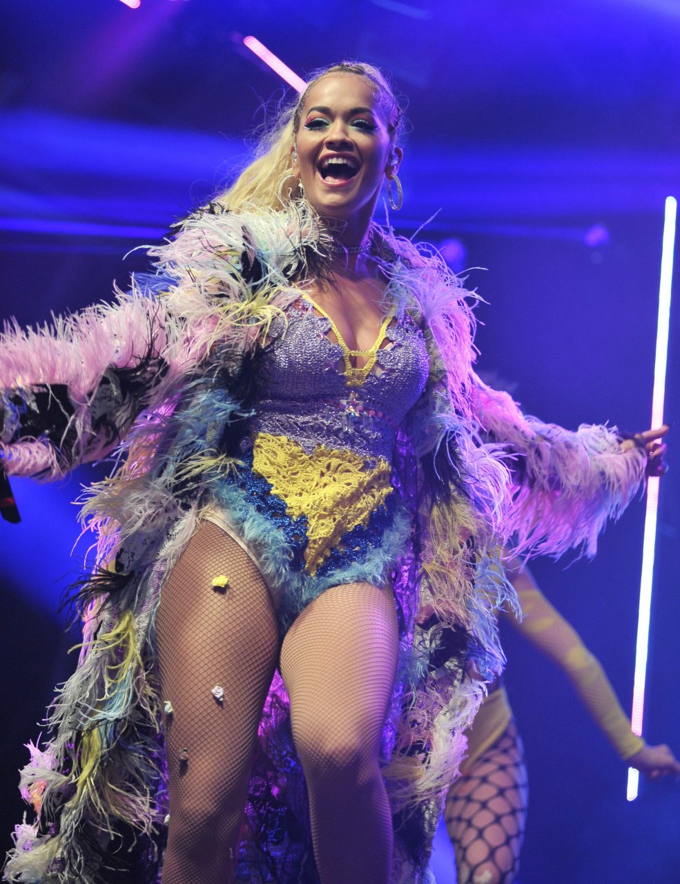 Рита Ора выступает на Главной сцене на Big Weekend Manchester Pride 2018 в Лондоне, 26.08.2018. 27-летняя британская певица выбрала наряд с перьями и сетчатыми колготками.