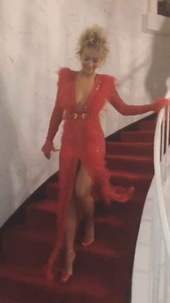 Певица Рита Ора в прозрачном красном платье на вечеринке Vanity Fair Oscar Party 2018 в Беверли-Хиллз, 03/04/2018.
