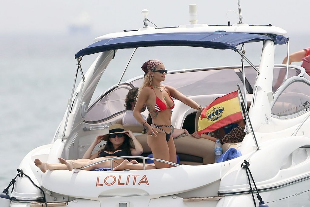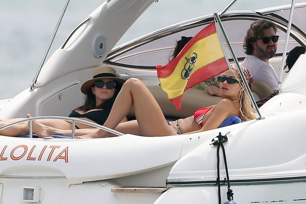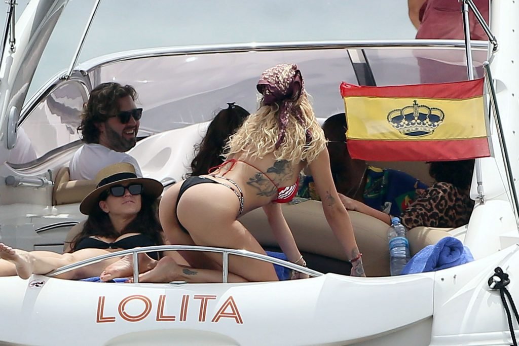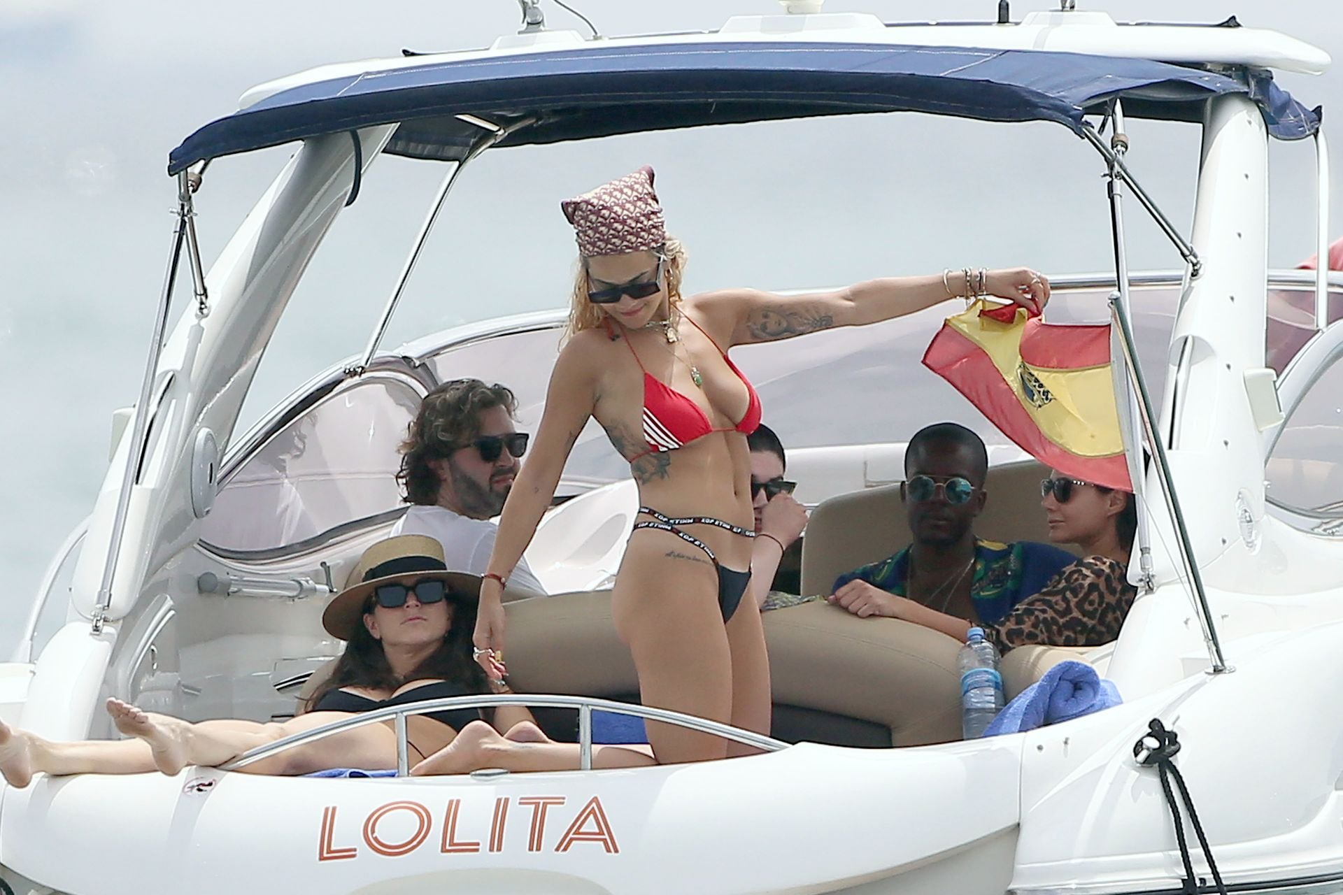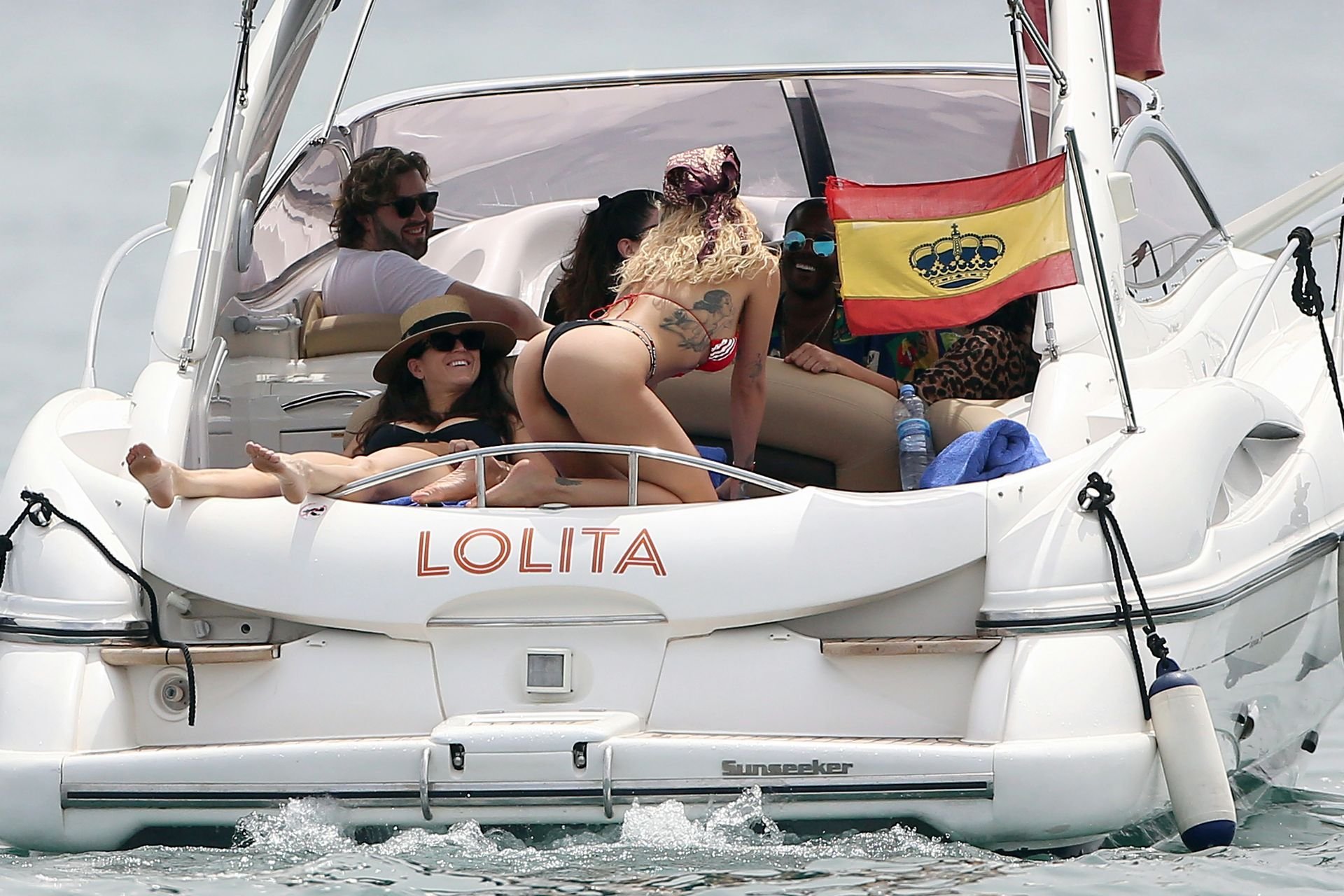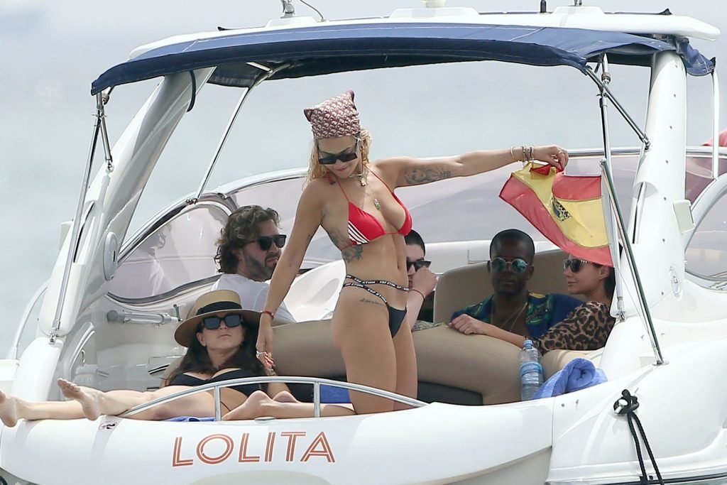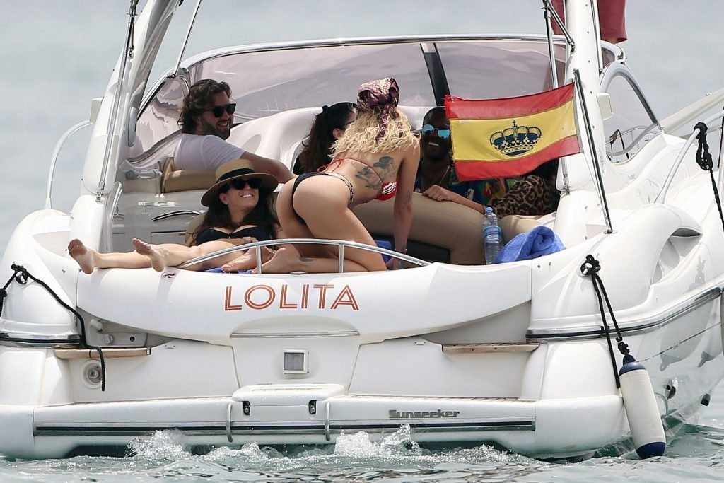 Британская певица Рита Ора и её друзья были сфотографированы на лодке в Ибице, 08/07/2019. Рита была в крошечных плавках White Fox, позируя во всей красе. Лодка называлась “Лолита”.