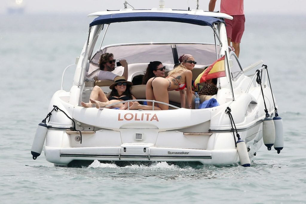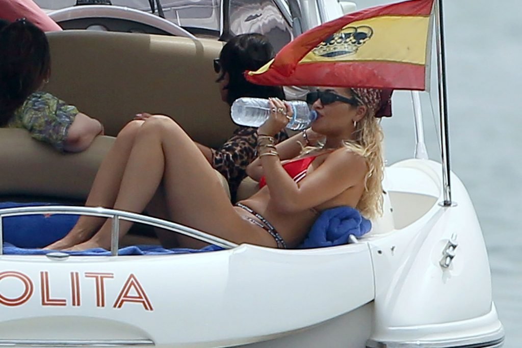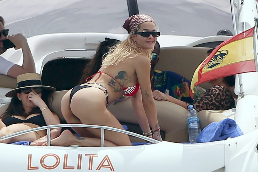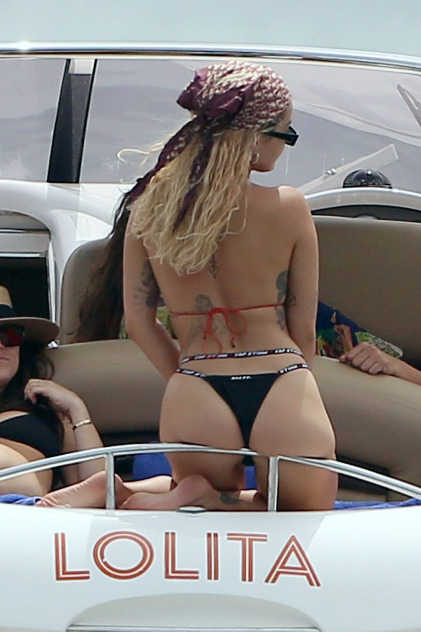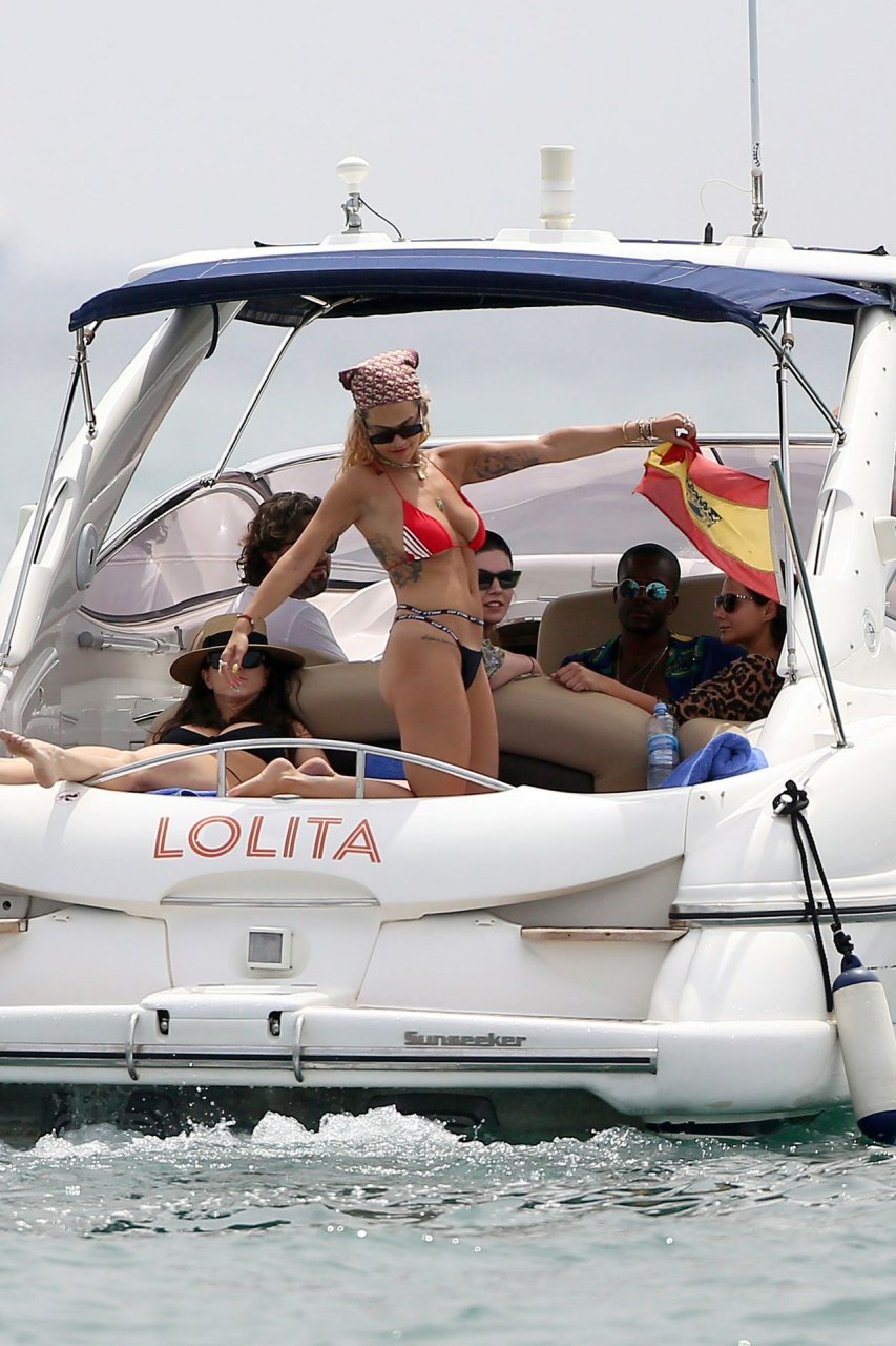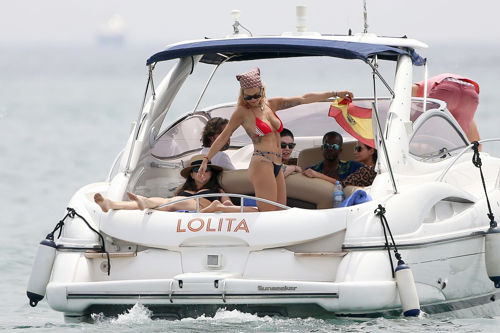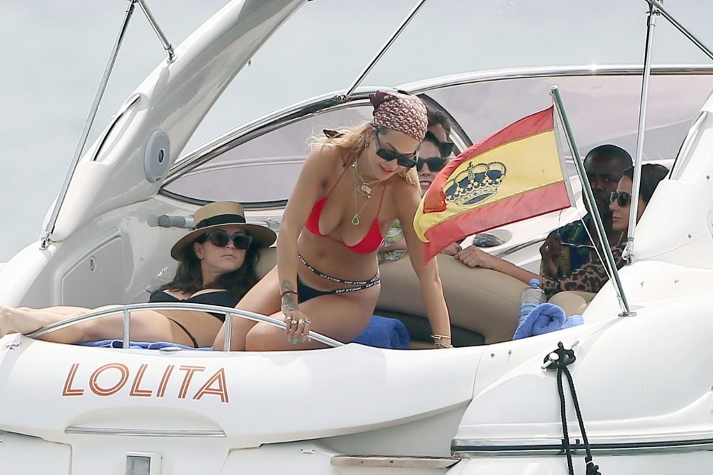 Британская певица Рита Ора и её друзья были сфотографированы на лодке в Ибице, 08/07/2019. Рита была в крошечных плавках White Fox, позируя во всей красе. Лодка называлась “Лолита”.