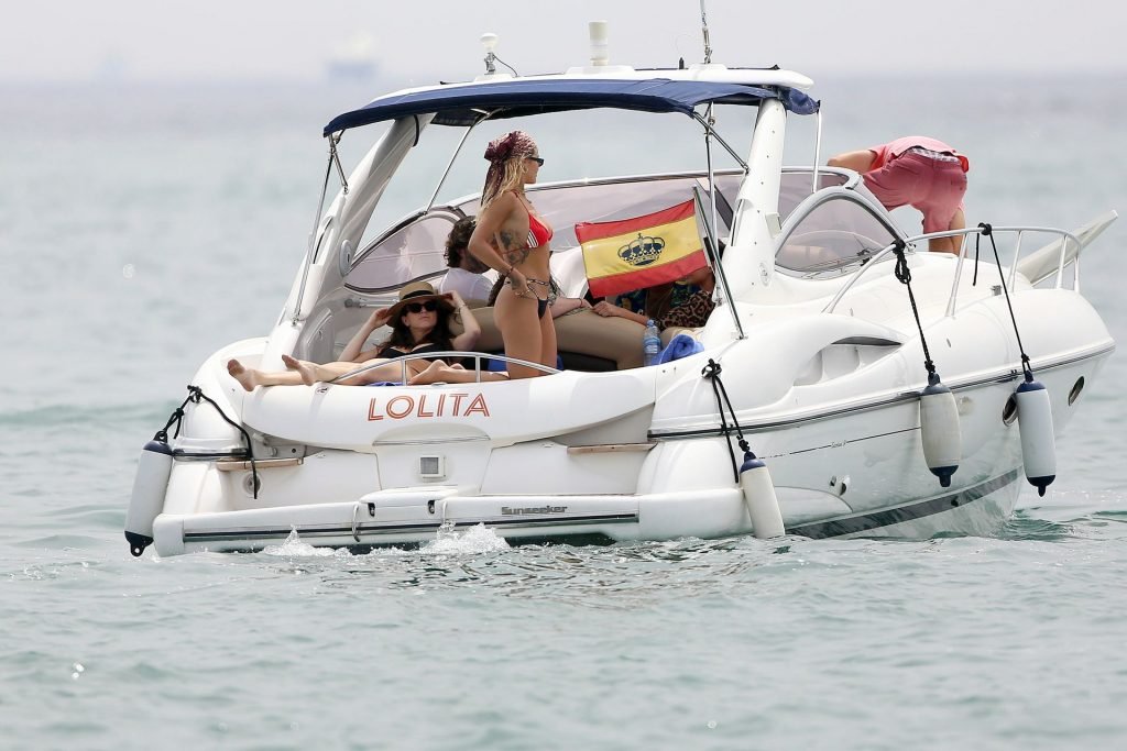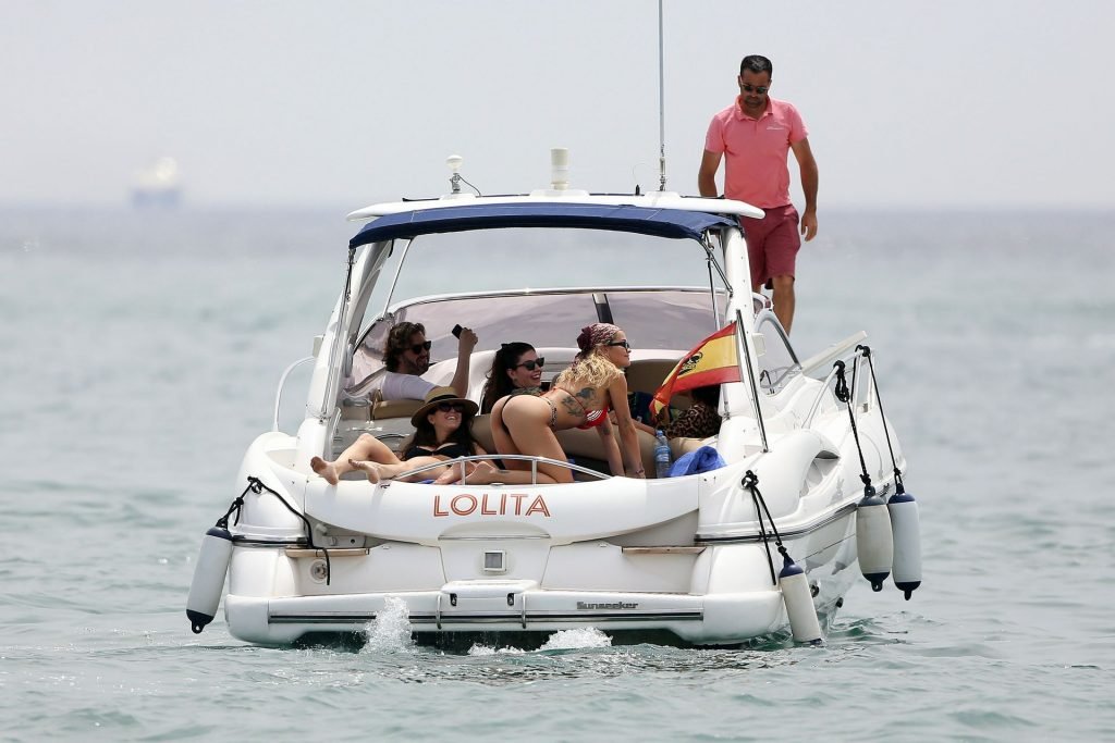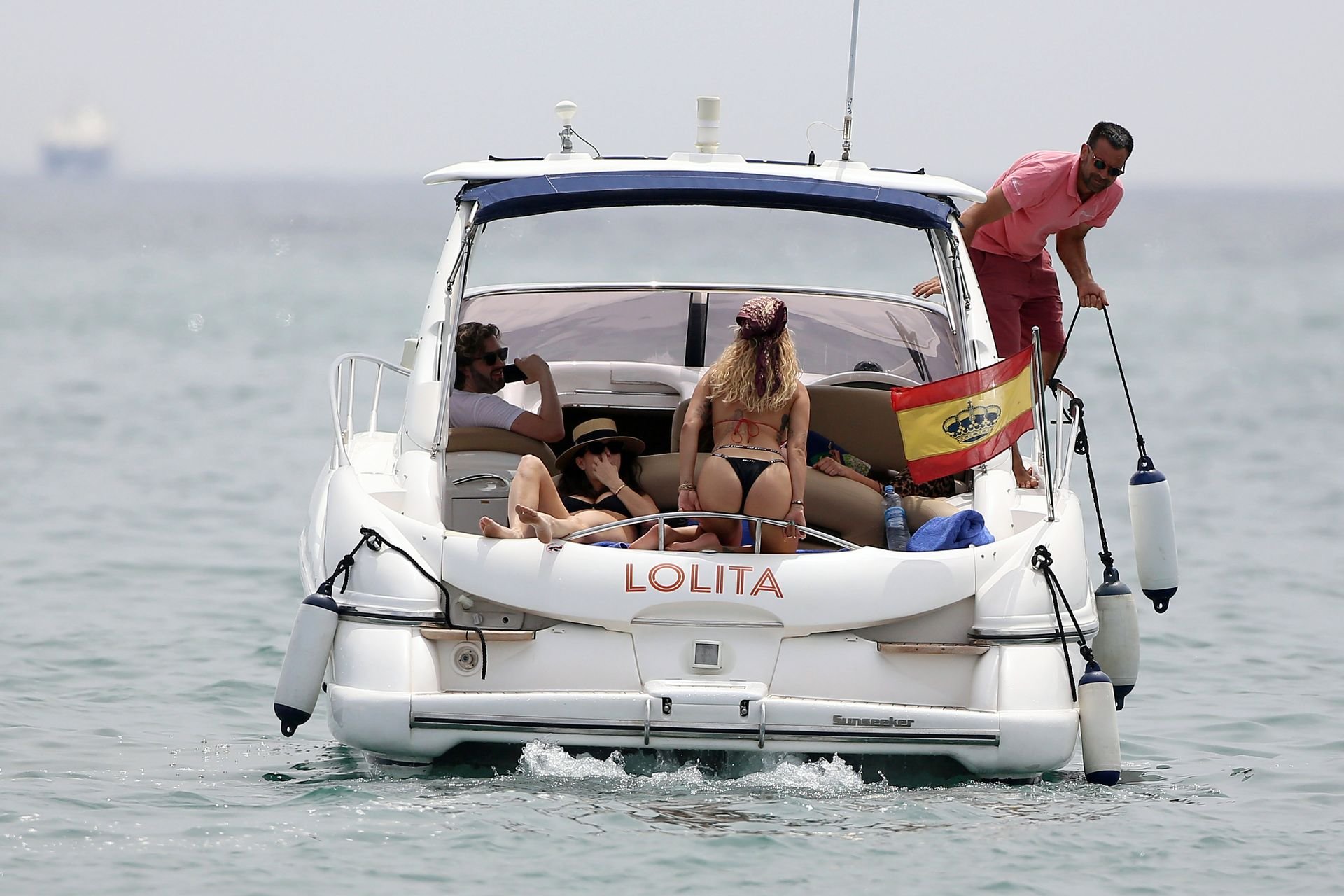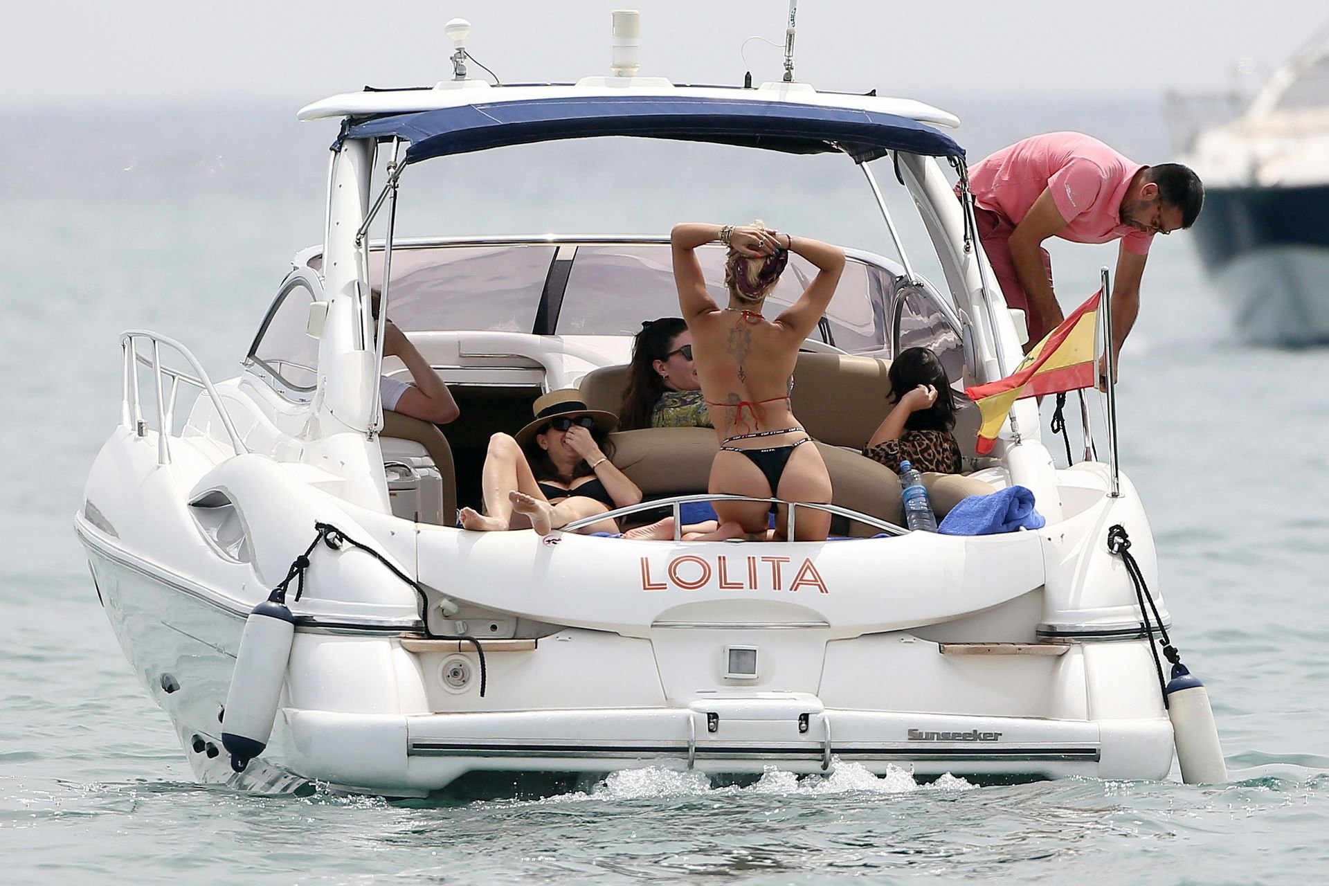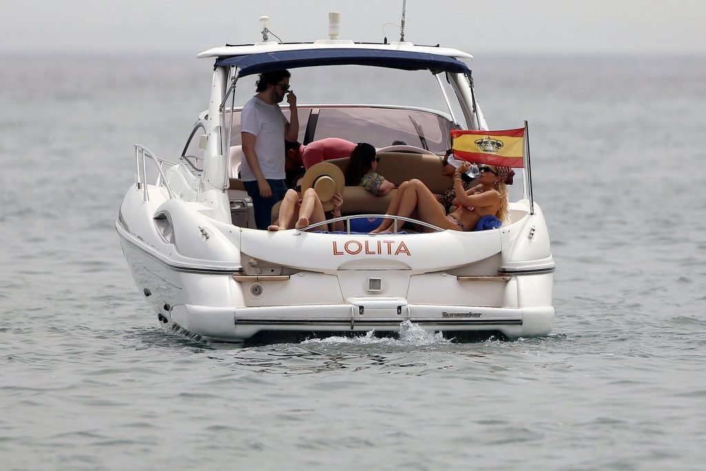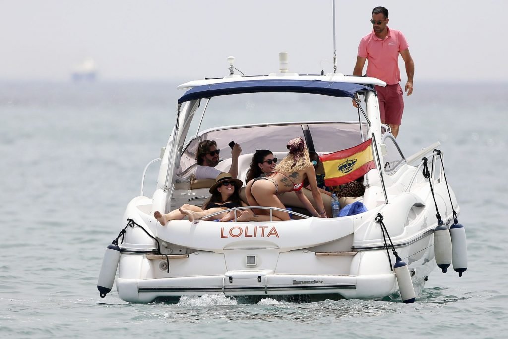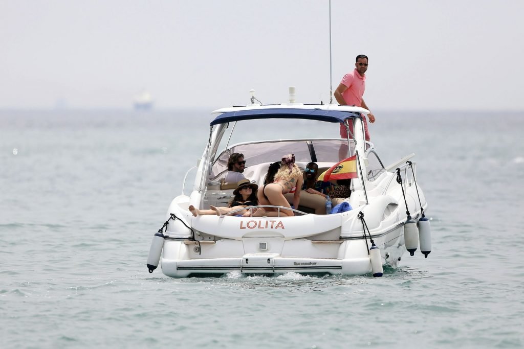 Британская певица Рита Ора и её друзья были сфотографированы на лодке в Ибице, 08/07/2019. Рита была в крошечных плавках White Fox, позируя во всей красе. Лодка называлась “Лолита”.