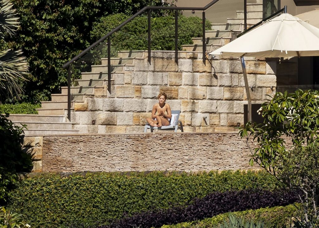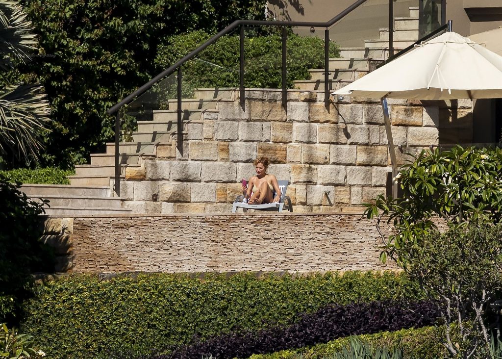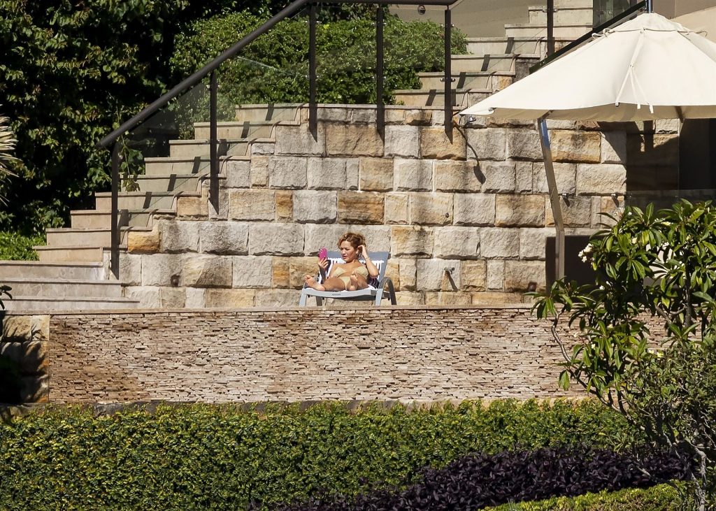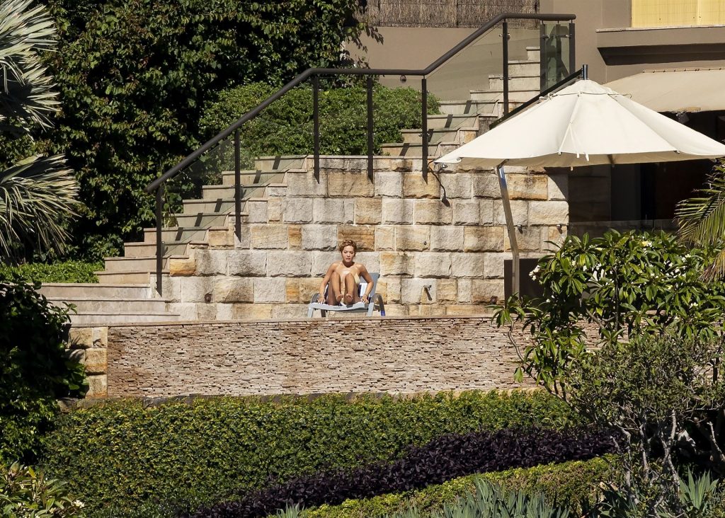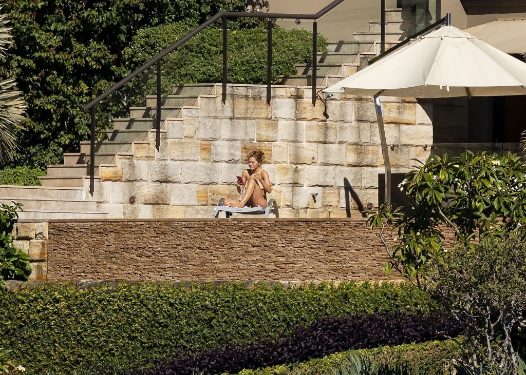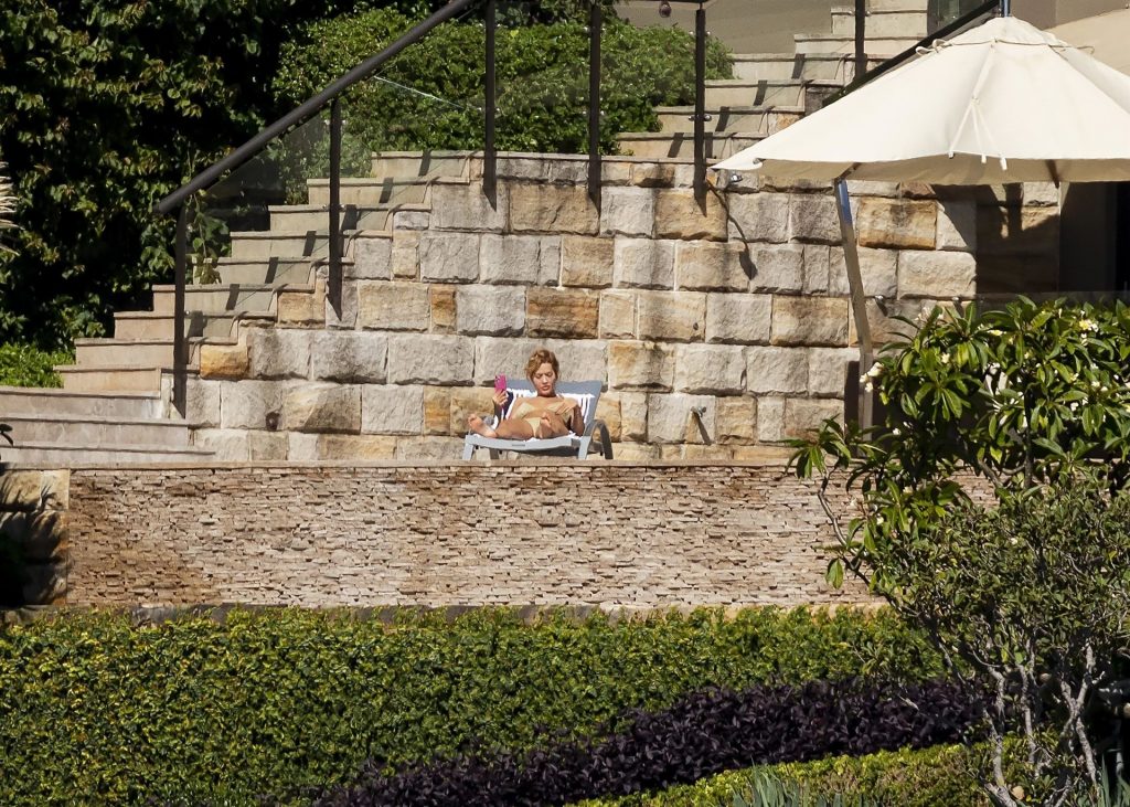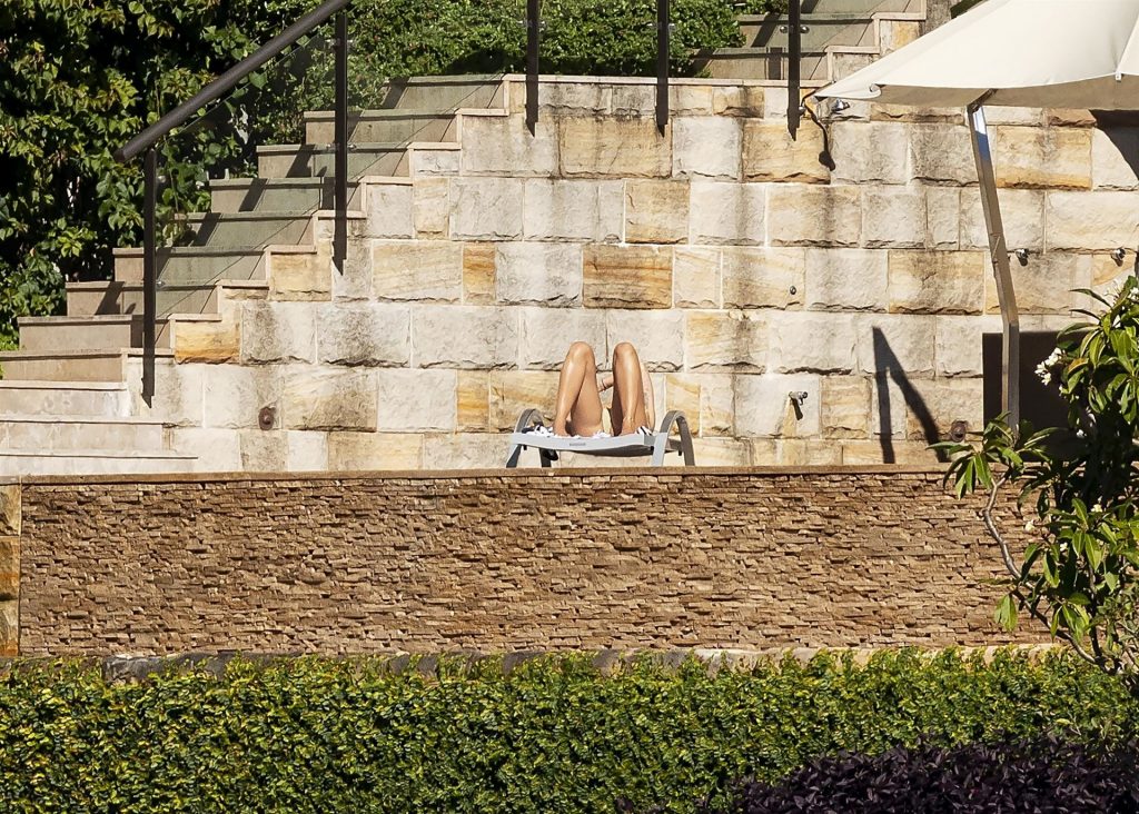 Певица Рита Ора запечатлена загорающей на террасе своего особняка в Сиднее, пока она здесь снимается для The Voice Australia, 31.03.2021.