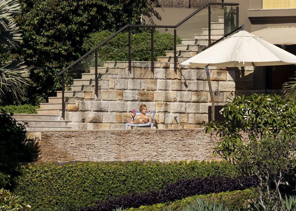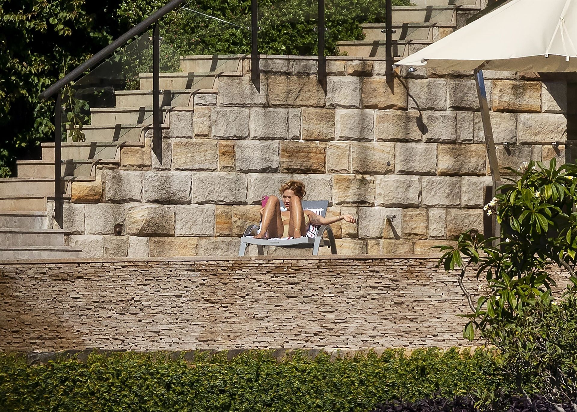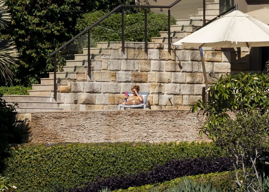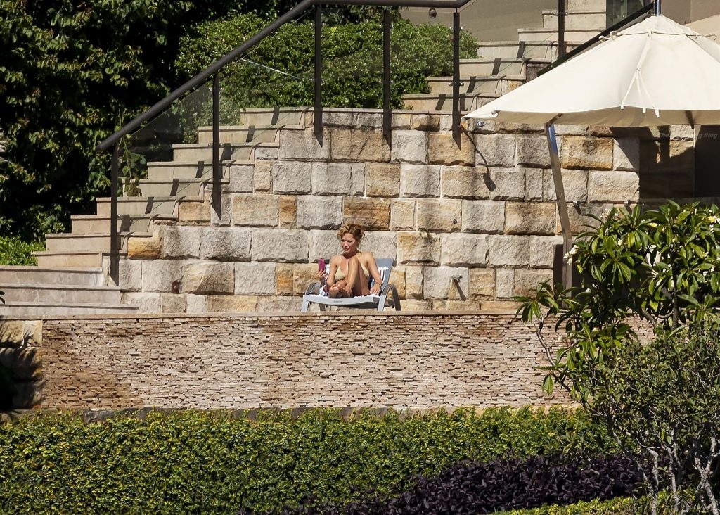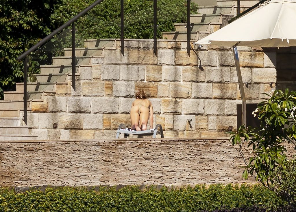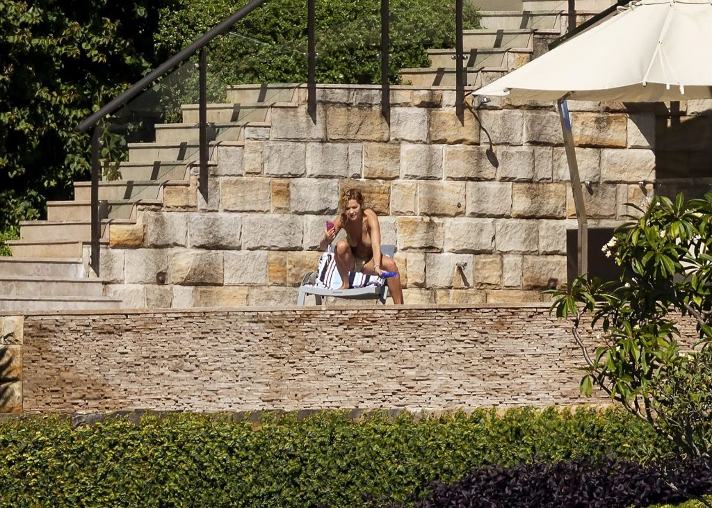 Певица Рита Ора запечатлена загорающей на террасе своего особняка в Сиднее, пока она здесь снимается для The Voice Australia, 31.03.2021.