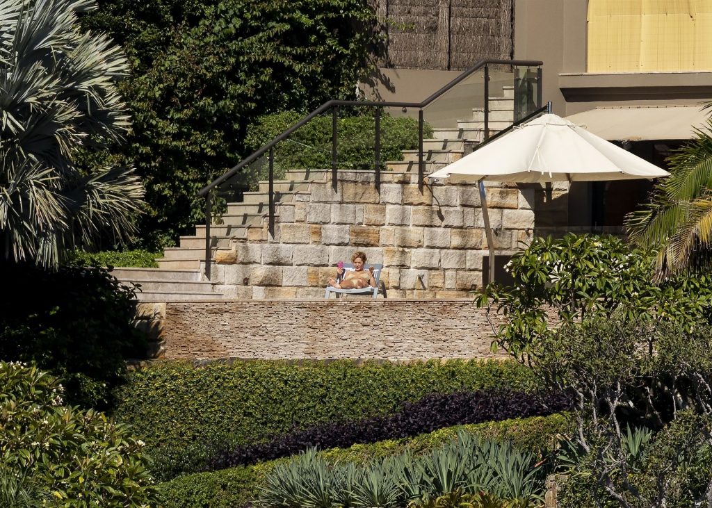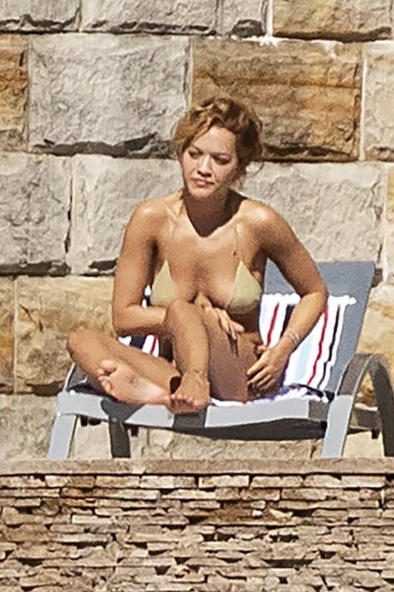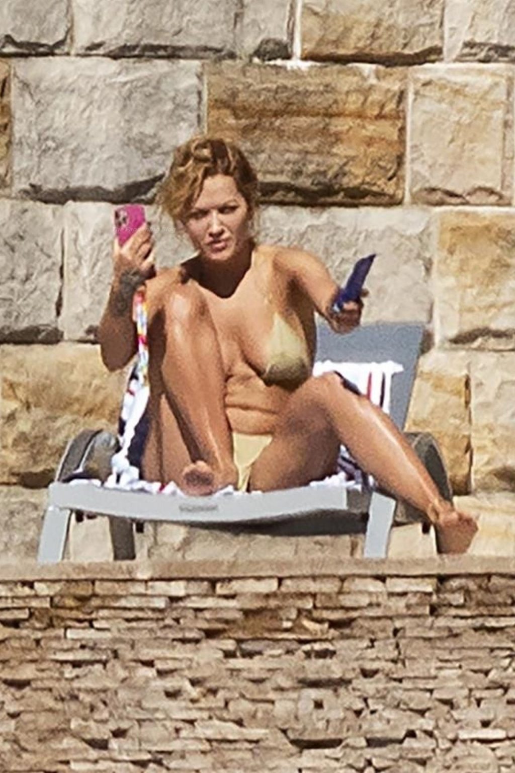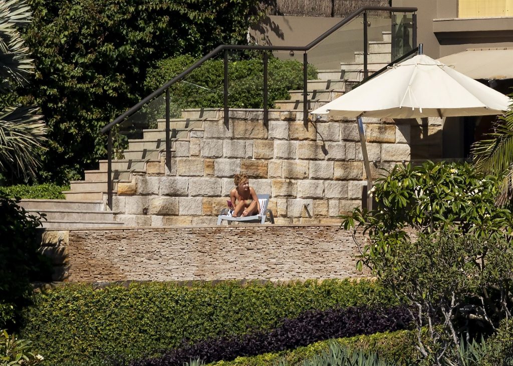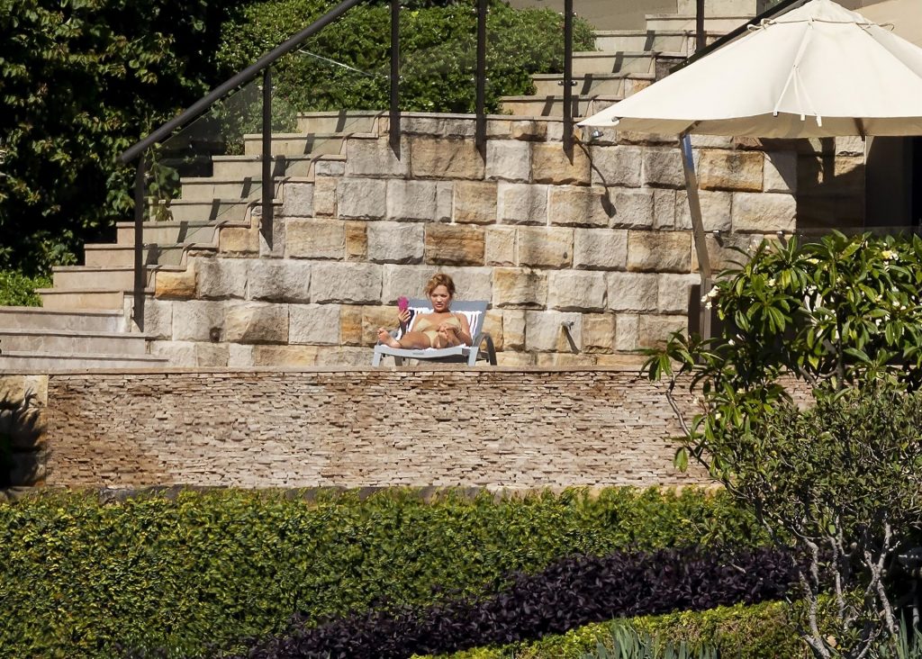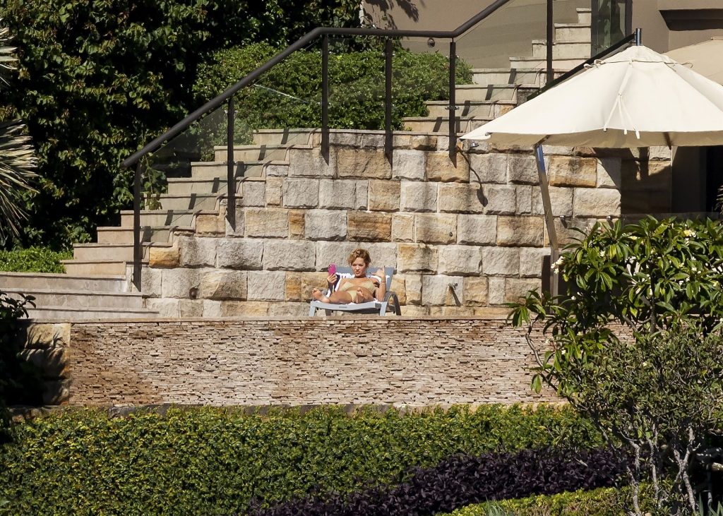 Певица Рита Ора запечатлена загорающей на террасе своего особняка в Сиднее, пока она здесь снимается для The Voice Australia, 31.03.2021.