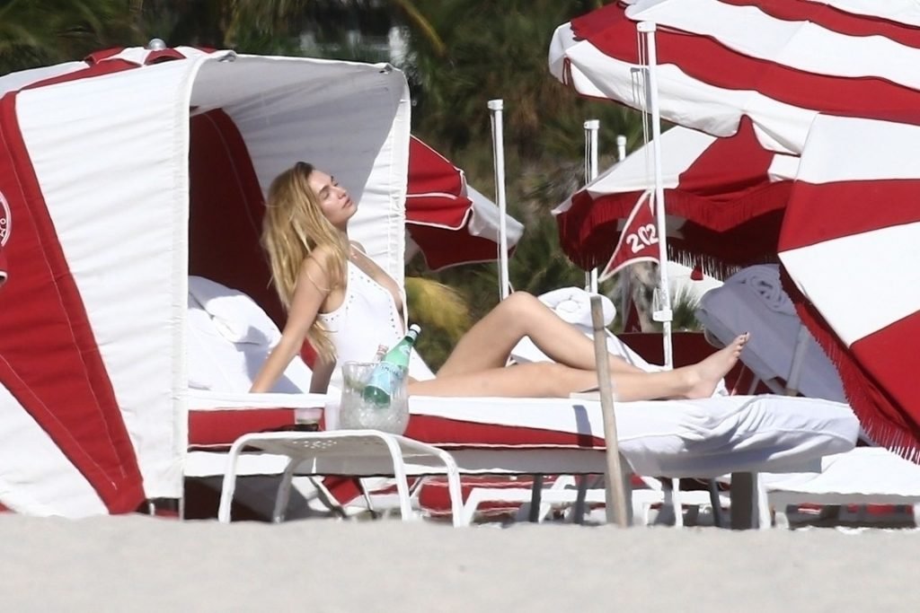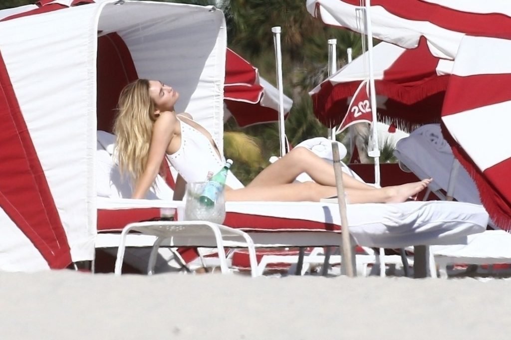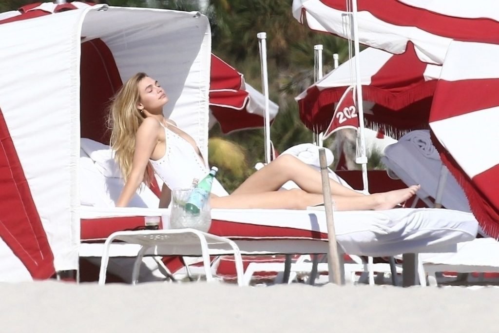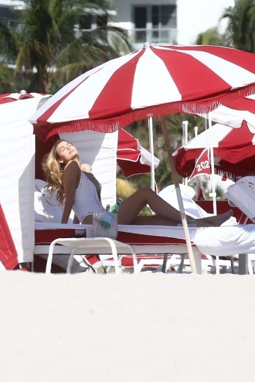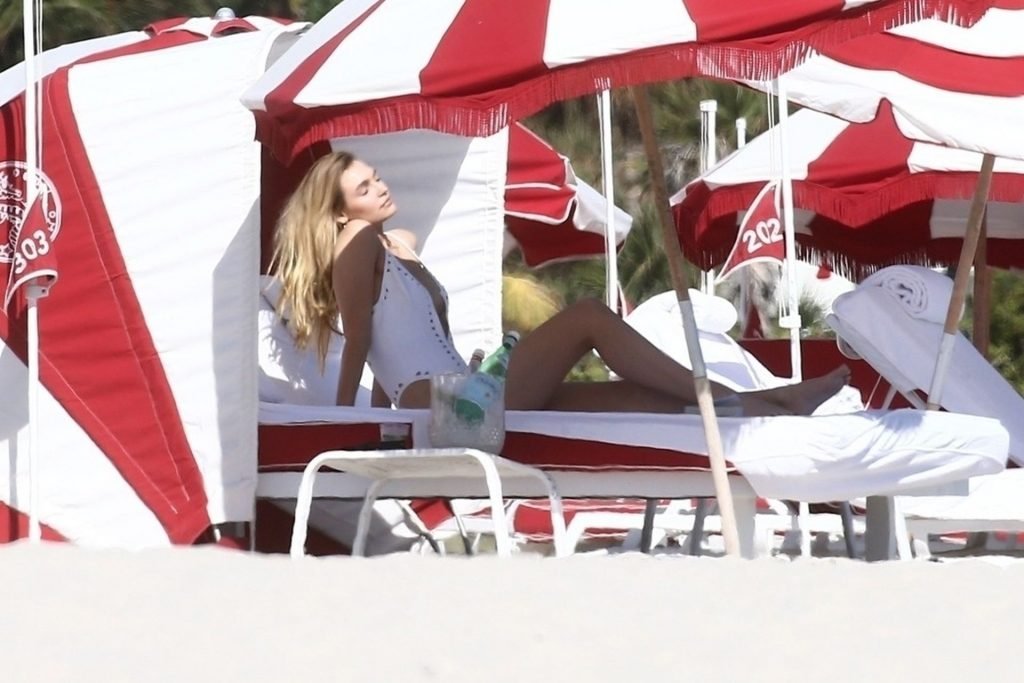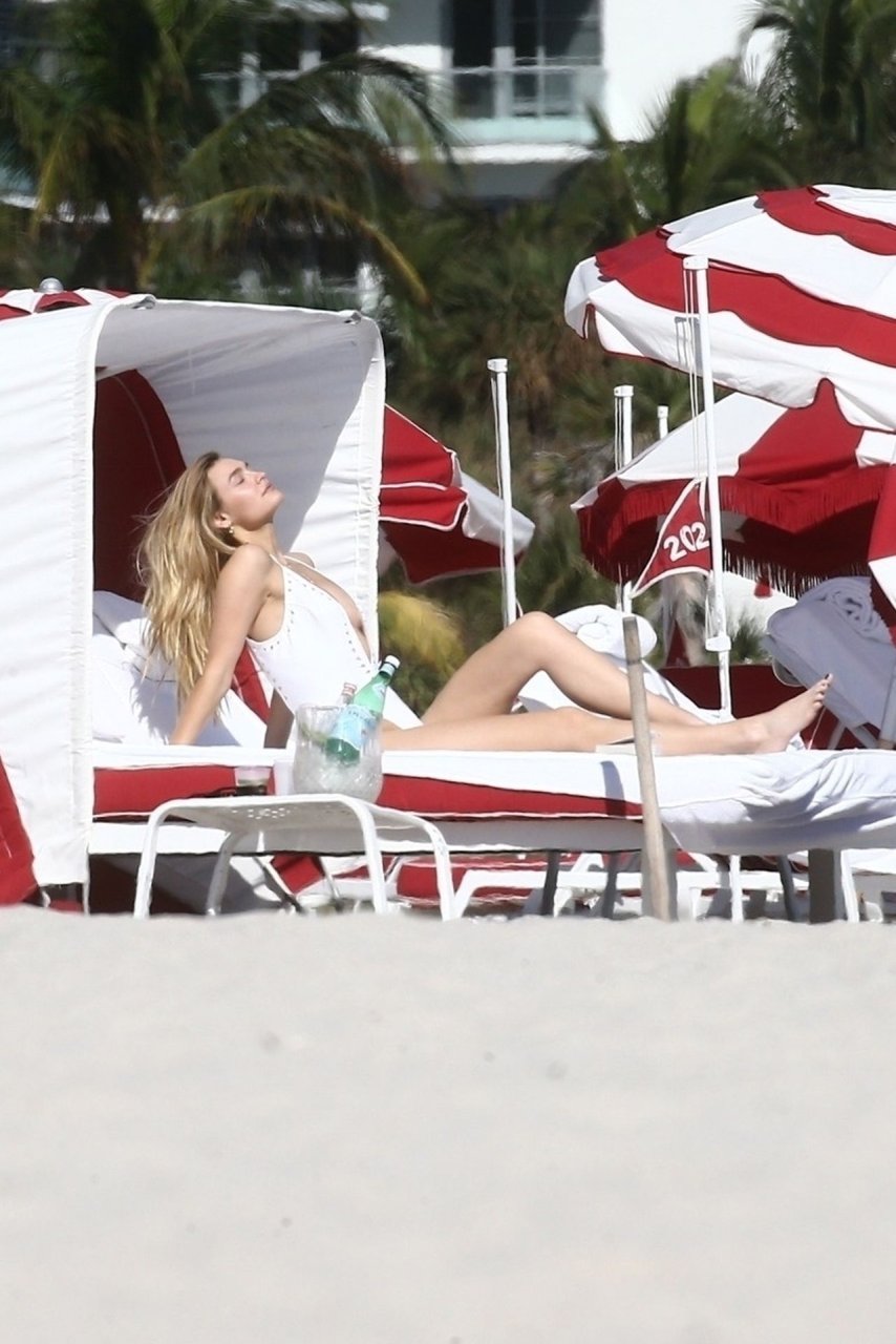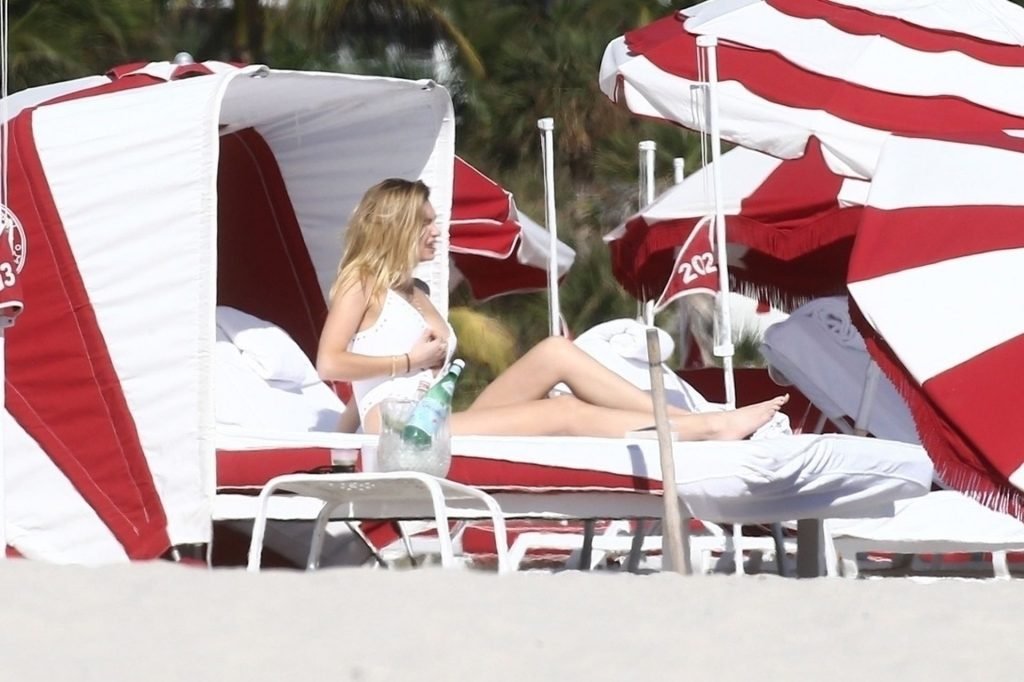 Victoria’s Secret Angel Roosmarijn de Kok (24) наслаждается днем на пляже в Майами, 01/06/2019. Roosmarijn (Roos) отлично выглядит в белом цельном купальнике, загорая и наслаждаясь морем и солнцем.