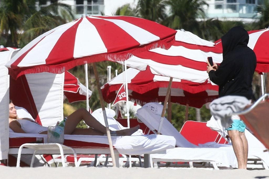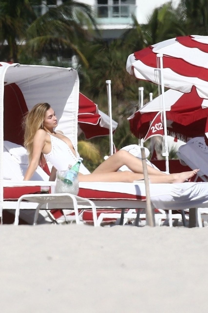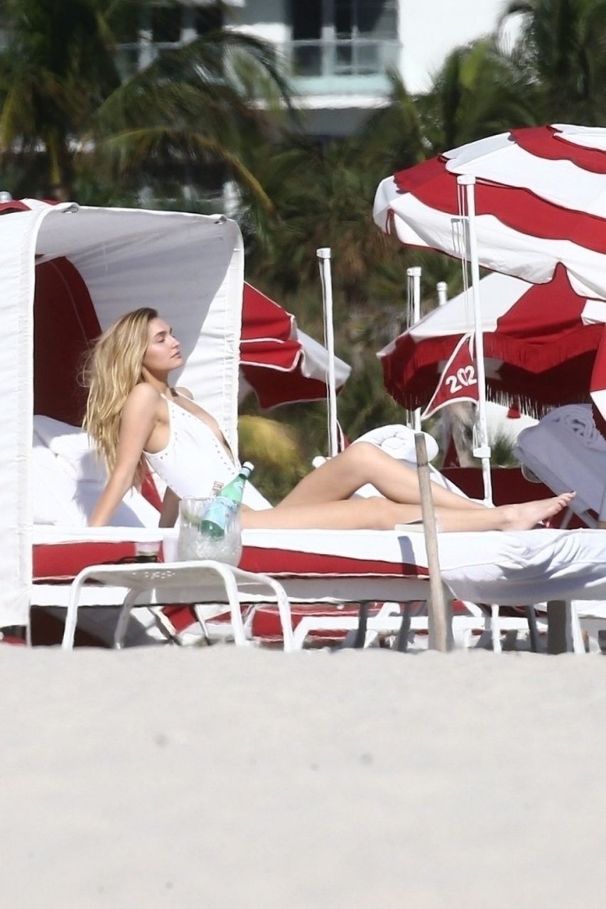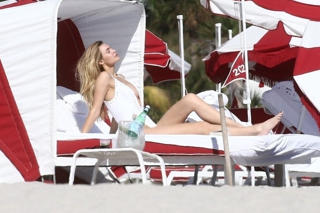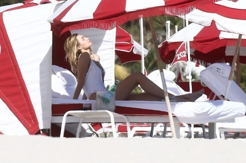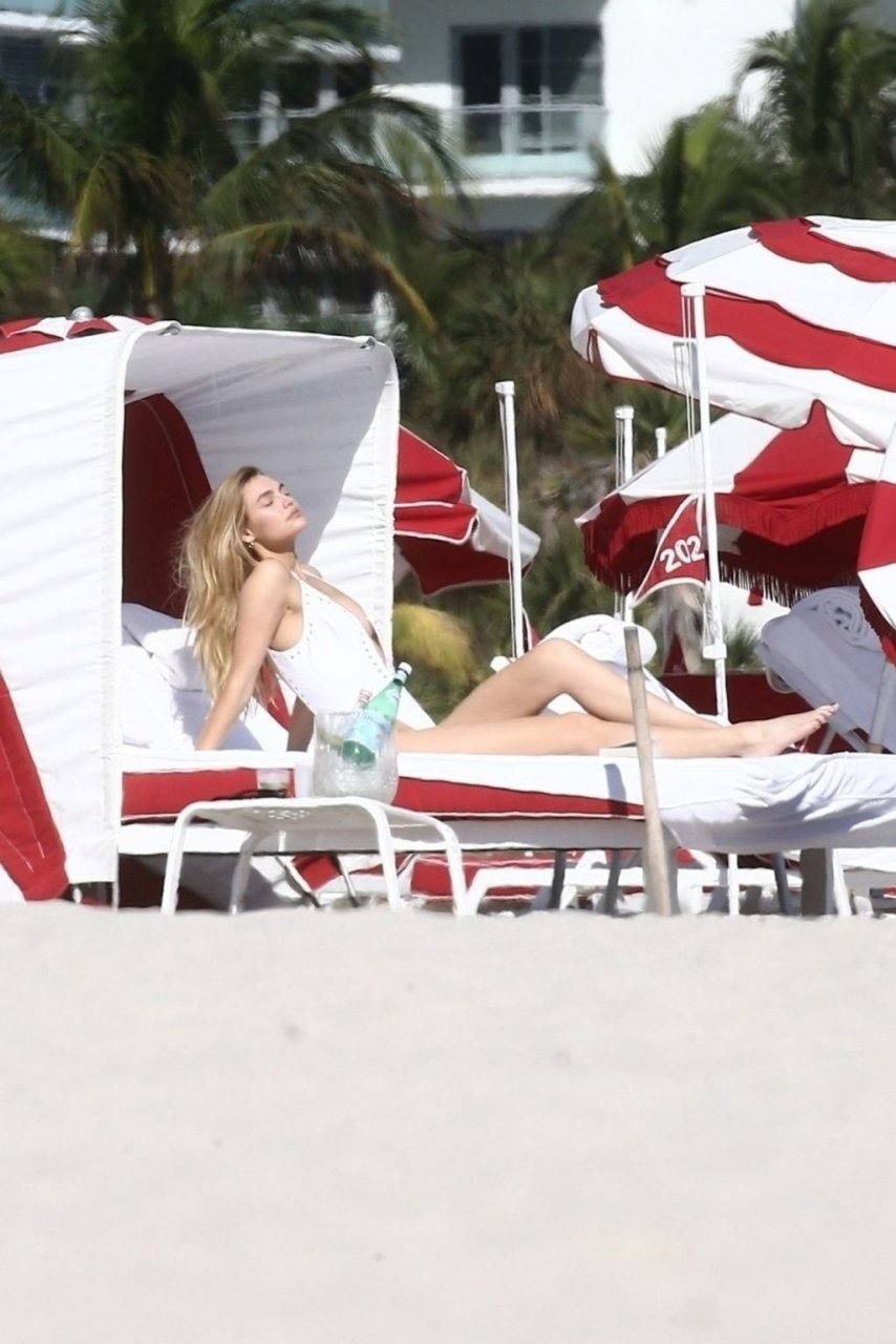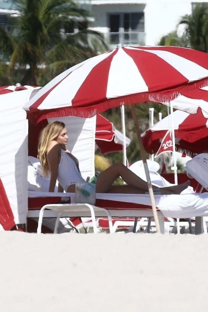 Victoria’s Secret Angel Roosmarijn de Kok (24) наслаждается днем на пляже в Майами, 01/06/2019. Roosmarijn (Roos) отлично выглядит в белом цельном купальнике, загорая и наслаждаясь морем и солнцем.