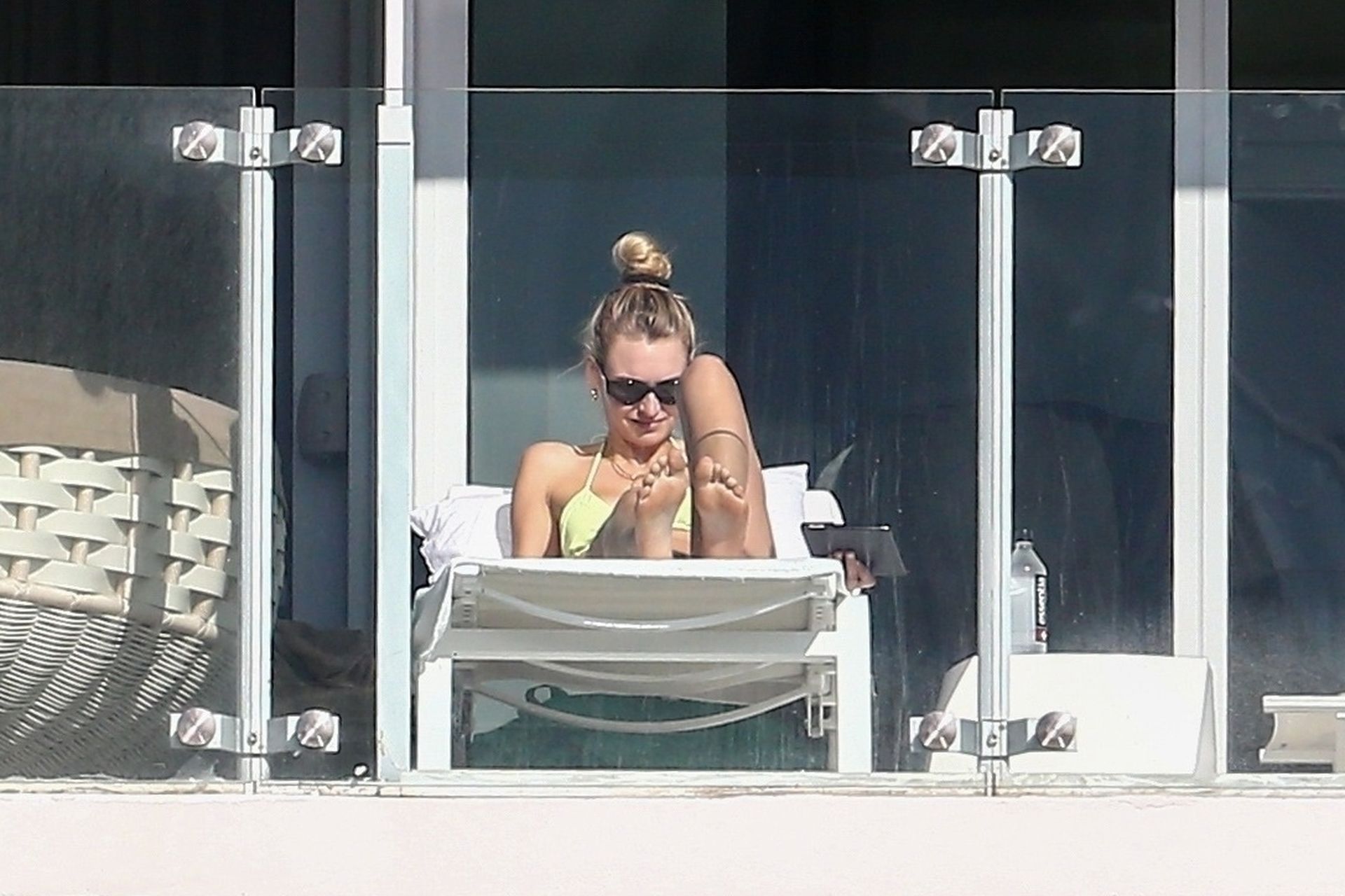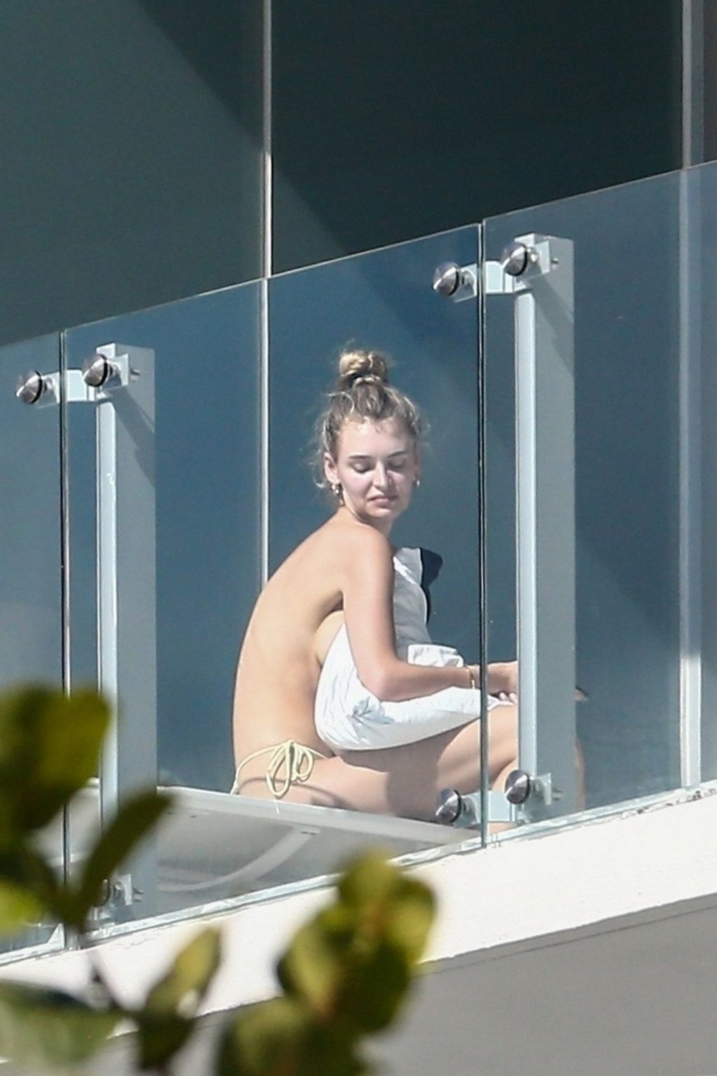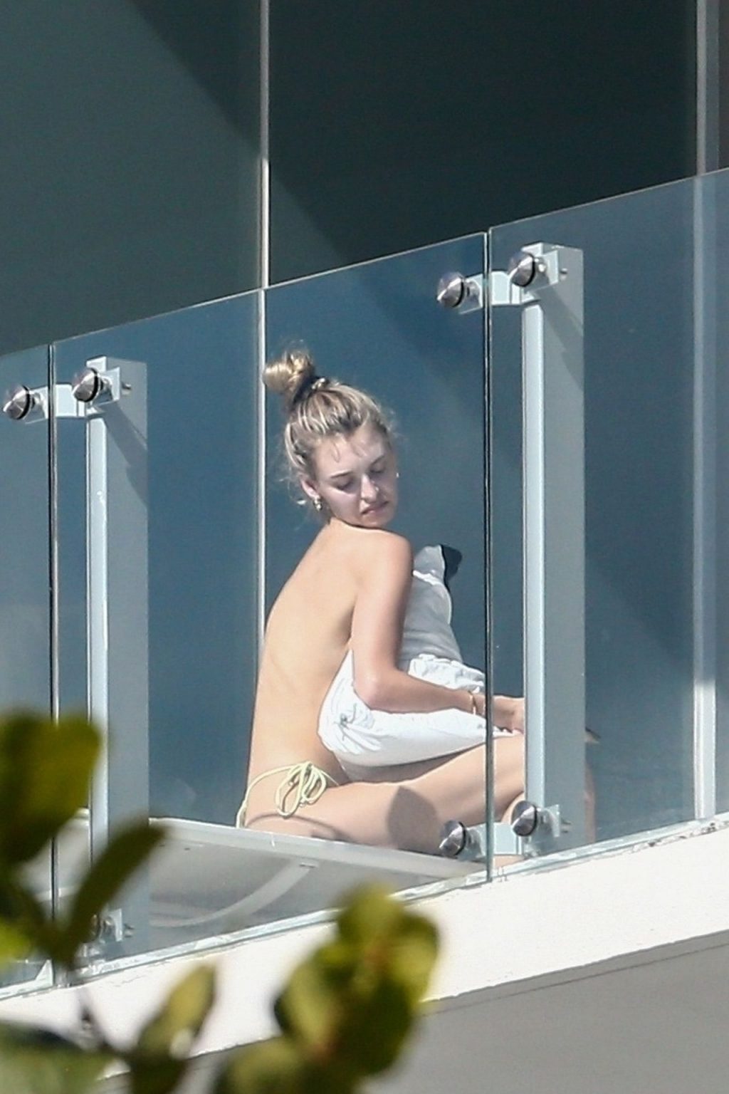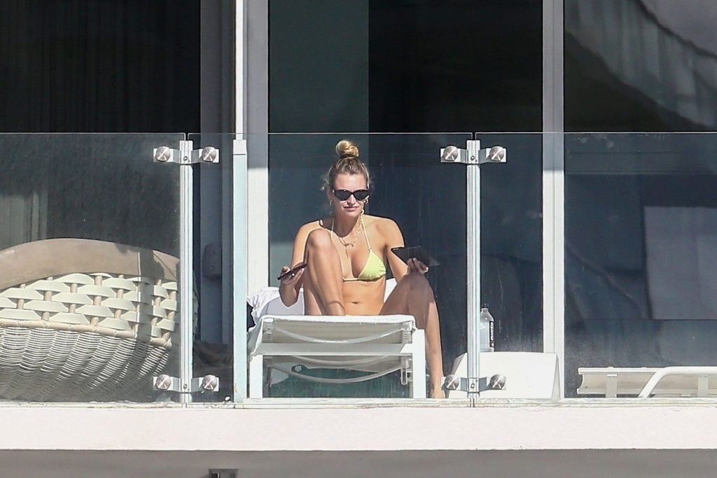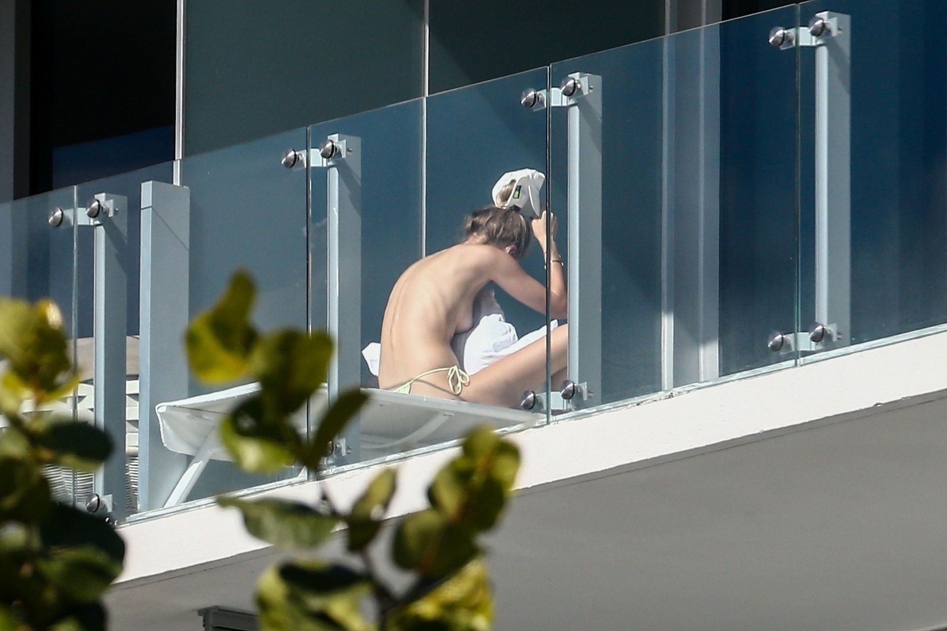 Голландская модель Роосмарийн де Кок использует время изоляции и солнечную погоду, загорая на балконе в Майами, 04/02/2020.