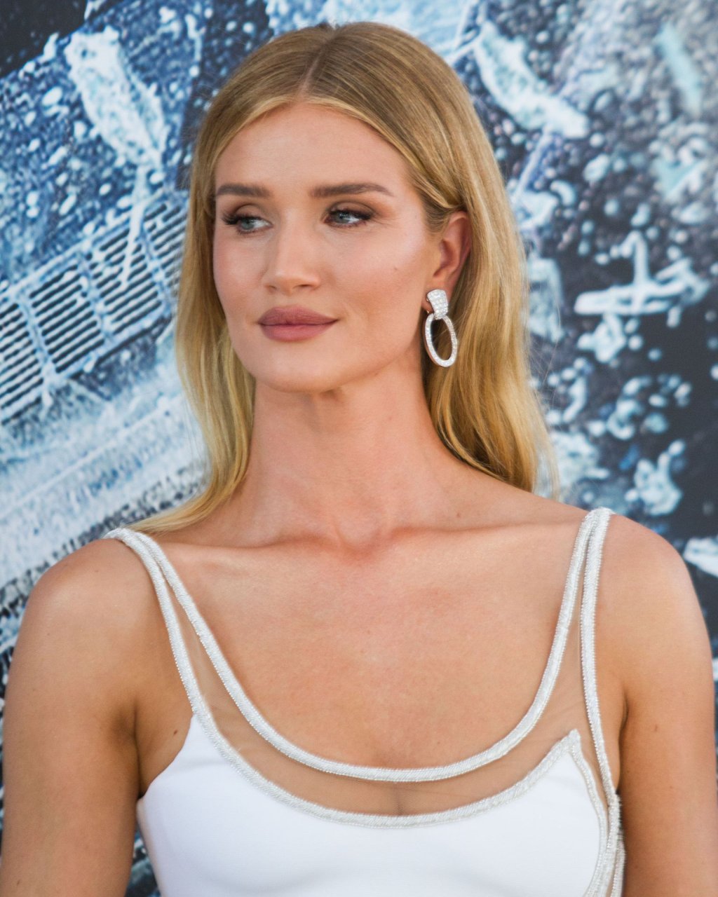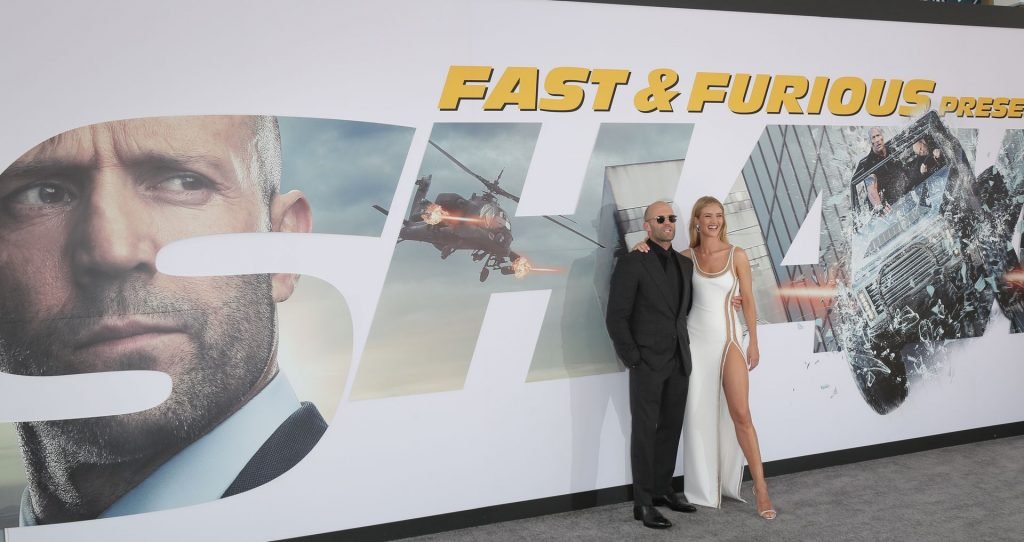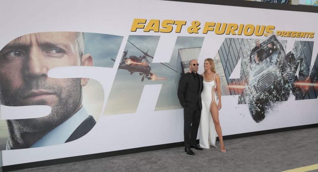 Рози Хантингтон-Уайтли прибывает с Джейсоном Стэтхэмом на премьеру фильма Universal Pictures «Форсаж: Хоббс и Шоу» в Dolby Theatre в Голливуде, 13.07.2019. Модель продемонстрировала свои сексуальные ноги в облегающем белом платье.