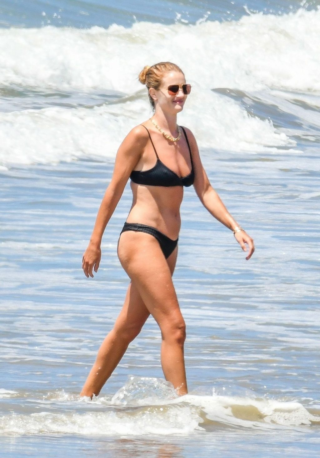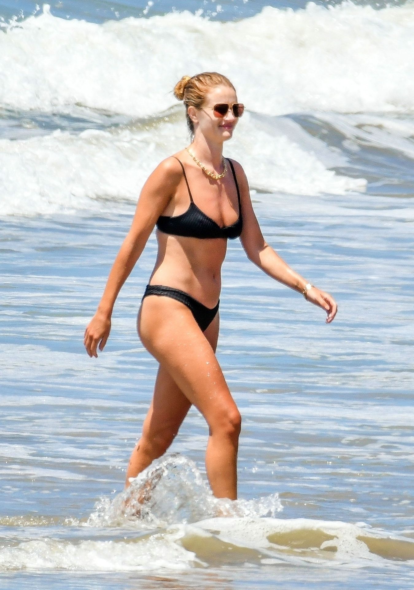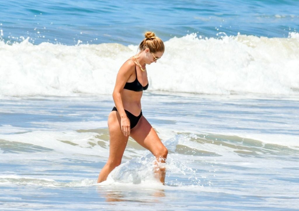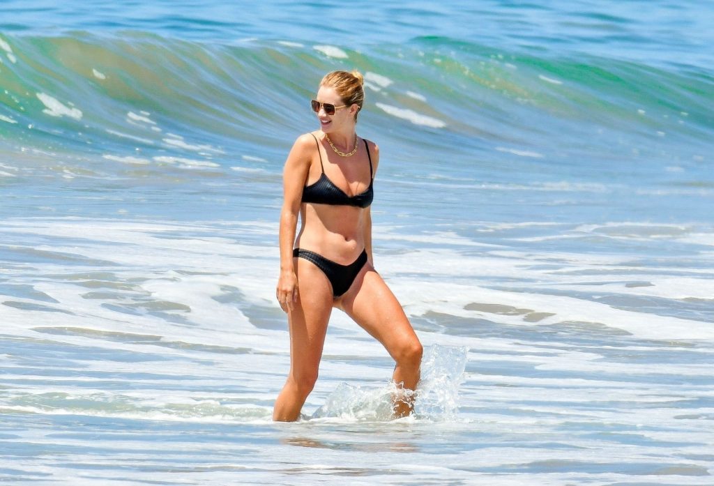 Английская модель и актриса Рози Хантингтон-Уайтли демонстрирует свое потрясающее пляжное тело в черном бикини, наслаждаясь днем на пляже в Малибу, 14.06.2020. Актриса из “Трансформеров” выглядела расслабленной, плескаясь в море и показывая свою завидную фигуру в бикини.