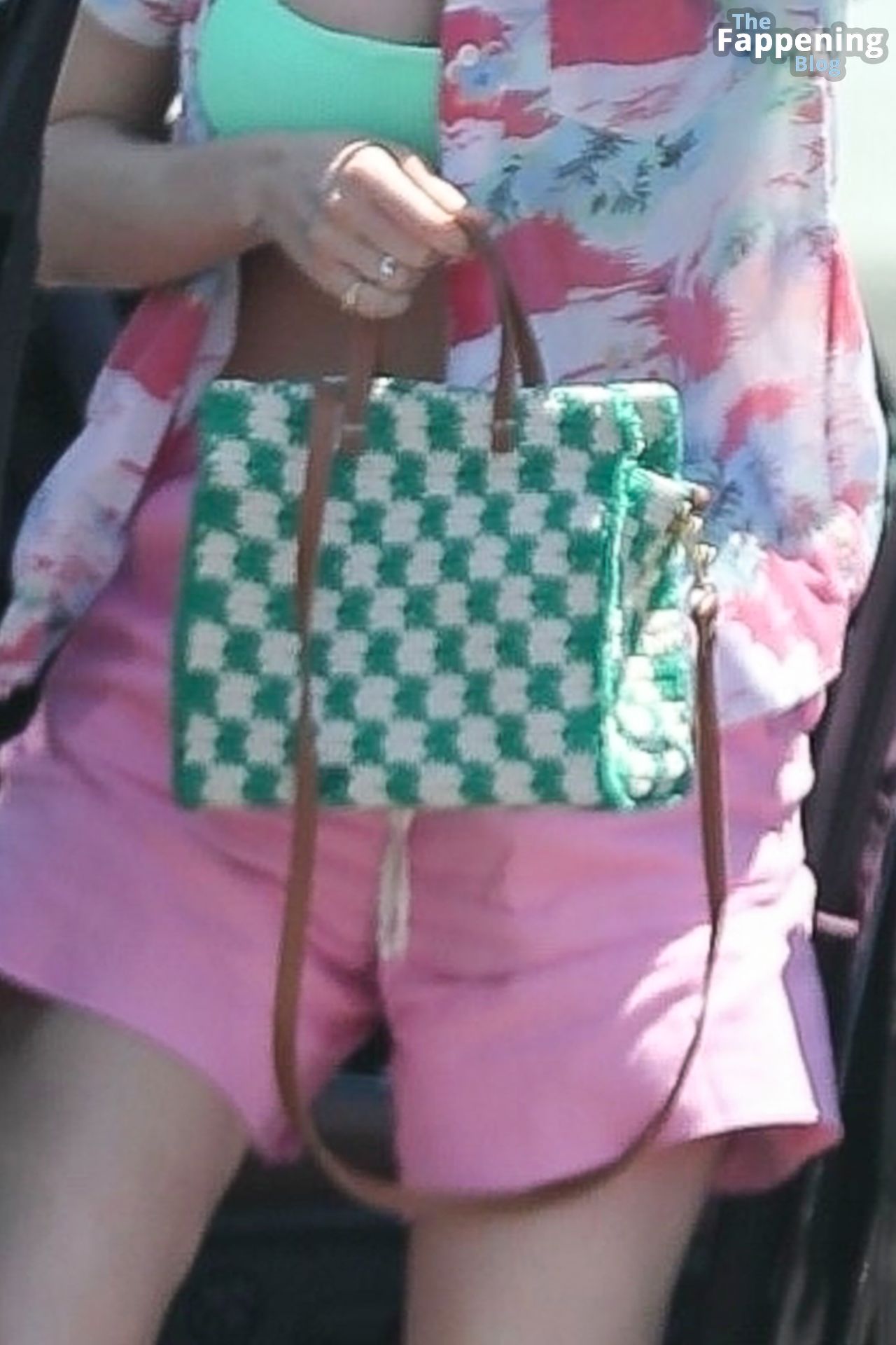 Новая мама Румер Уиллис выглядит стильно в розовых шортах в сочетании с подходящей рубашкой и зеленой клетчатой сумкой, когда она берет с собой полезный смузи, гуляя с малышом, 12.08.2023.