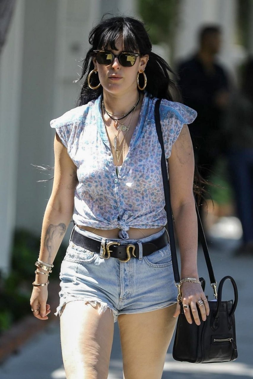 Актриса и певица Румер Уиллис выглядит сексуально и стильно, демонстрируя свои новые черные накладные волосы в Вест-Голливуде, 10.04.2019. Актриса в коротких джинсовых шортах подчеркивает свои длинные ноги и обнаженный живот.