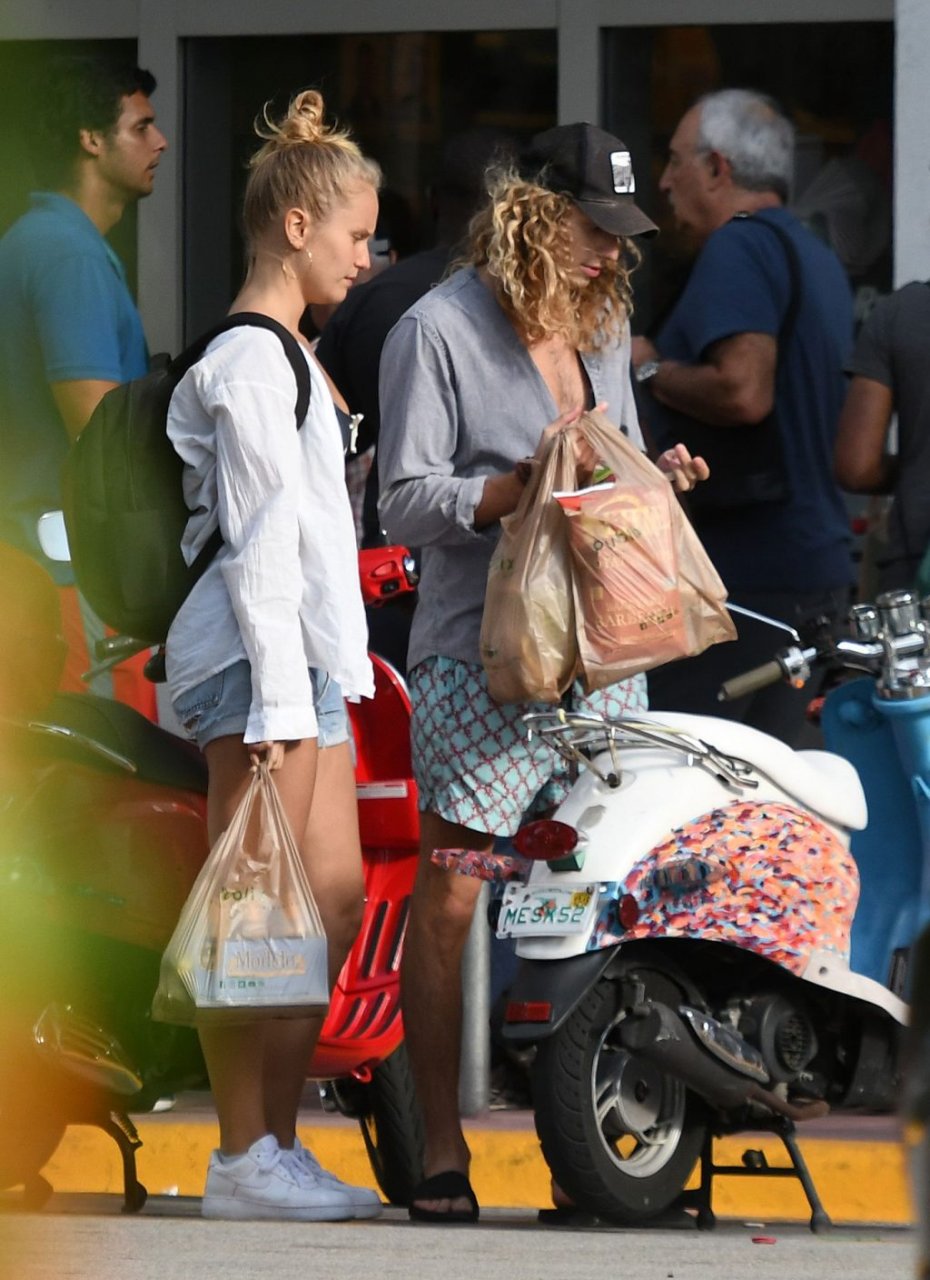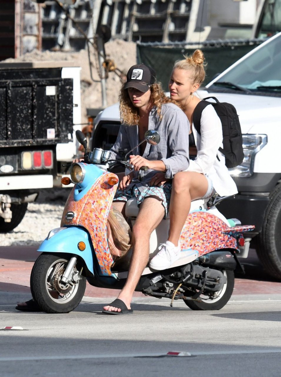Модель Сейлор Бринкли Кук в черном бикини катается на скутере с бойфрендом Беном Сосне по Майами-Бич, 29.04.2019.