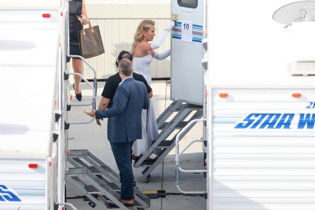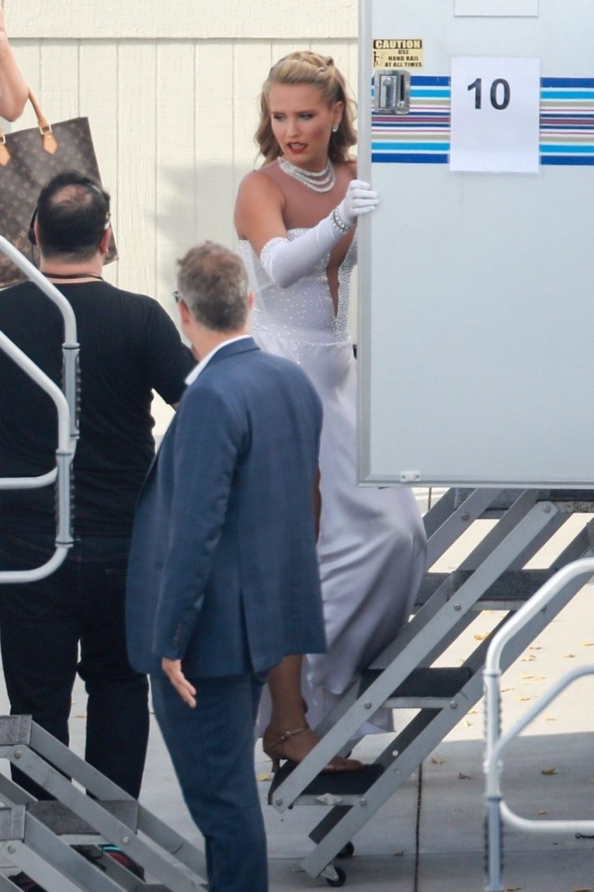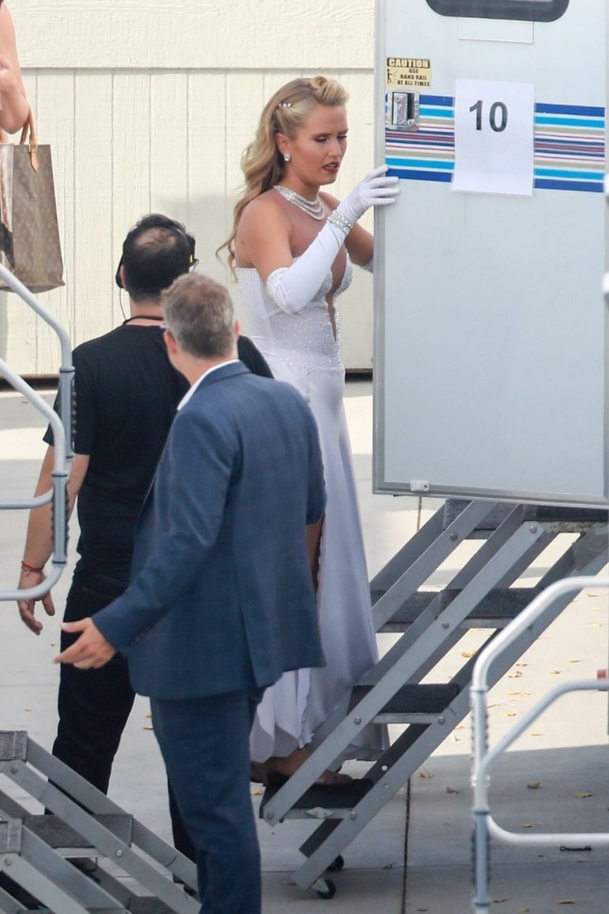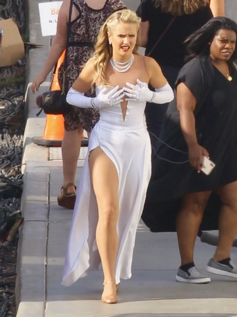 Актерский состав шоу “Танцы со звездами” готовится к своему первому живому эфиру в Лос-Анджелесе, 16.09.2019. Сейлор Бринкли Кук была сфотографирована в белом платье с глубоким декольте.