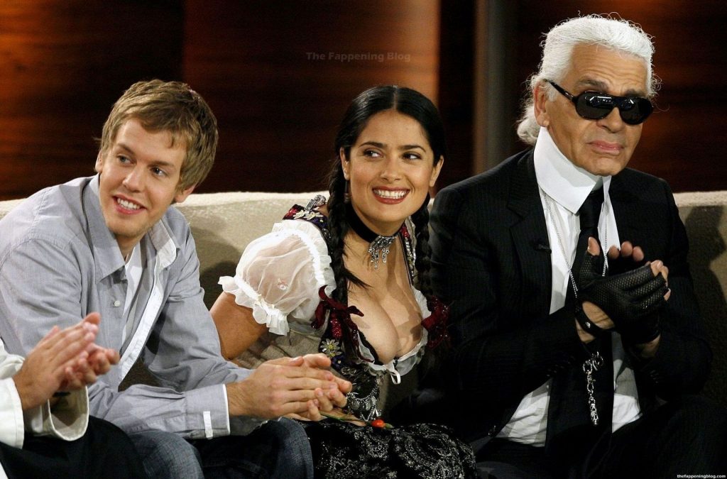 If you thought that was all you were going to see of Salma Hayek’s tits, you were wrong! Our charming busty Mexican beauty made an appearance on the show called “Bet that..?”. This was filmed in Nuremberg, Germany, way back in 2008. You can even see that next to her was, now late, Karl Lagerfeld.