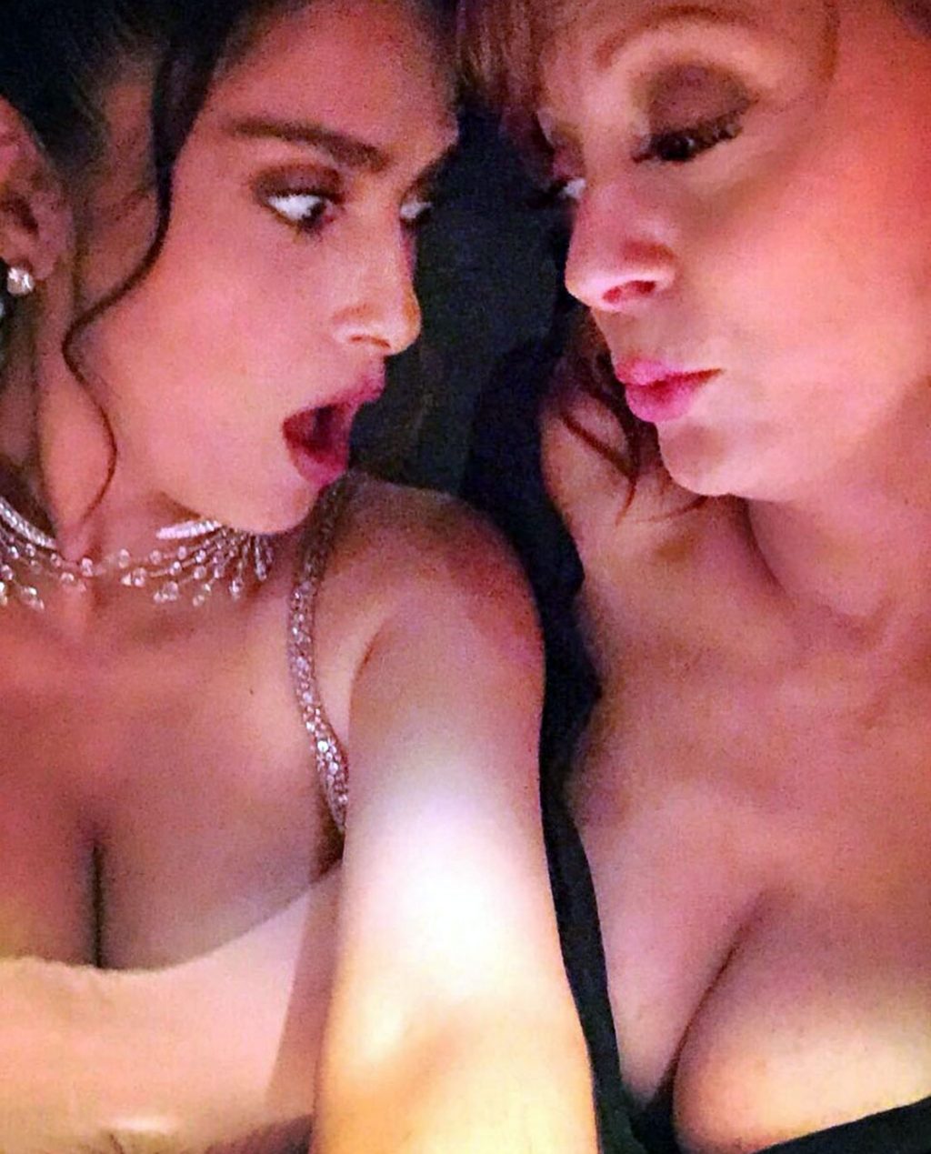 Do you know that old picture where a brunette is checking out blonde’s big tits? Well, Salma Hayek and her friend Susan Sarandon made a similar photo! The two girls made a selfie while hilariously comparing the other’s chest size! The photo was taken in Cannes in May of 2016!