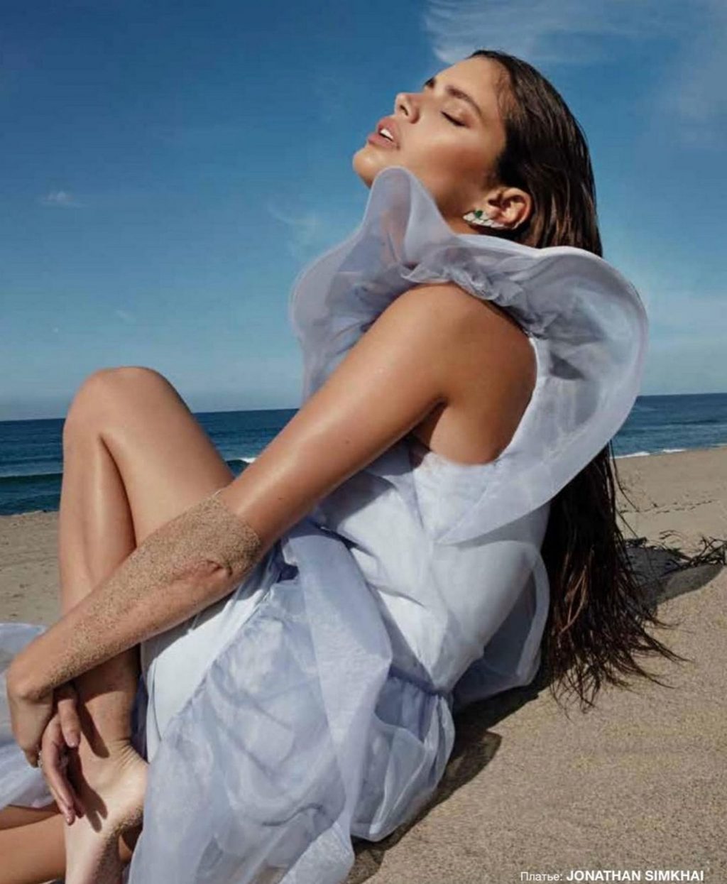 Модель поражает на пляже как один из элементов, демонстрируя своё тело в синем бикини и красивых платьях.