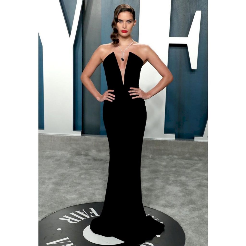 Модель Сара Сампайо выглядит горячо без бюстгальтера, демонстрируя красивые груди (декольте) в сексуальном черном платье с глубоким вырезом на вечеринке Vanity Fair Oscar в Беверли-Хиллз, 09.02.2020.