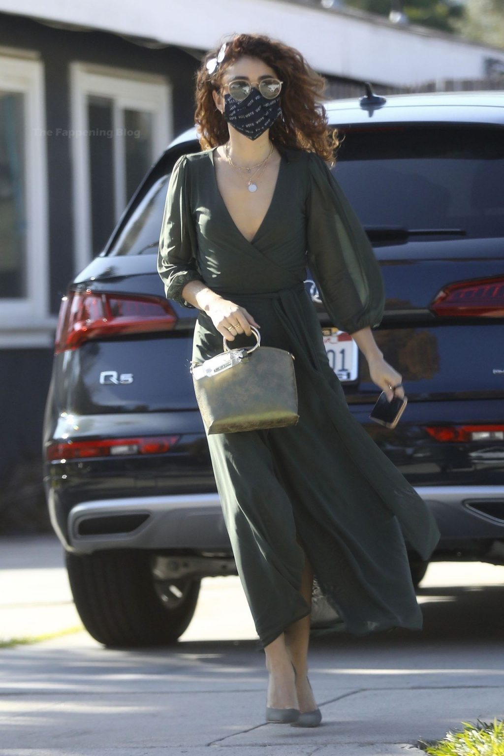 Выпускница Современной семьи выглядела элегантно без бюстгальтера в оливковом платье с запахом и замшевых туфлях на каблуке. Сара дополнила образ беретом с бабочкой и зеленой сумочкой с золотой ручкой, к которой удобно прикрепила антисептик для рук. Актриса позаботилась о безопасности, надев маску Vote от MASKC.