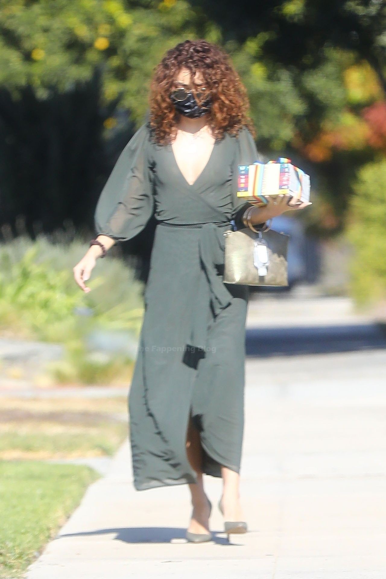 Выпускница Современной семьи выглядела элегантно без бюстгальтера в оливковом платье с запахом и замшевых туфлях на каблуке. Сара дополнила образ беретом с бабочкой и зеленой сумочкой с золотой ручкой, к которой удобно прикрепила антисептик для рук. Актриса позаботилась о безопасности, надев маску Vote от MASKC.