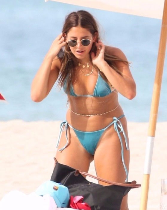 Звезда Премьер-лиги Хавьер Эрнандес и его потрясающая новая девушка Сара Кохан раздеваются во время фотосессии в бикини на пляже в Майами-Бич, Флорида, 19.07.2018. 24-летняя австралийская красавица сейчас отдыхает с нападающим Вест Хэма, который недавно играл за Мексику на Чемпионате мира по футболу 2018 года. Она продемонстрировала свои кокетливые загарные линии, снимая бикини во время переодевания.