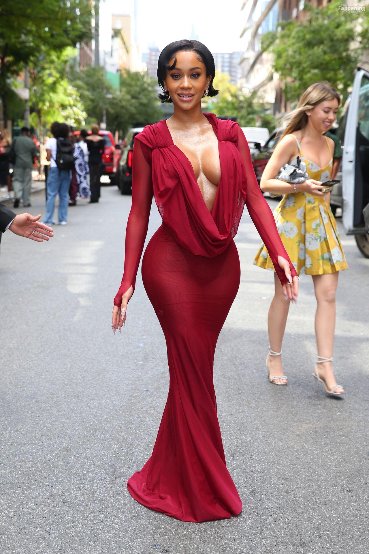 Saweetie полностью выложилась на NYFW, надев прозрачное красное платье, которое показывало всё — грудь и ягодицы были на полном показе. Она привлекала внимание возле Bronx & Banco в Нью-Йорке, не оставляя ничего для воображения.