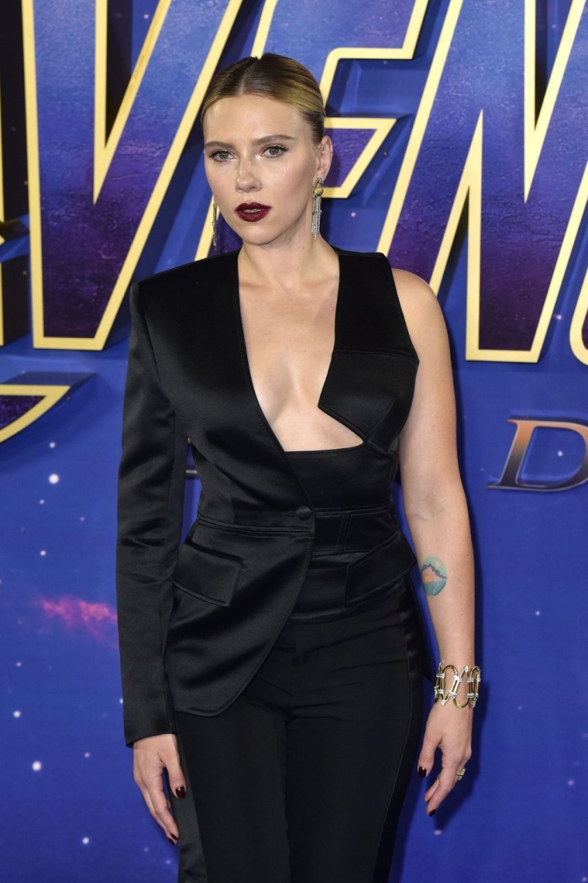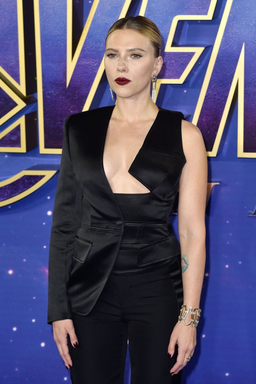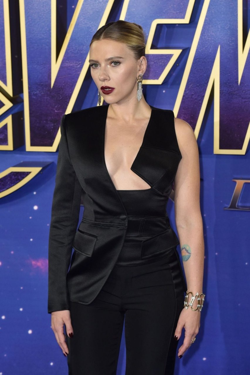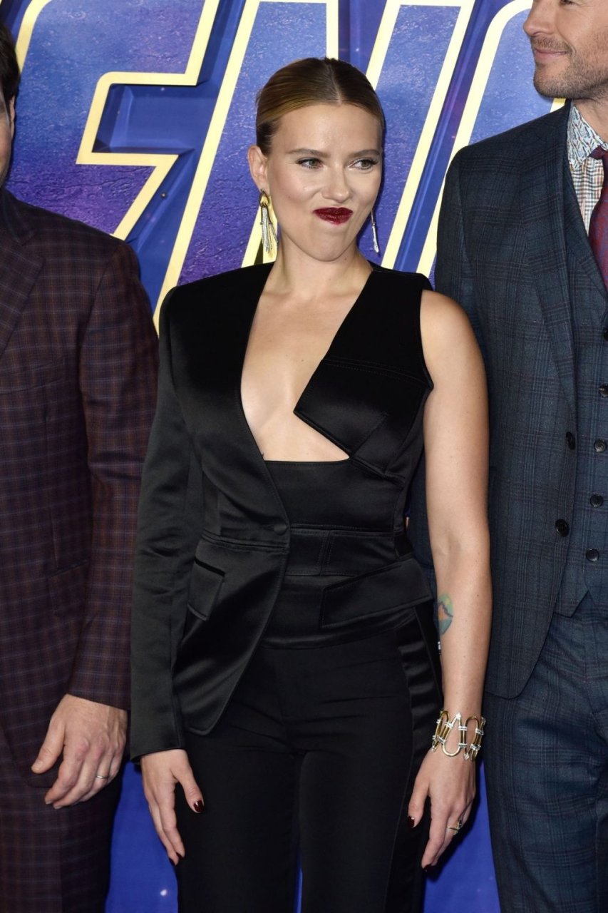 Без бюстгальтера Скарлетт Йоханссон посещает фотоколл на фанатском мероприятии “Мстители: Финал” в Picturehouse Central в Лондоне, 04/10/2019.