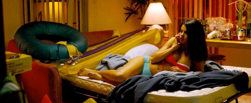 In the first scene, we see Selena Gomez, wearing an orange bikini top with the straps undone and green bikini bottoms while standing in a corridor and then sitting on a bed while chatting on the floor phone.
