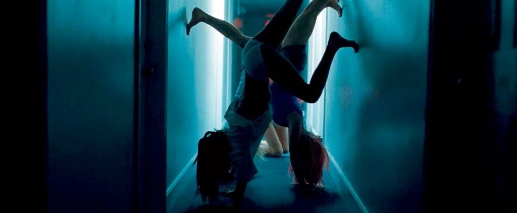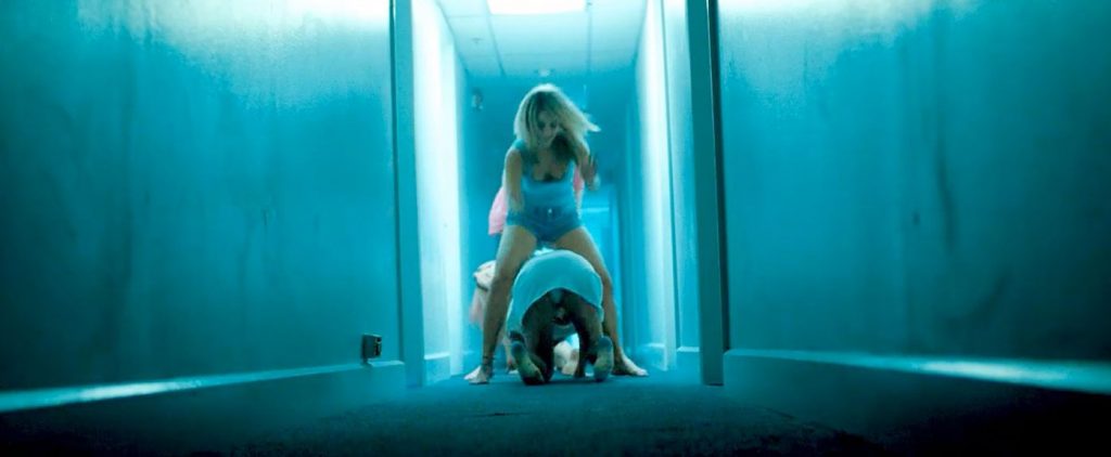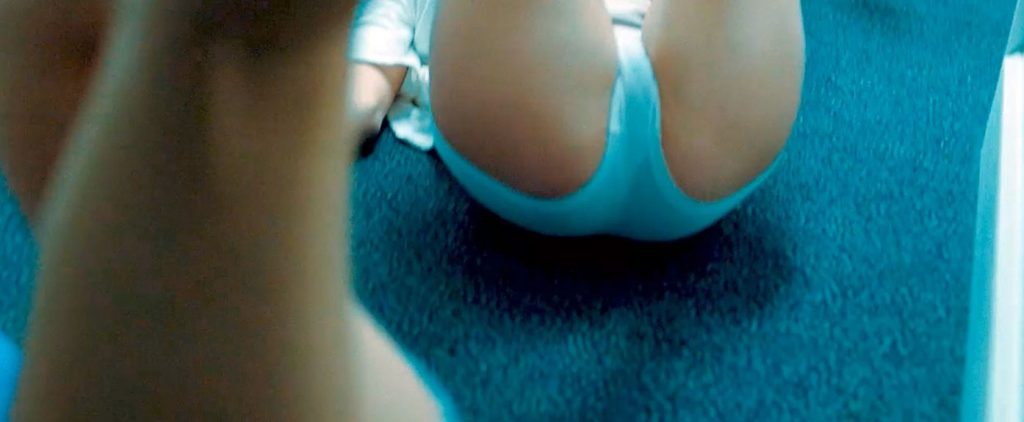 In the next scene, we see Selena Gomez as she crawls on the ground in a hallway, rolls around on her back laughing, and does handstands before running away with Vanessa Hudgens (in a blue top and some jean shorts), Ashley Benson (who was in a pink top, and some jean shorts as well), and Rachel Korine (the one with the pink hair) giving us several looks at her ass and in between her legs in white panties.