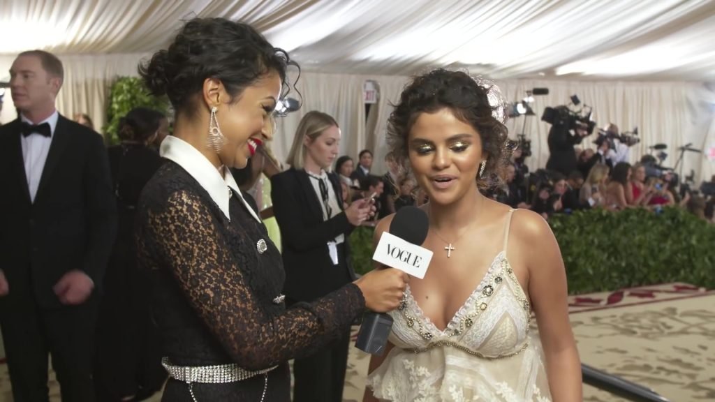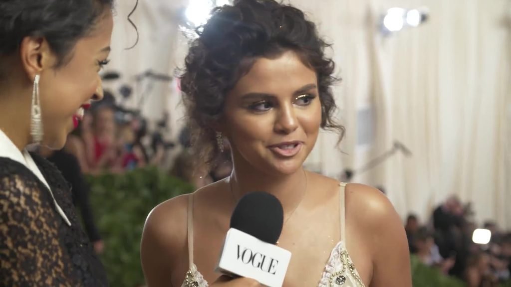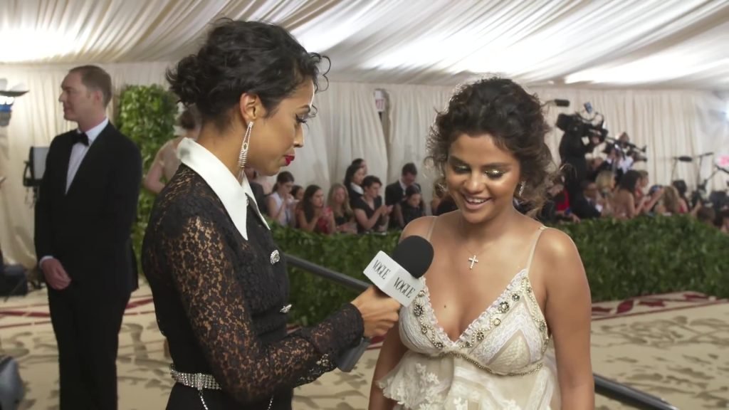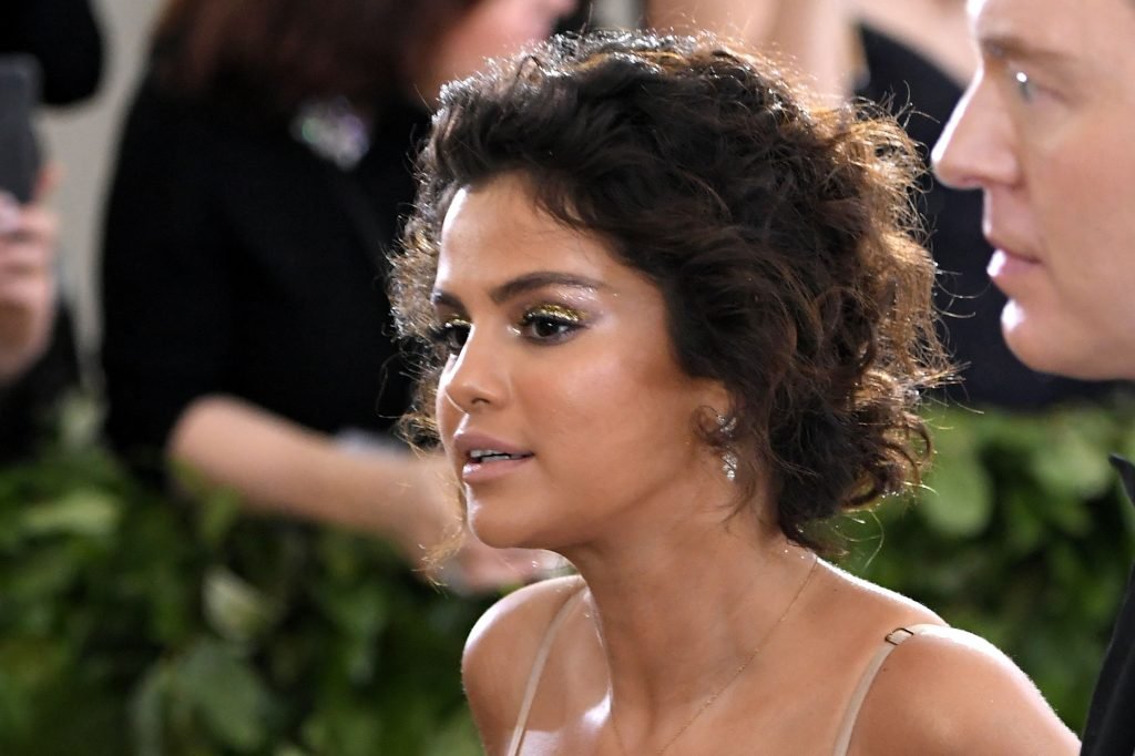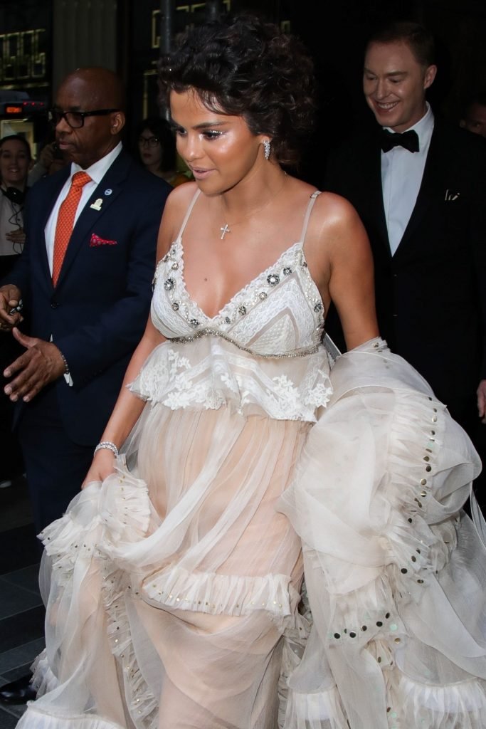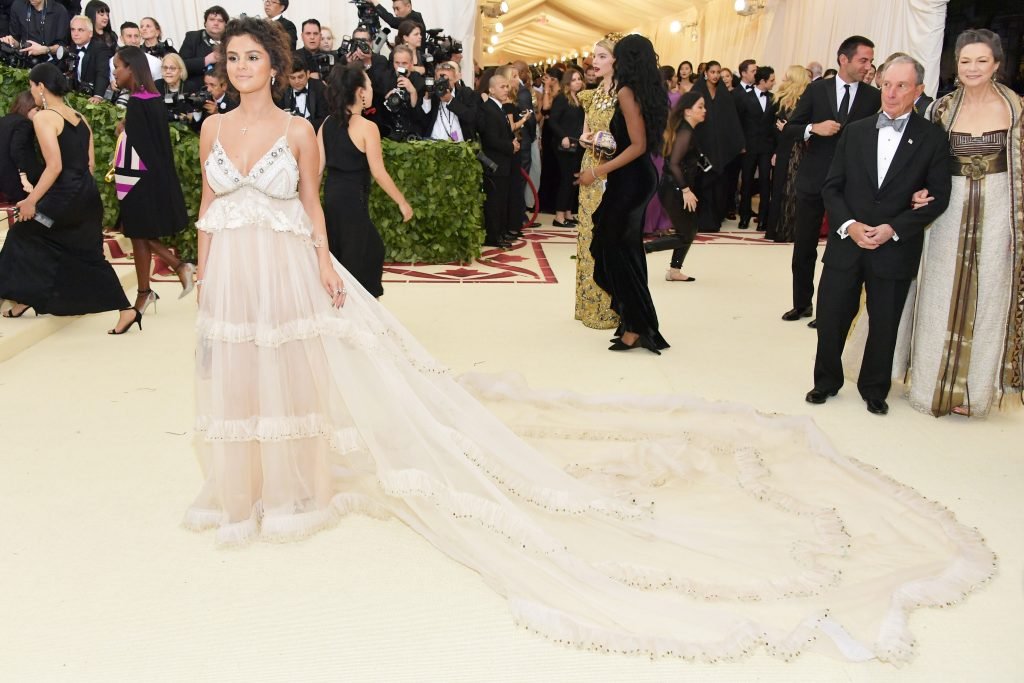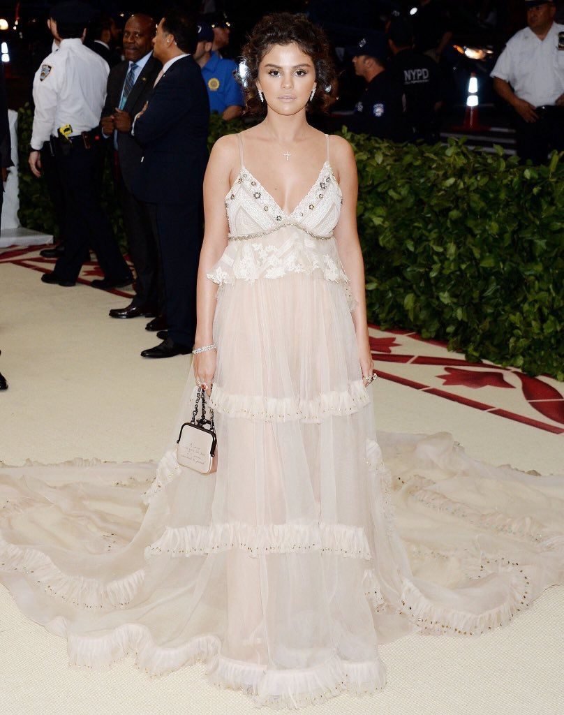 Певица и актриса Селена Гомес (25) в белом платье с глубоким декольте на Гала-вечере Института костюма 2018 года в Нью-Йорке, 07.05.2018. Слишком много загара и макияжа…