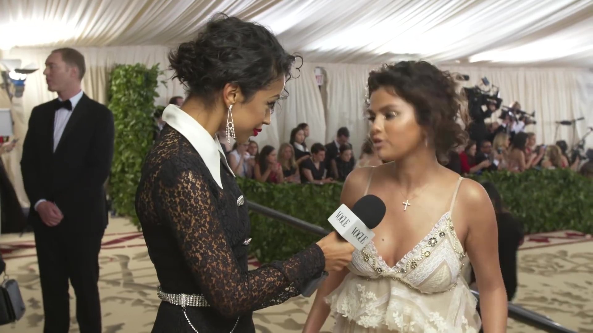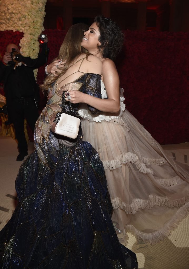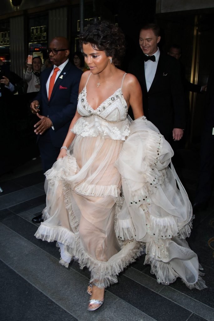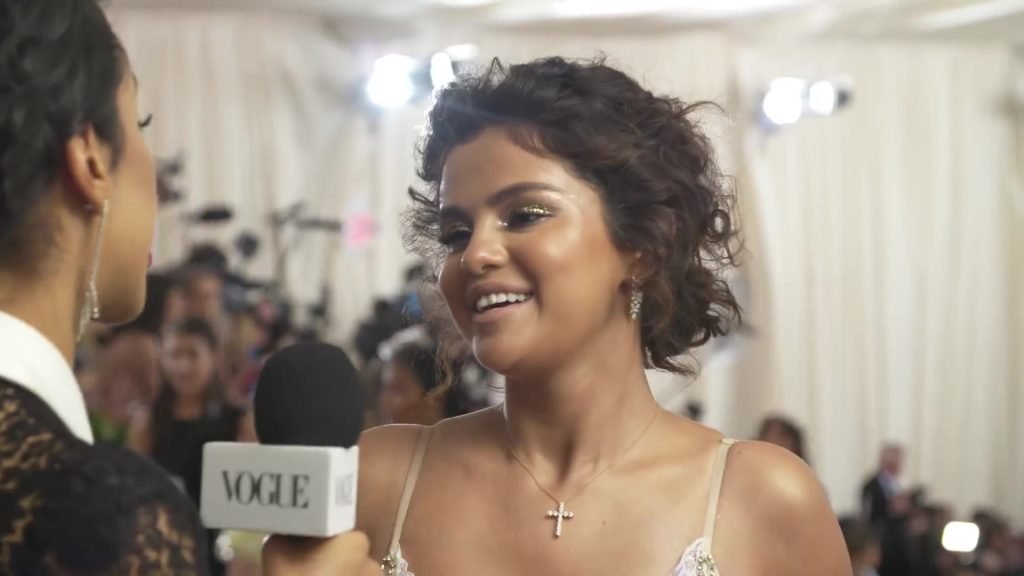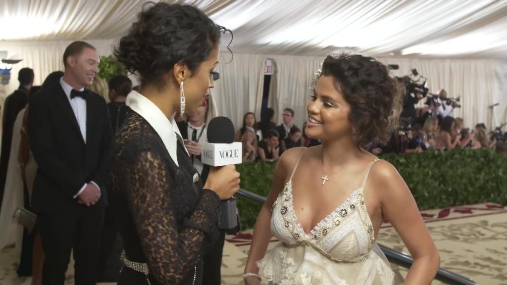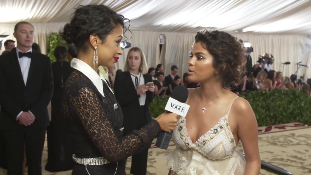 Певица и актриса Селена Гомес (25) в белом платье с глубоким декольте на Гала-вечере Института костюма 2018 года в Нью-Йорке, 07.05.2018. Слишком много загара и макияжа…