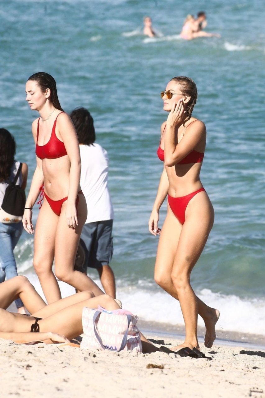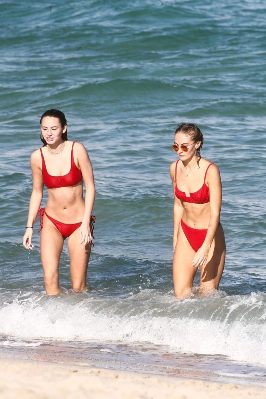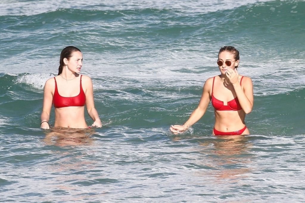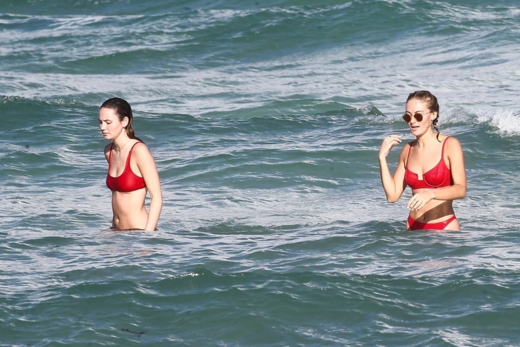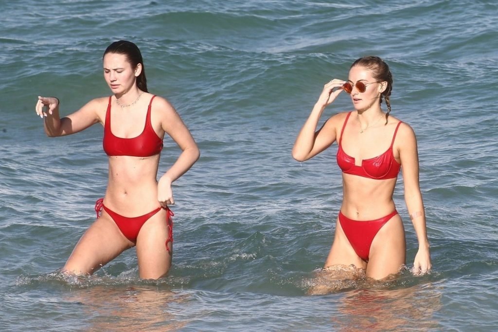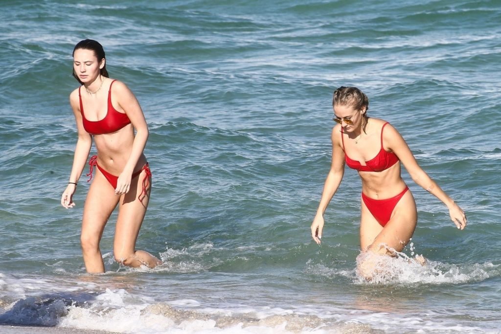 Instagram модель Селена Вебер и певица Лорен Эшли — красавицы в красных купальниках на пляже Майами, 30.10.2019. Девушки отдыхали на солнце, быстро окунулись в океан, а затем вернулись к своим шезлонгам.