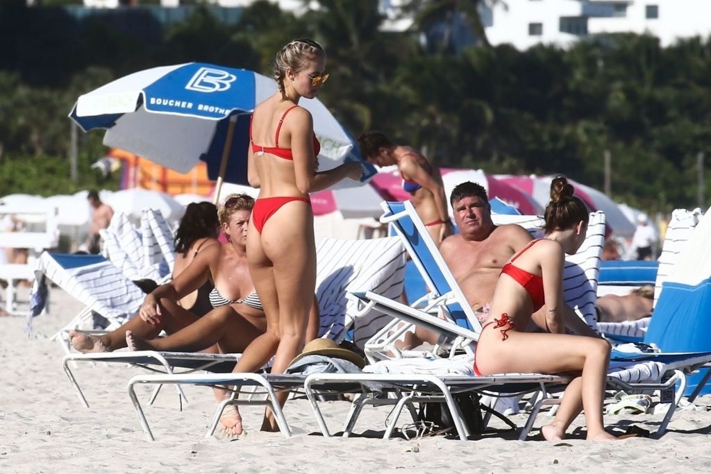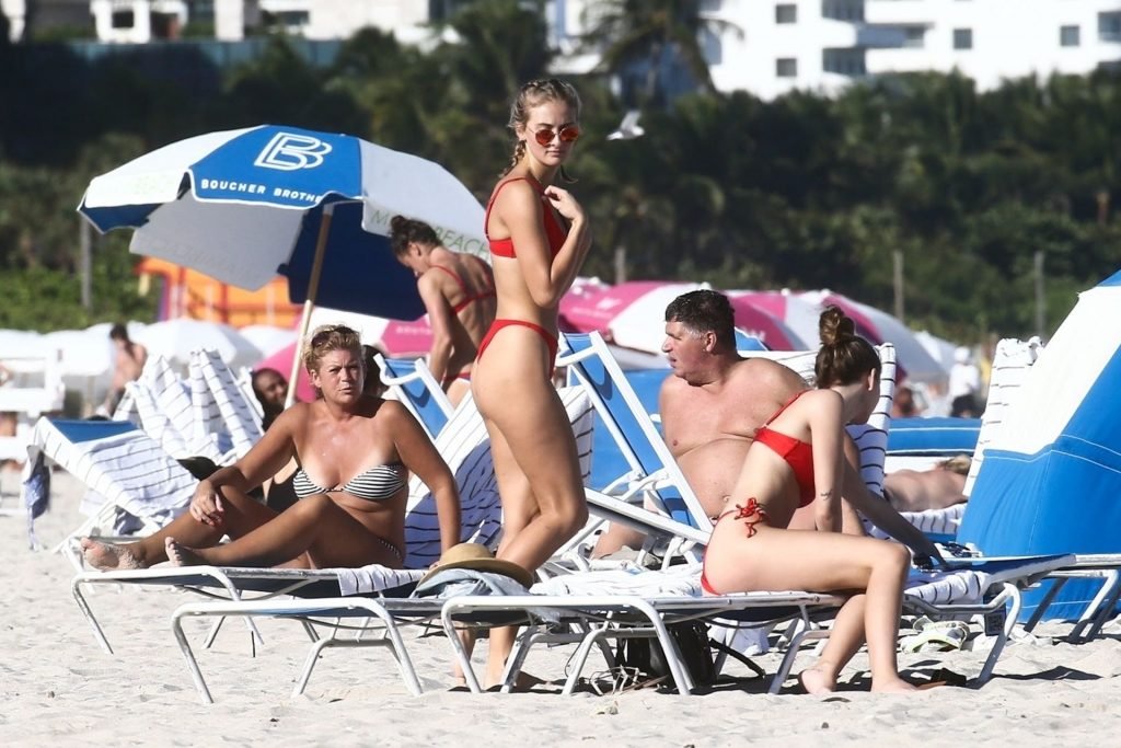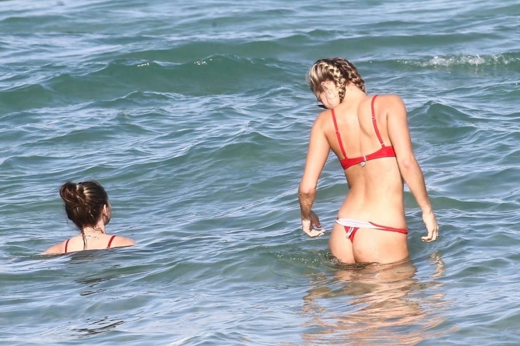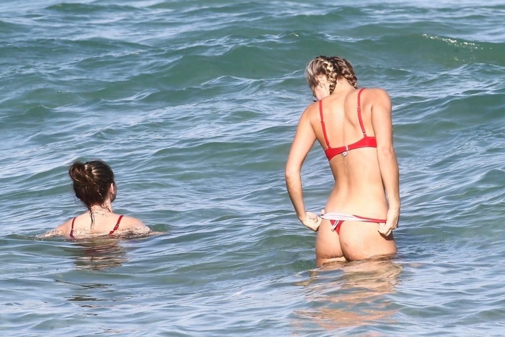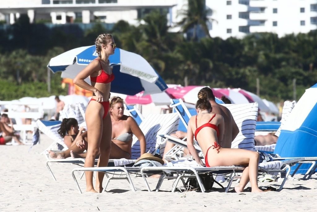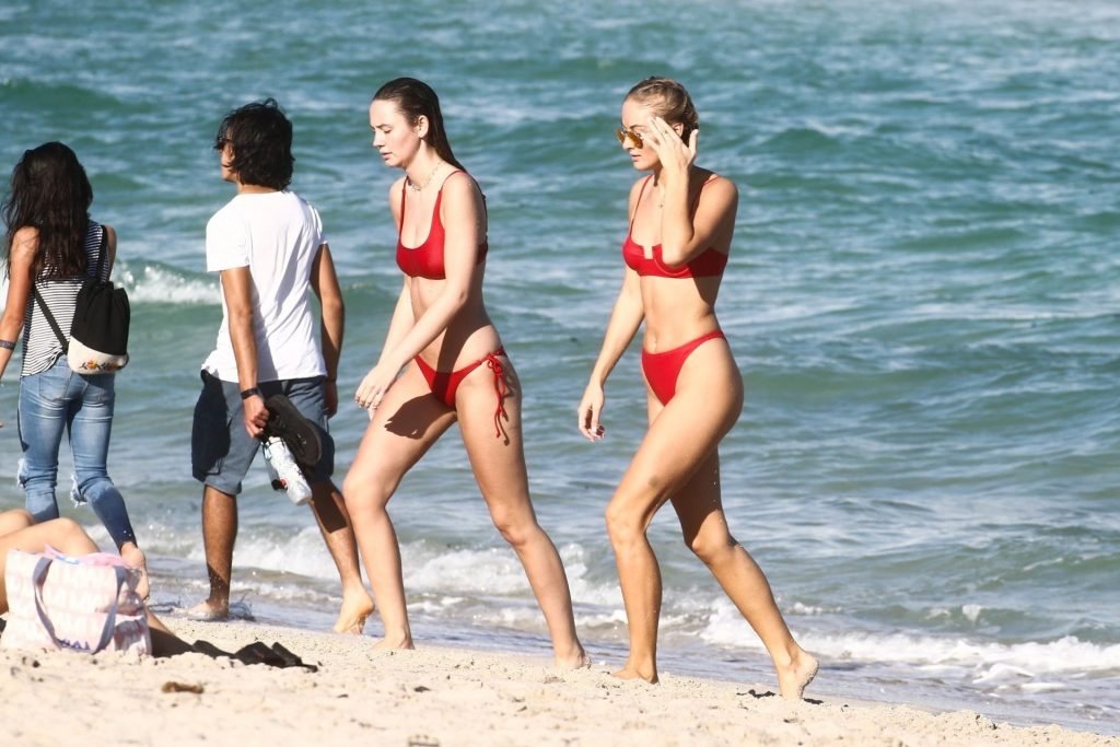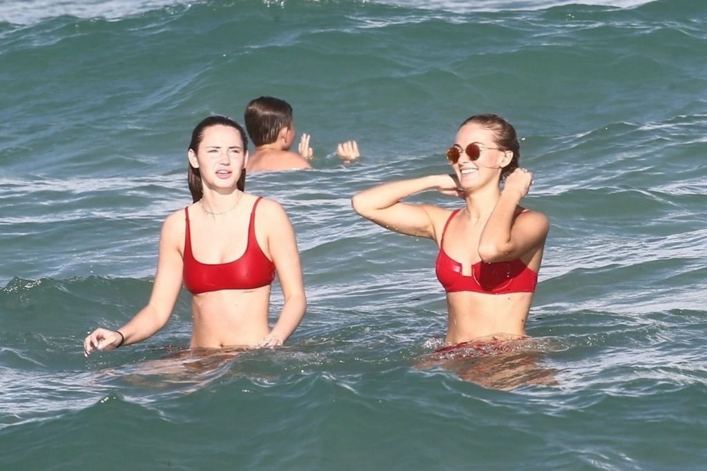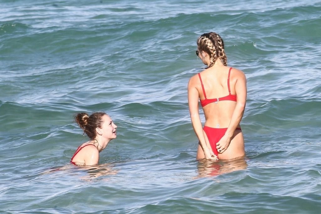 Instagram модель Селена Вебер и певица Лорен Эшли — красавицы в красных купальниках на пляже Майами, 30.10.2019. Девушки отдыхали на солнце, быстро окунулись в океан, а затем вернулись к своим шезлонгам.