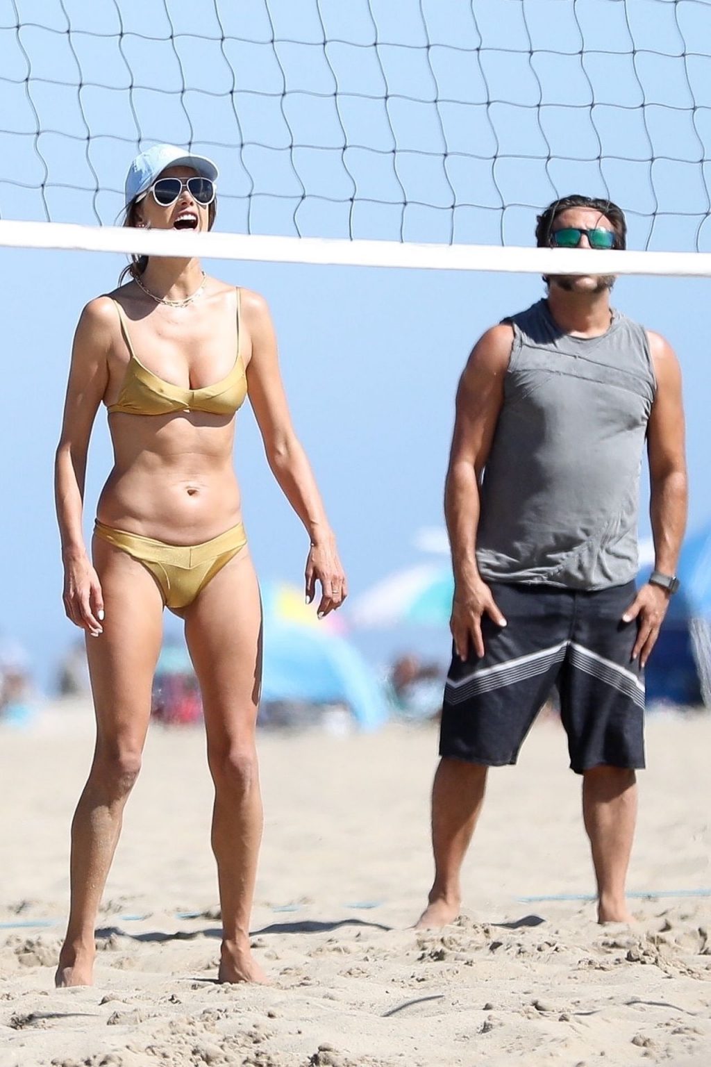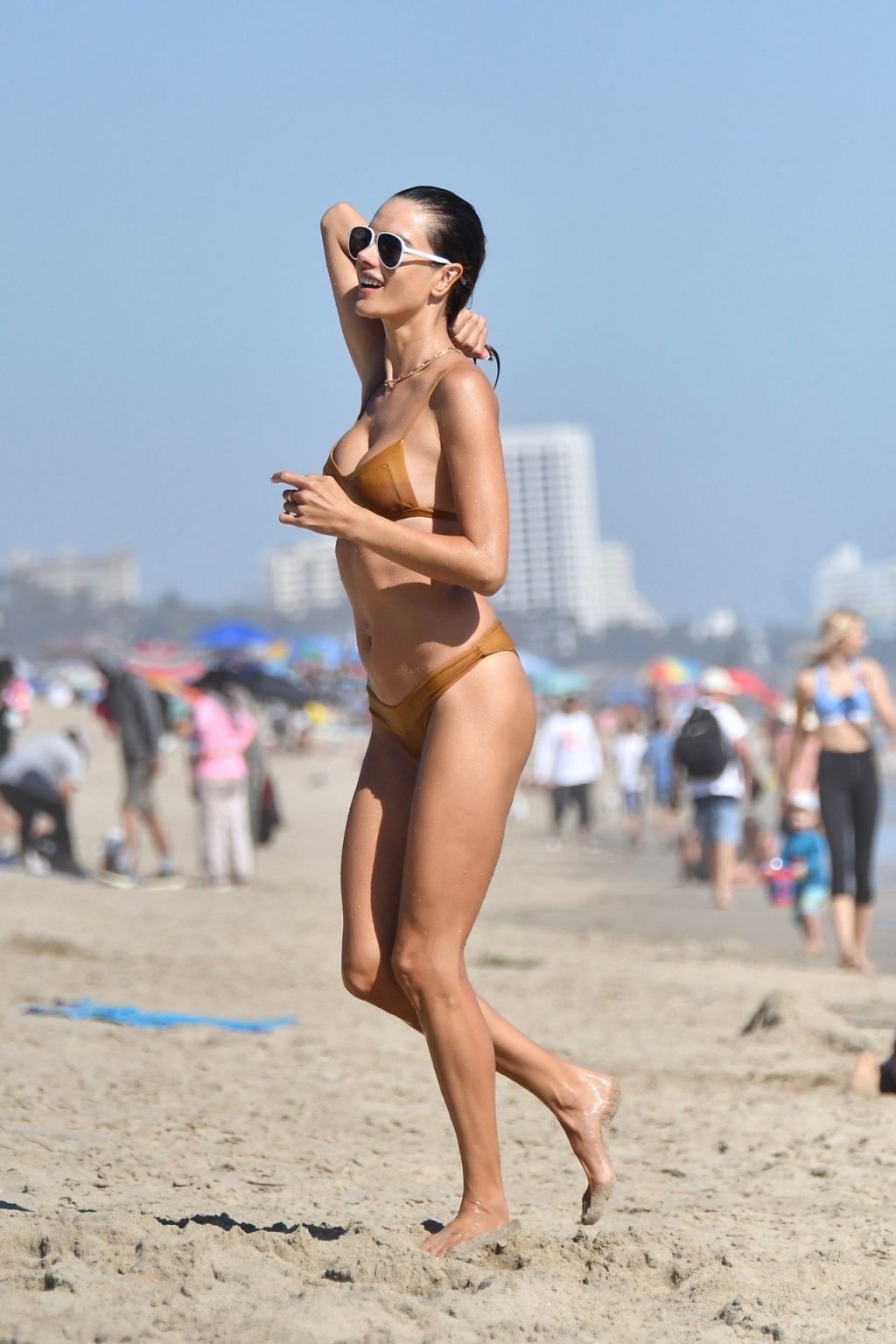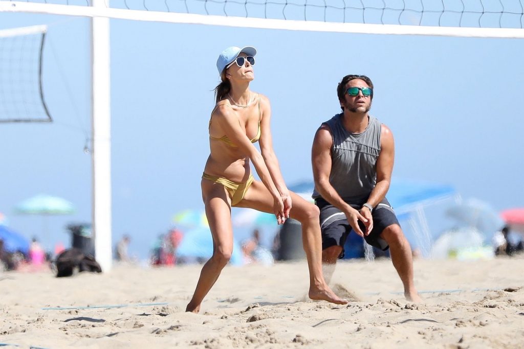 Алессандра Амбросио демонстрирует свою стройную фигуру в золотом бикини, играя в волейбол на пляже с друзьями – Малибу, Калифорния, 01.08.2020.