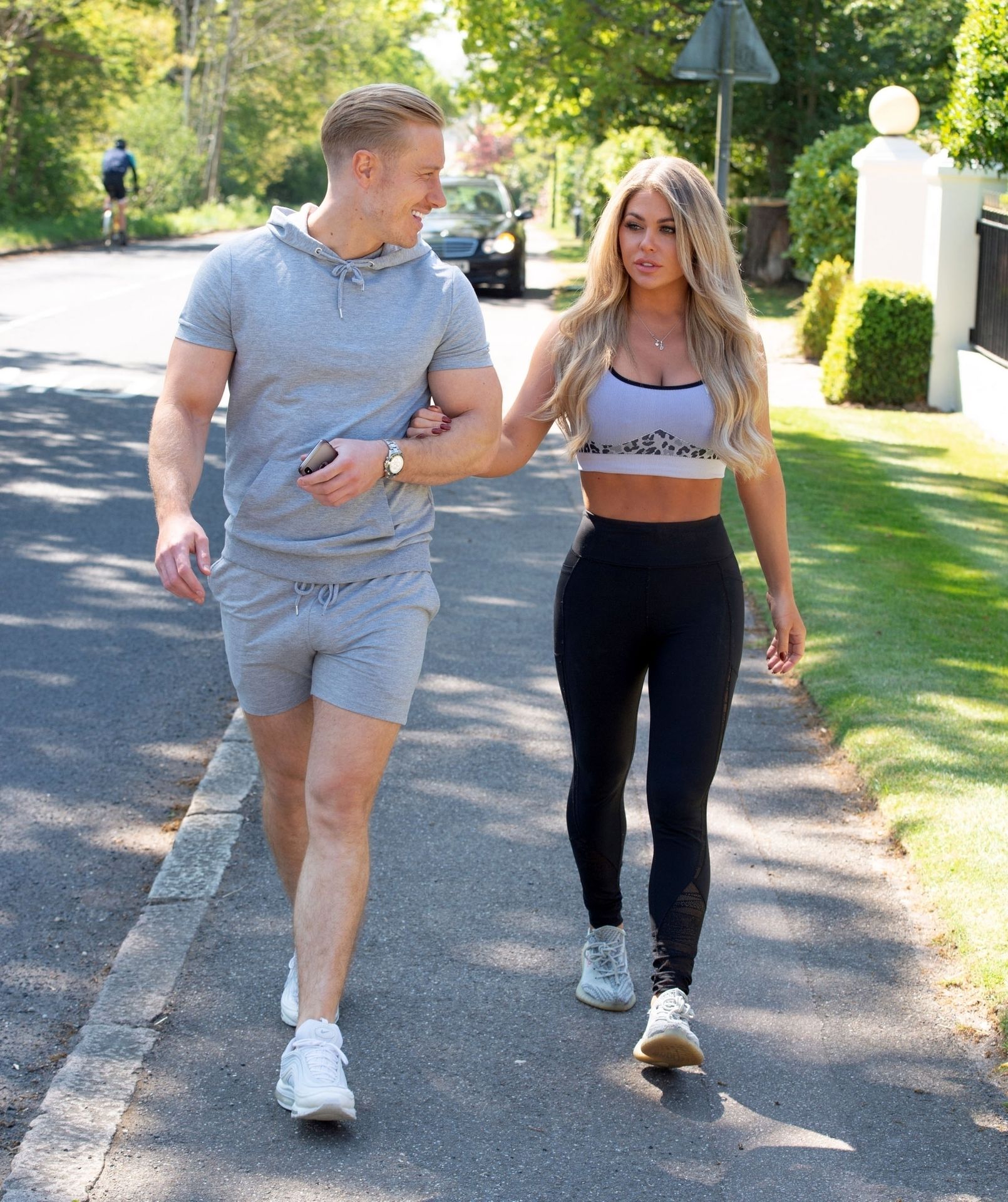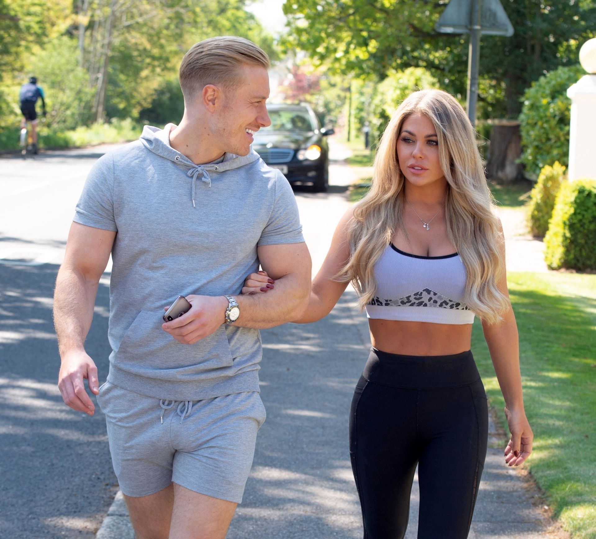 Пара, которая находится на изоляции вместе, держится за руки. Бианка демонстрирует свою тонкую талию в маленьком кроп-топе, в то время как Крис одет в шорты и футболку.