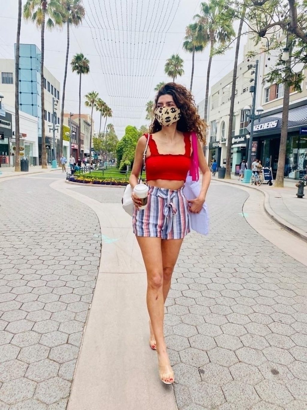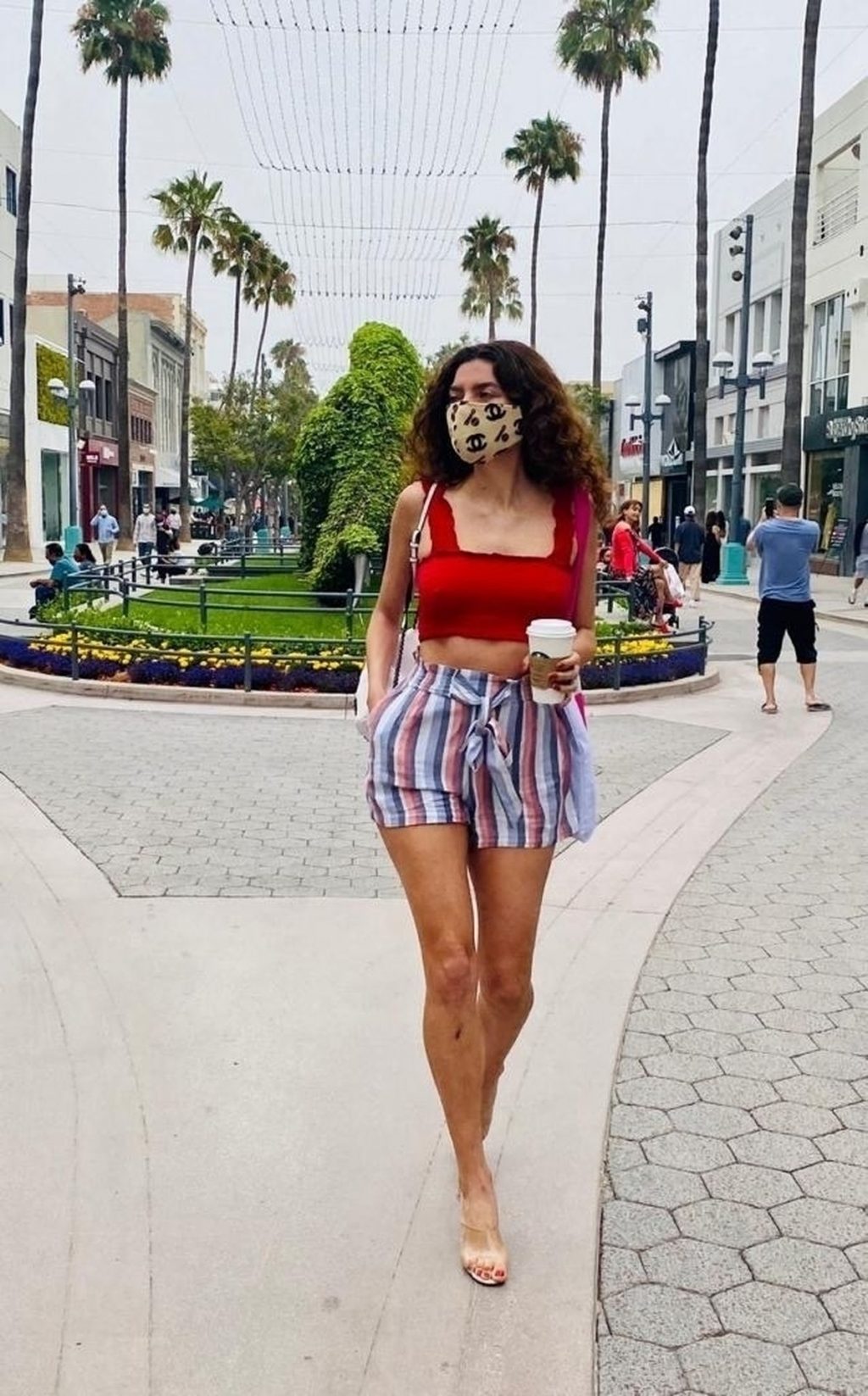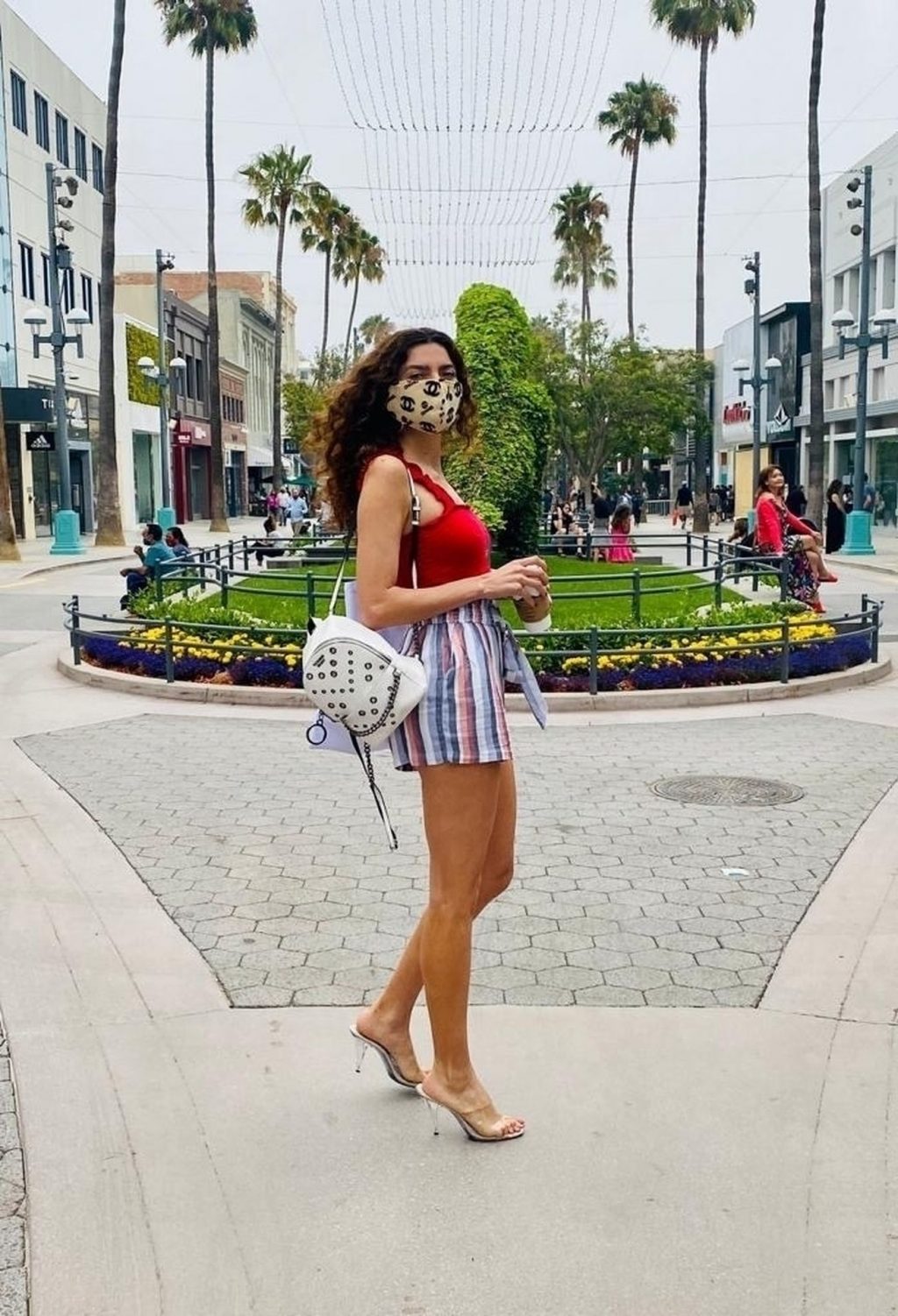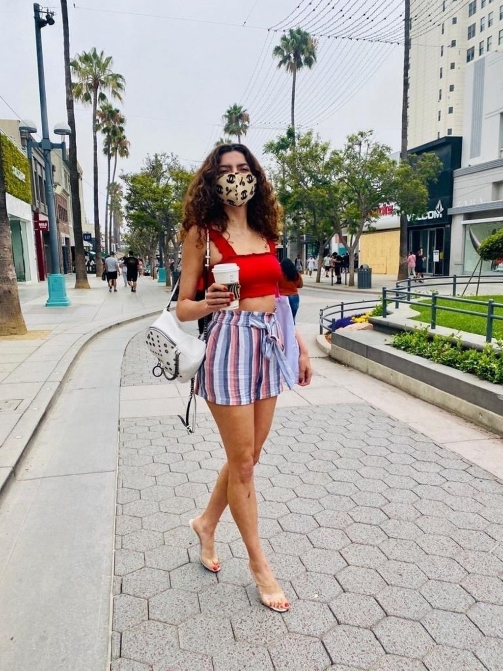 Длинноногая Бланка Бланко берет кофе на Третьей улице Променад в Санта-Монике, 03.08.2020.