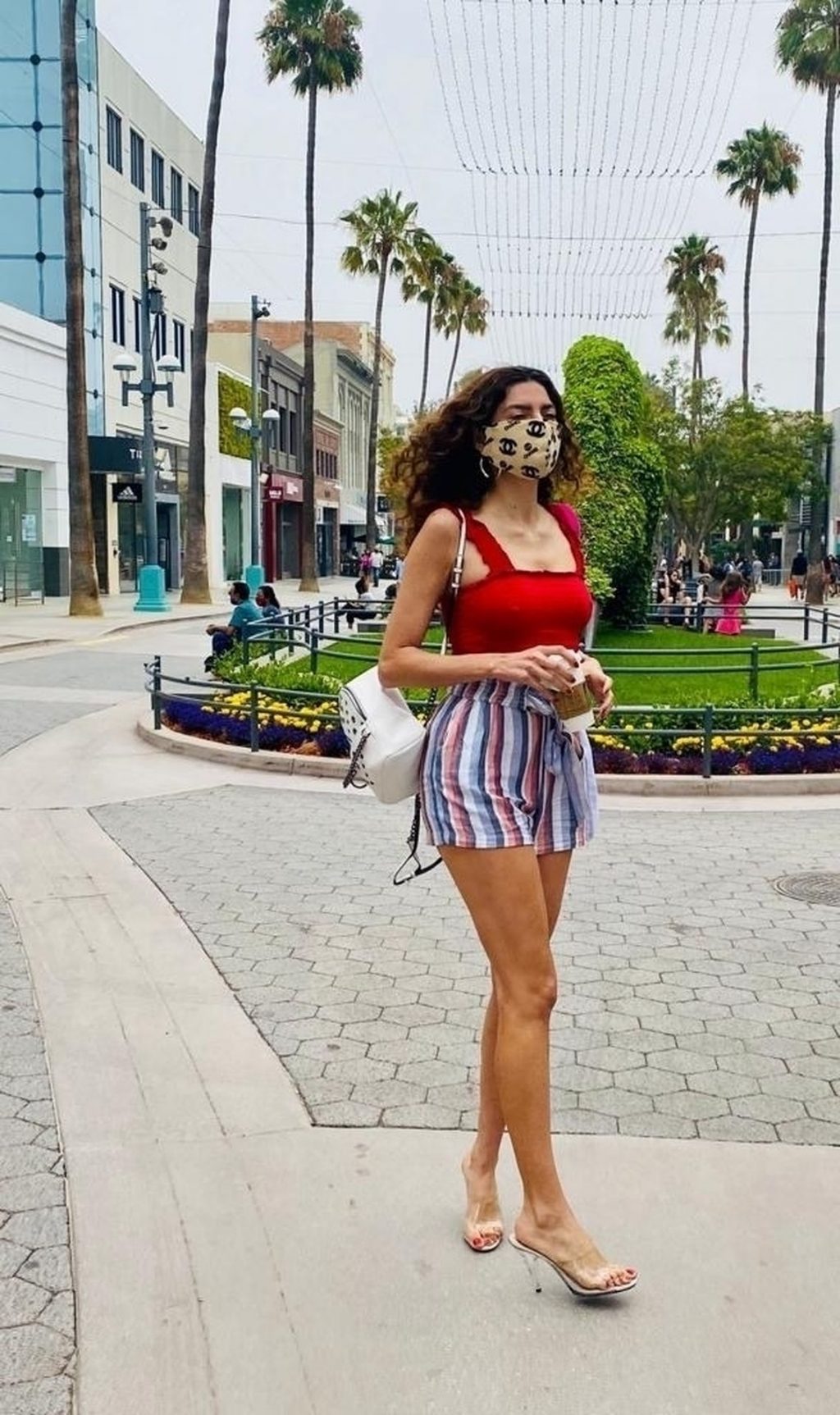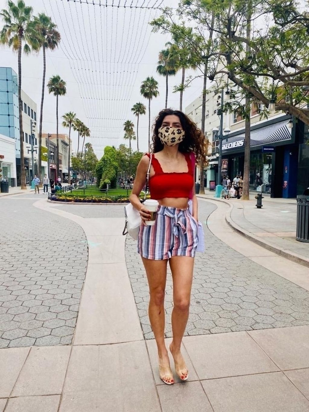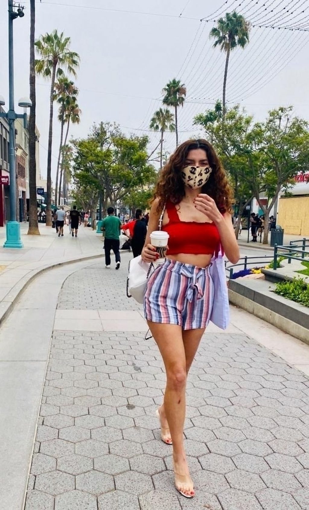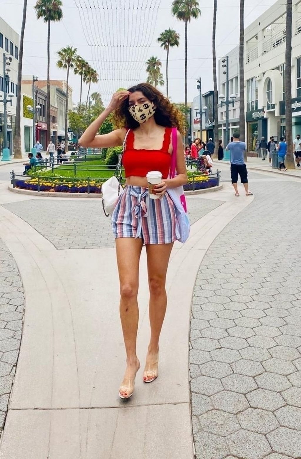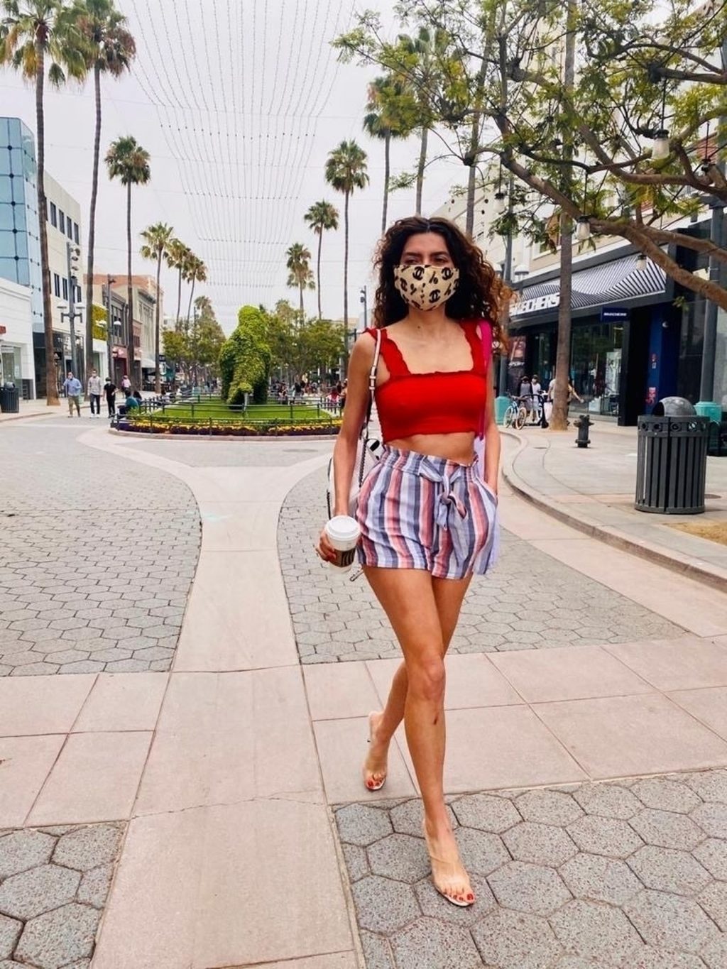 Длинноногая Бланка Бланко берет кофе на Третьей улице Променад в Санта-Монике, 03.08.2020.