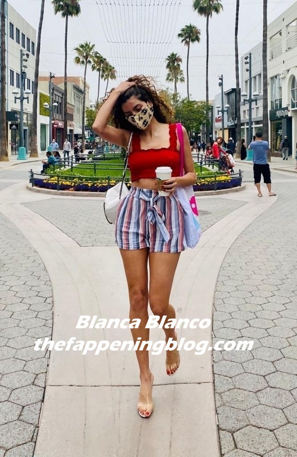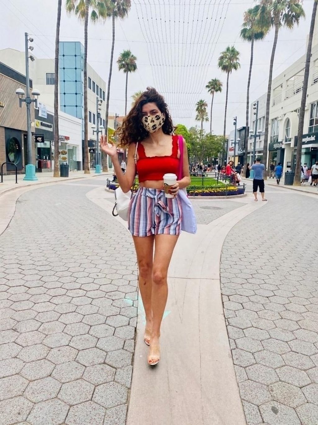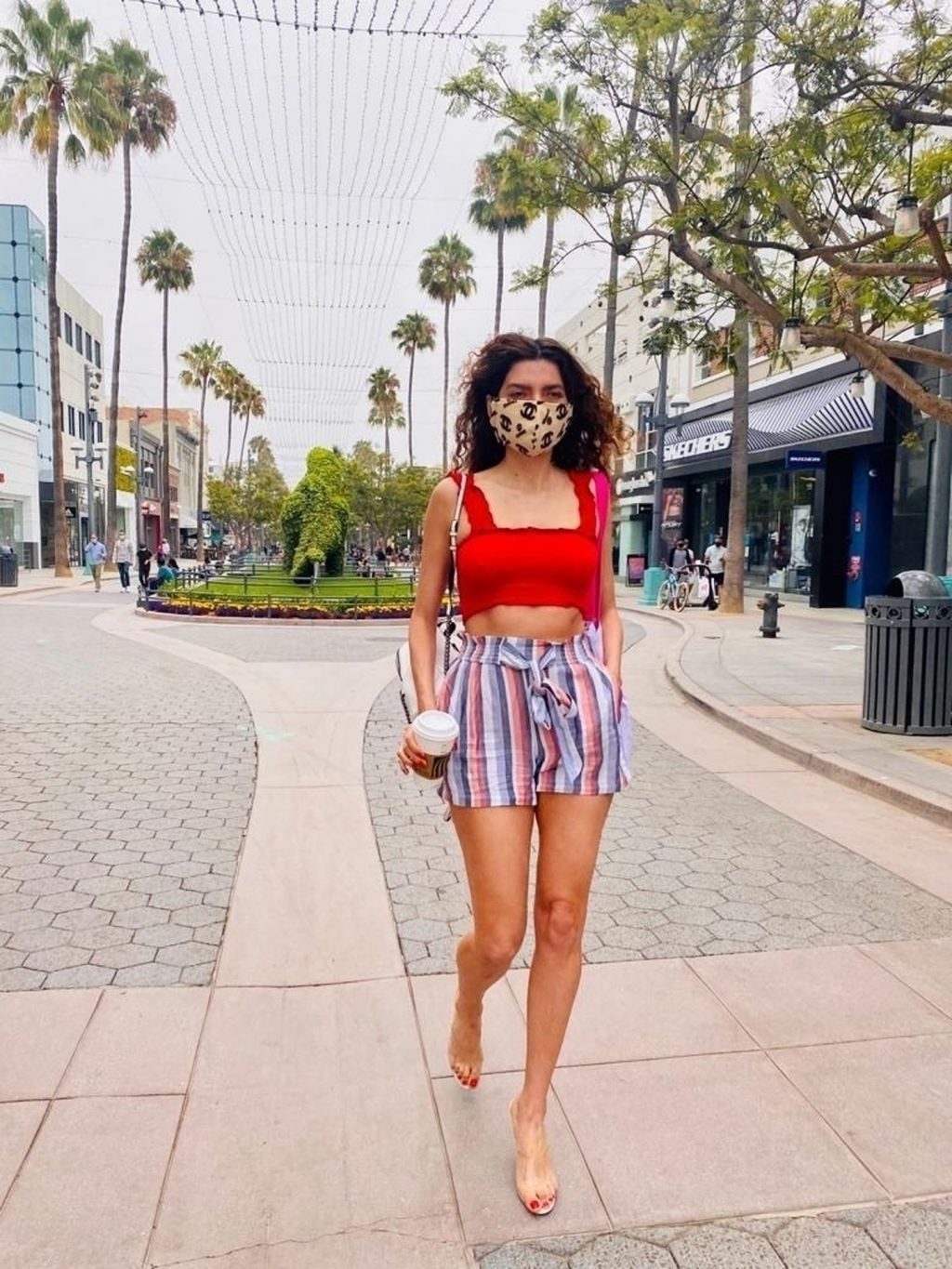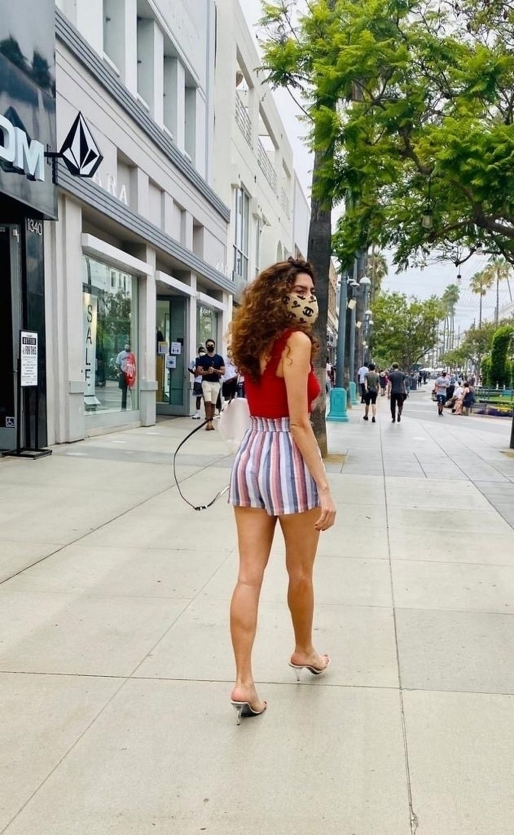 Длинноногая Бланка Бланко берет кофе на Третьей улице Променад в Санта-Монике, 03.08.2020.