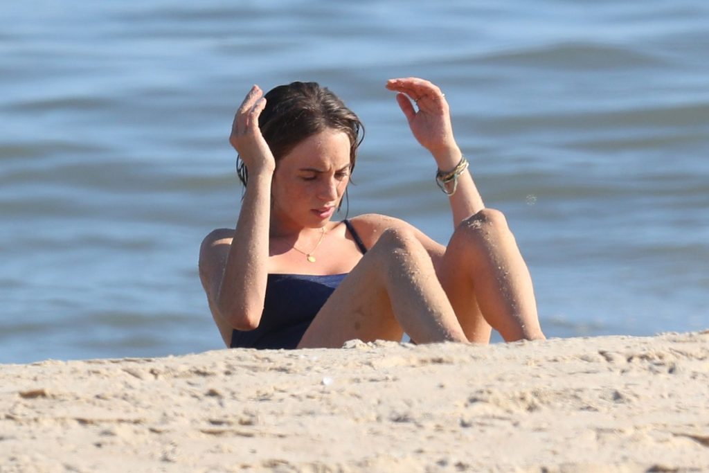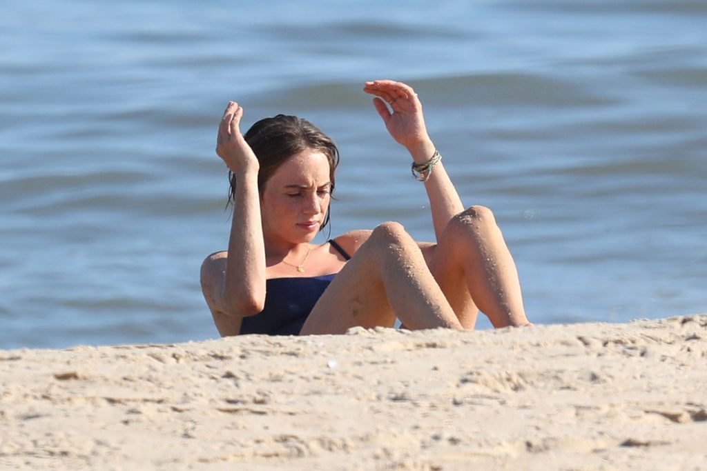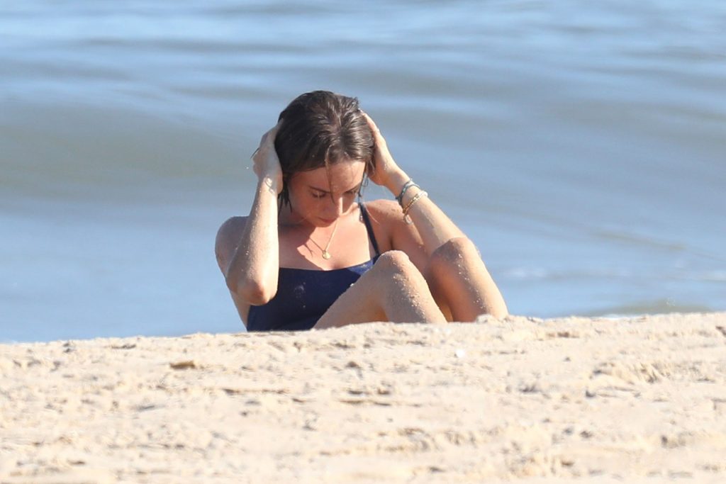 Хоук была в синем цельном купальнике и была сфотографирована, когда делала скручивания и подъемы ног на берегу океана.