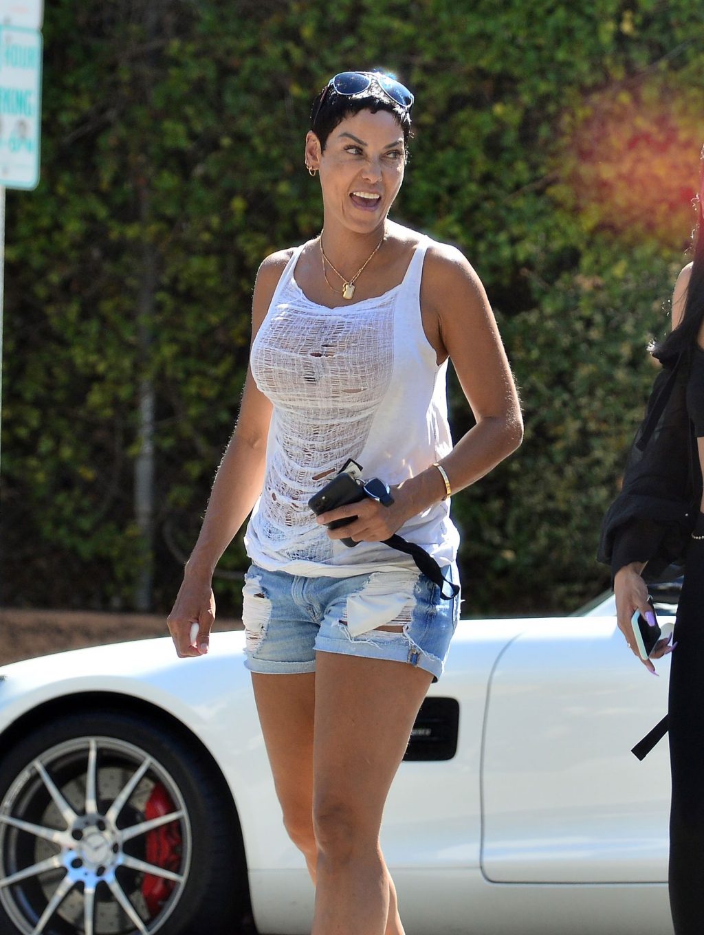 Nicole Murphy любуется своим родстером Mercedes AMG GT стоимостью 180 000 долларов после поездки с подругой по Беверли-Хиллз, 07.07.2020. 52-летняя модель была одета в белую майку, джинсовые шорты и сандалии.