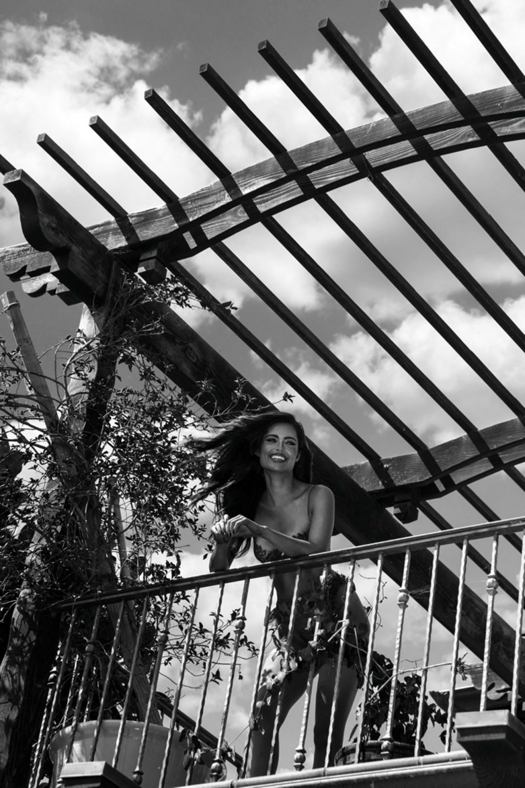 Рене позирует на локации в Малибу Хиллз. Вдохновленные модными съемками 1980-х и 1990-х годов, дизайны включают голубое кружево, атласную отделку и золотую фурнитуру.