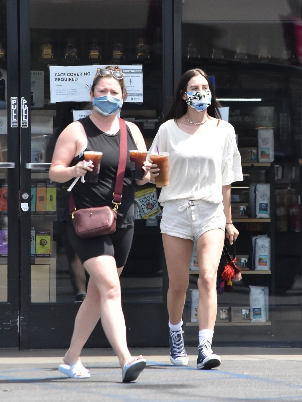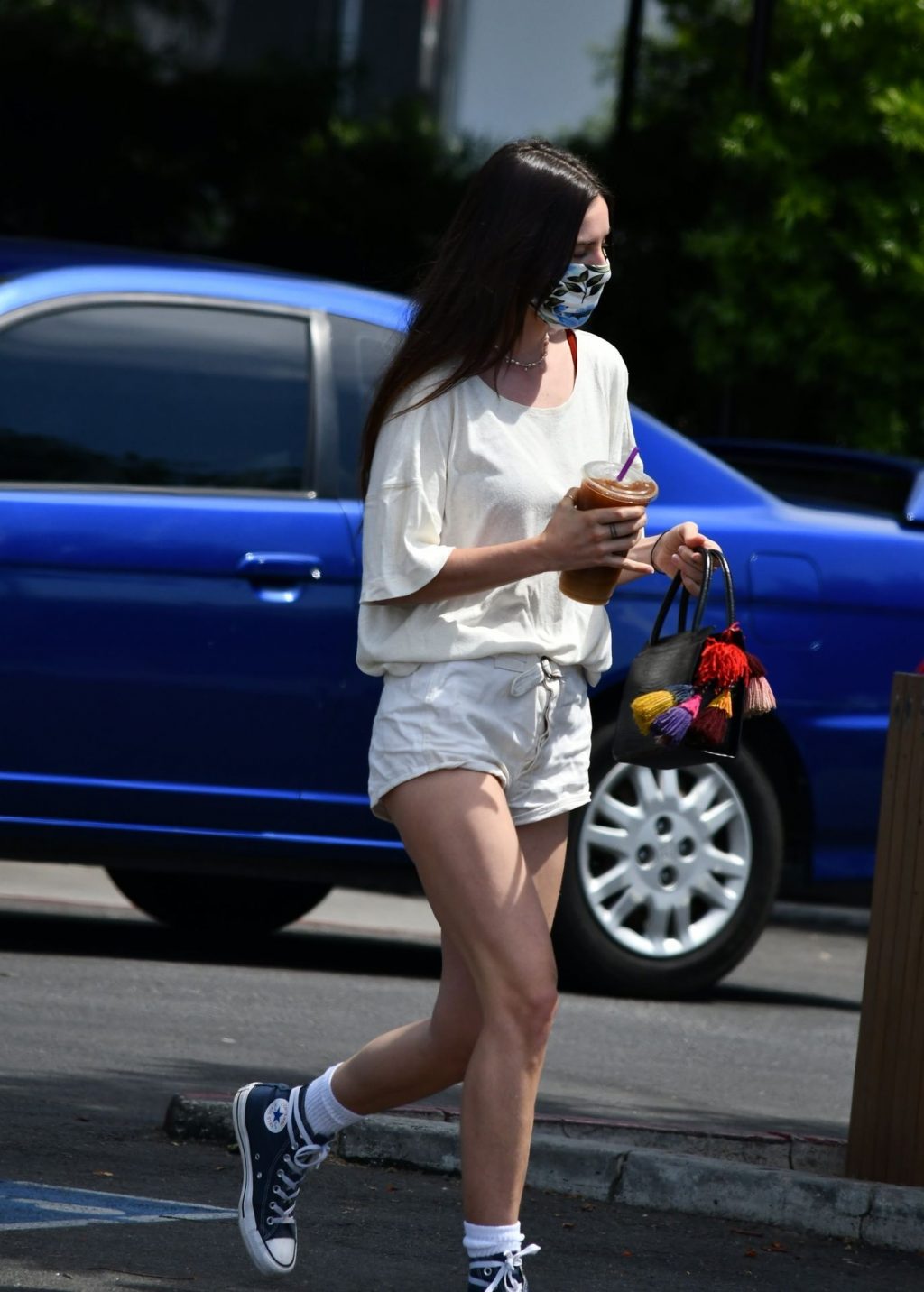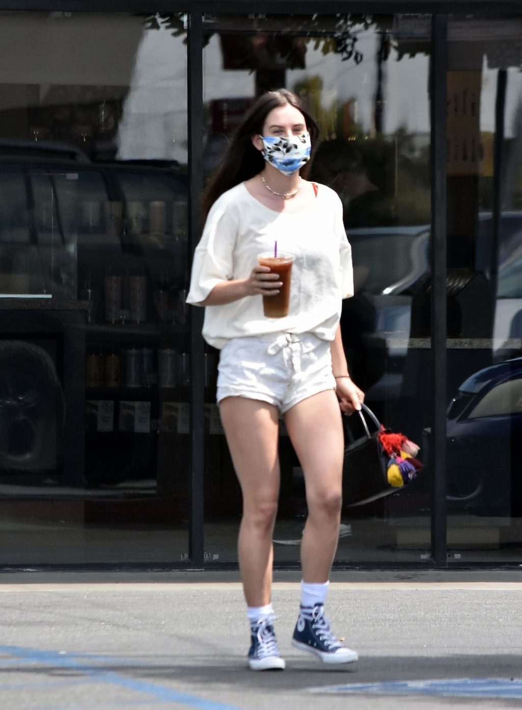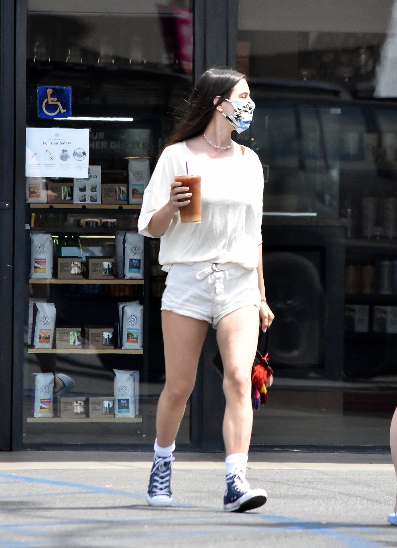 Длинноногая Скаут Уиллис замечена, когда делает остановку в местном Coffee Bean & Tee, чтобы взять холодный кофе в Лос-Фелисе, 12.06.2020. Скаут использовала милую маску с цветочным принтом во время своей кофейной прогулки.