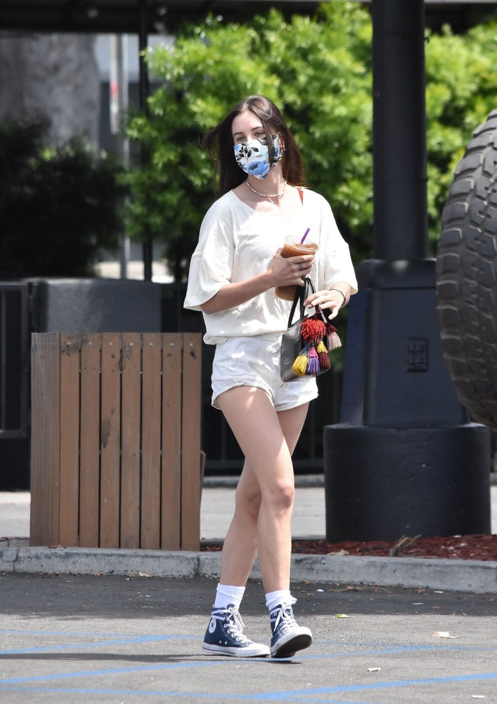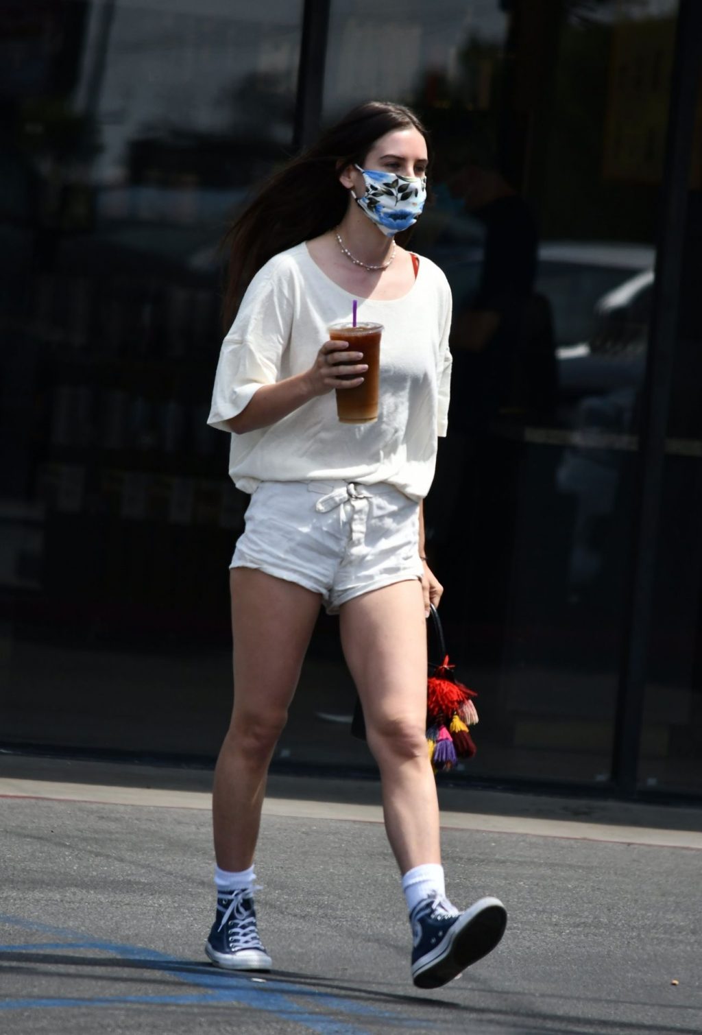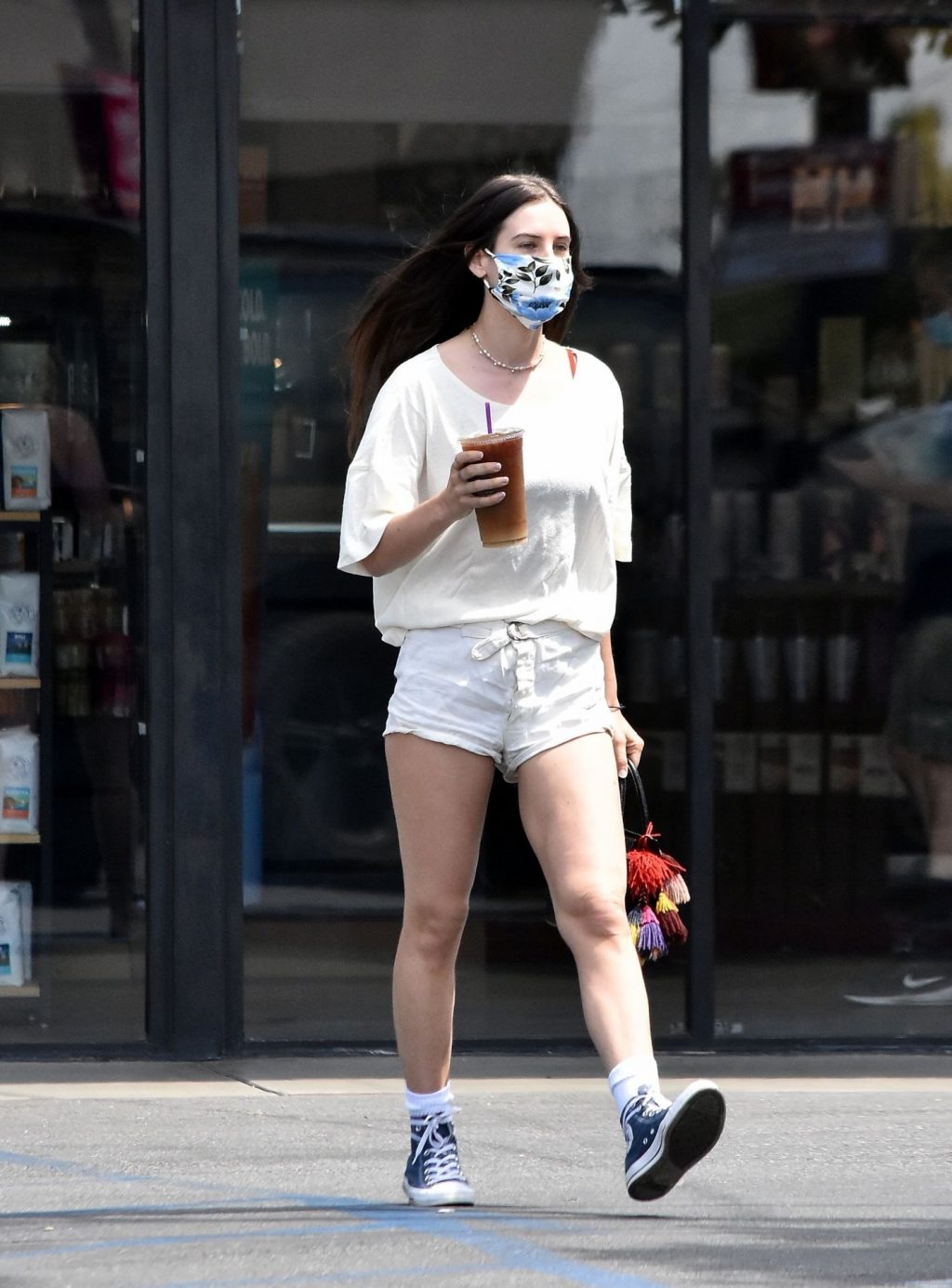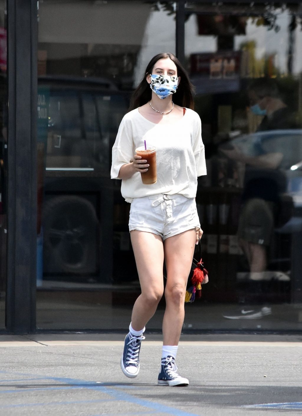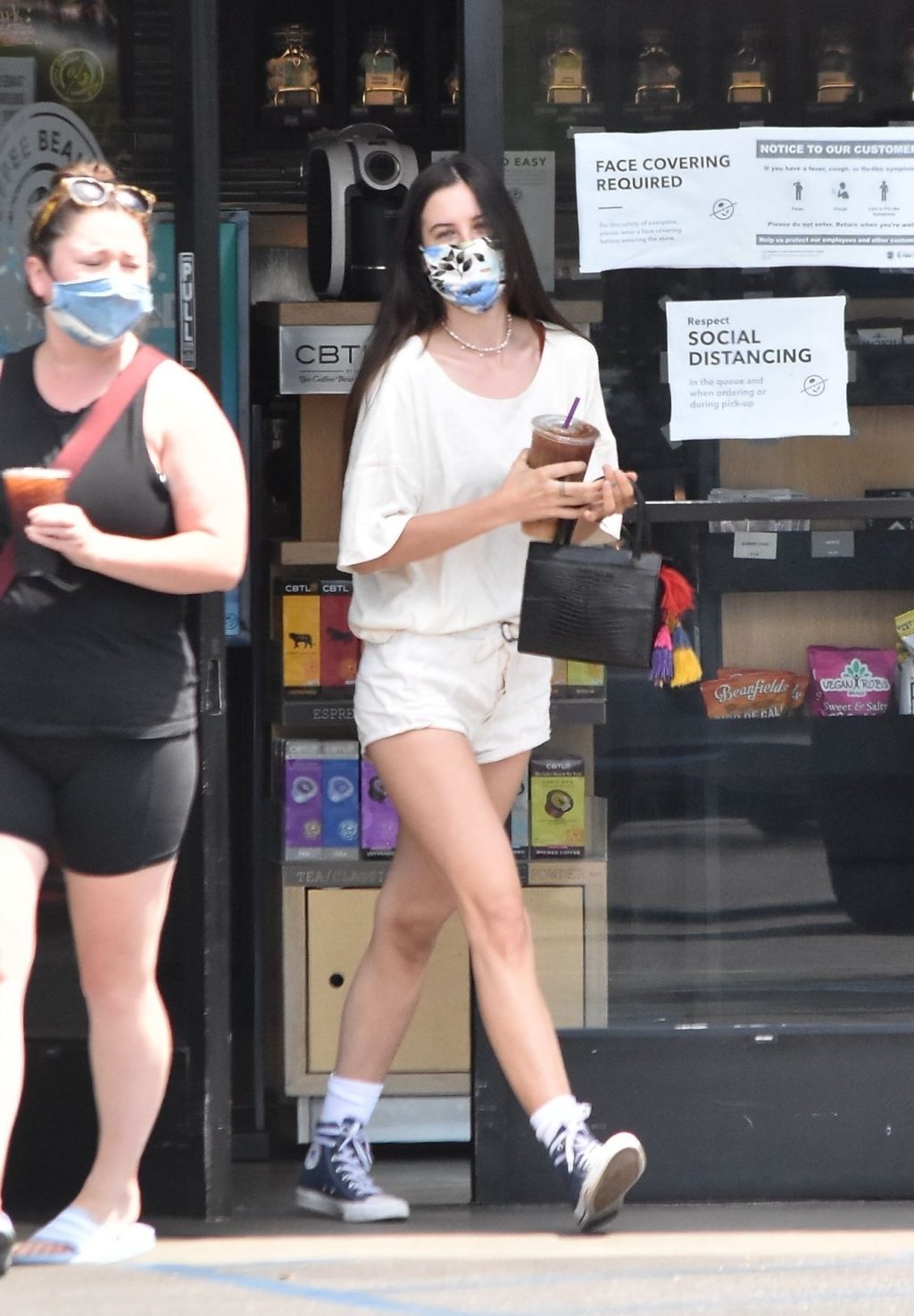 Длинноногая Скаут Уиллис замечена, когда делает остановку в местном Coffee Bean & Tee, чтобы взять холодный кофе в Лос-Фелисе, 12.06.2020. Скаут использовала милую маску с цветочным принтом во время своей кофейной прогулки.