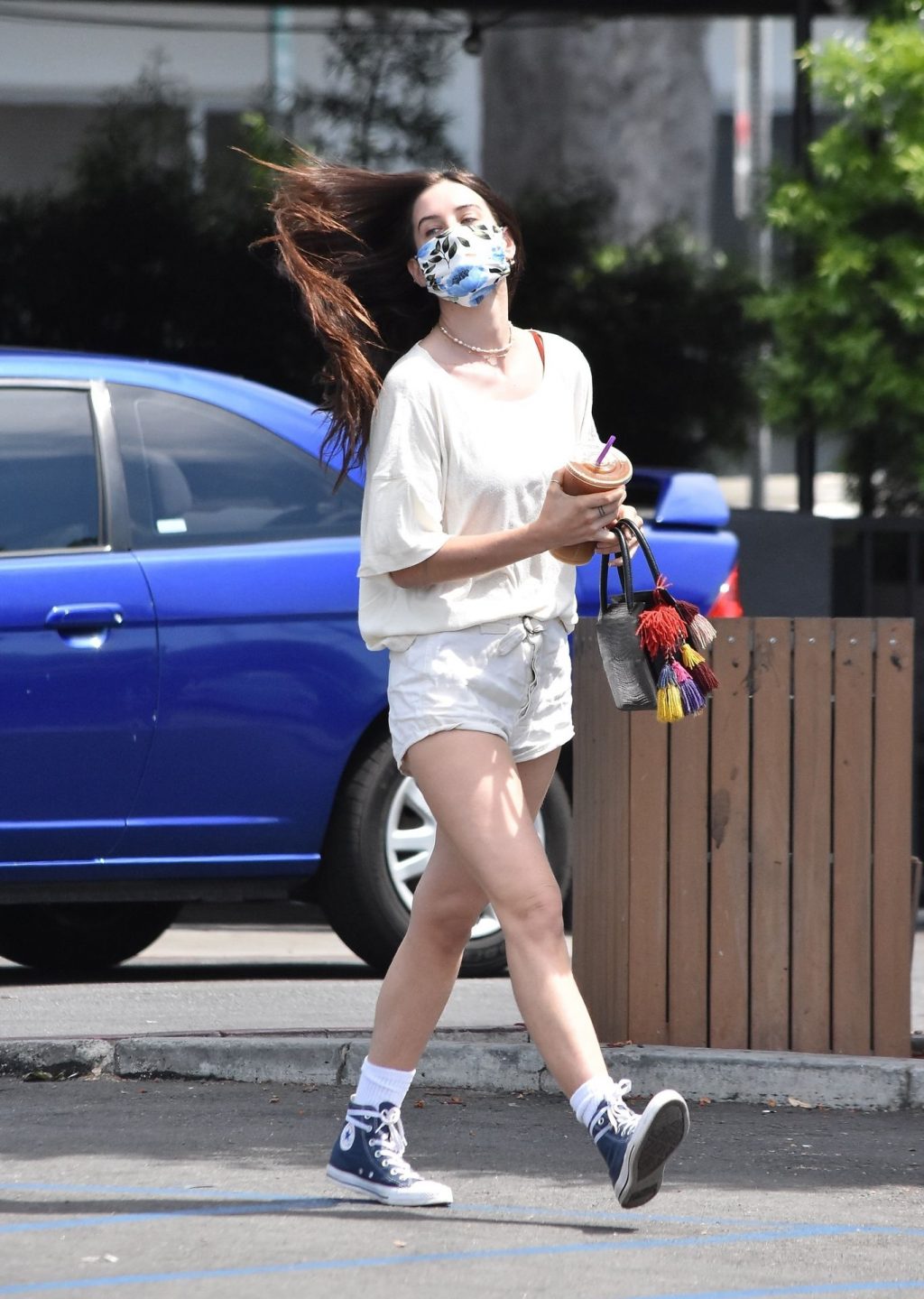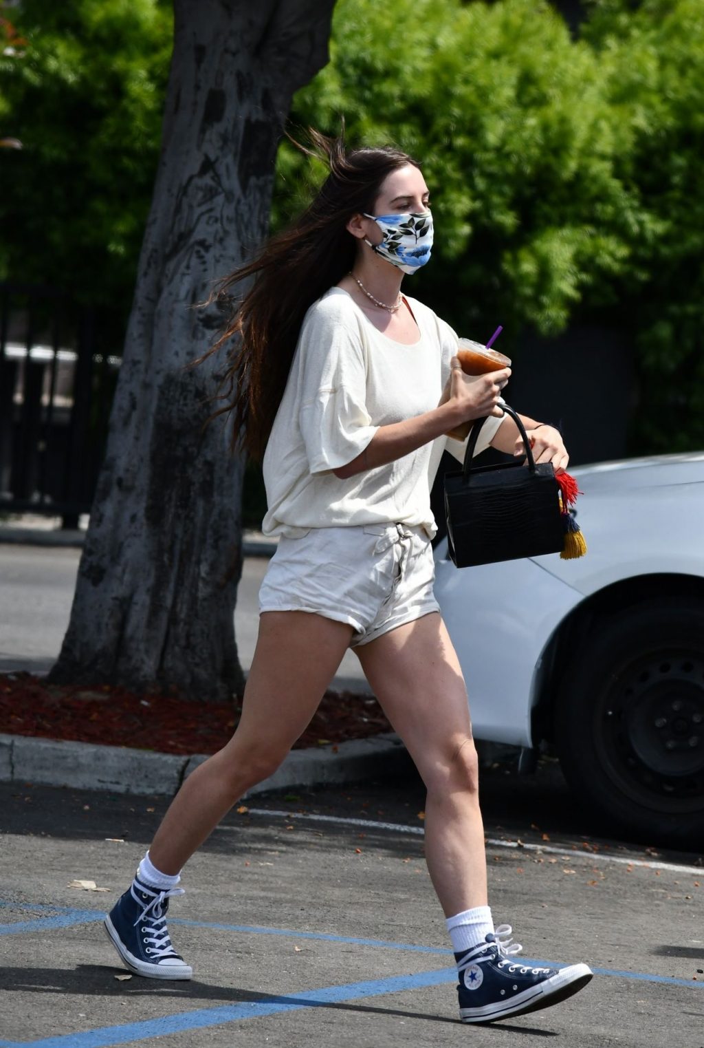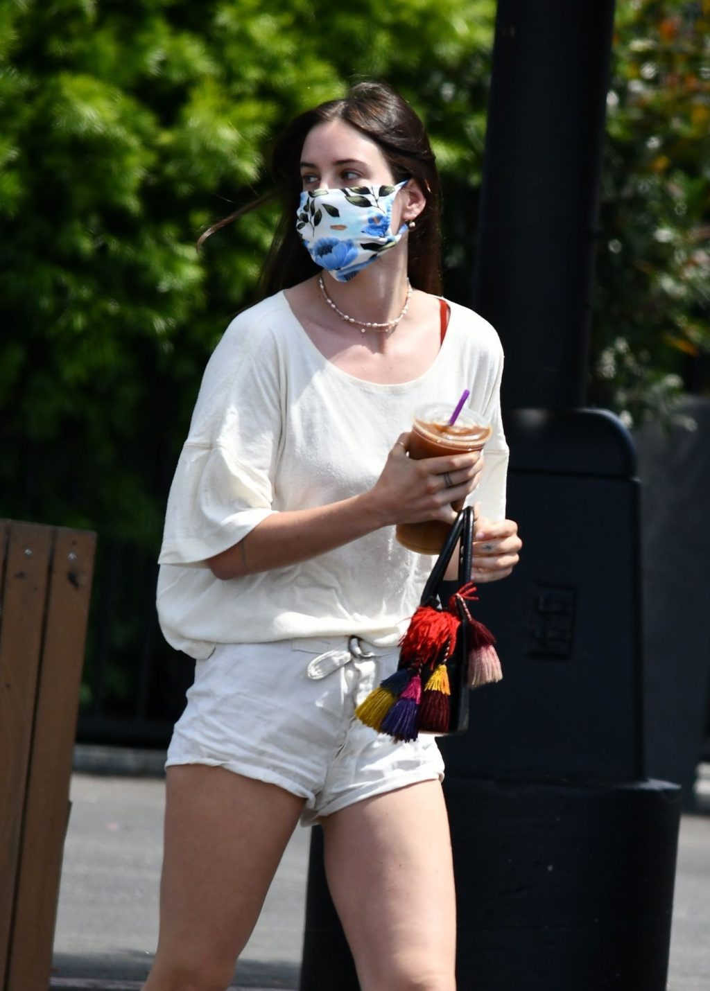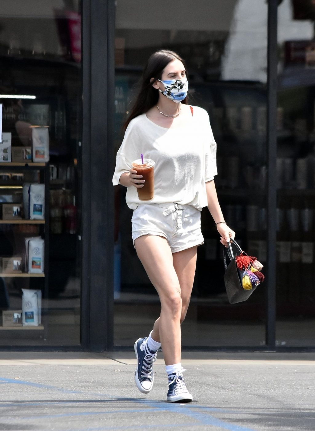 Длинноногая Скаут Уиллис замечена, когда делает остановку в местном Coffee Bean & Tee, чтобы взять холодный кофе в Лос-Фелисе, 12.06.2020. Скаут использовала милую маску с цветочным принтом во время своей кофейной прогулки.
