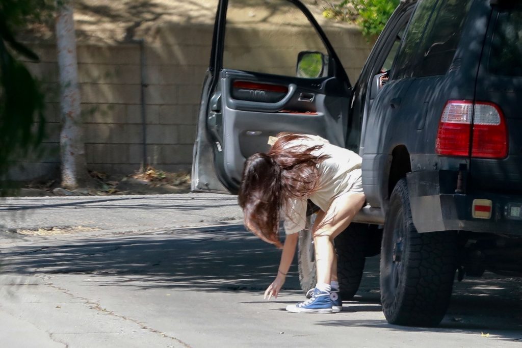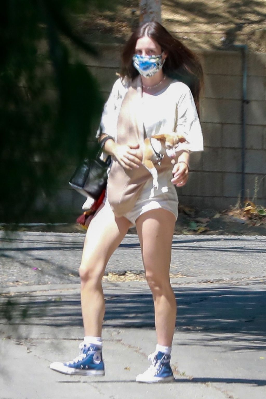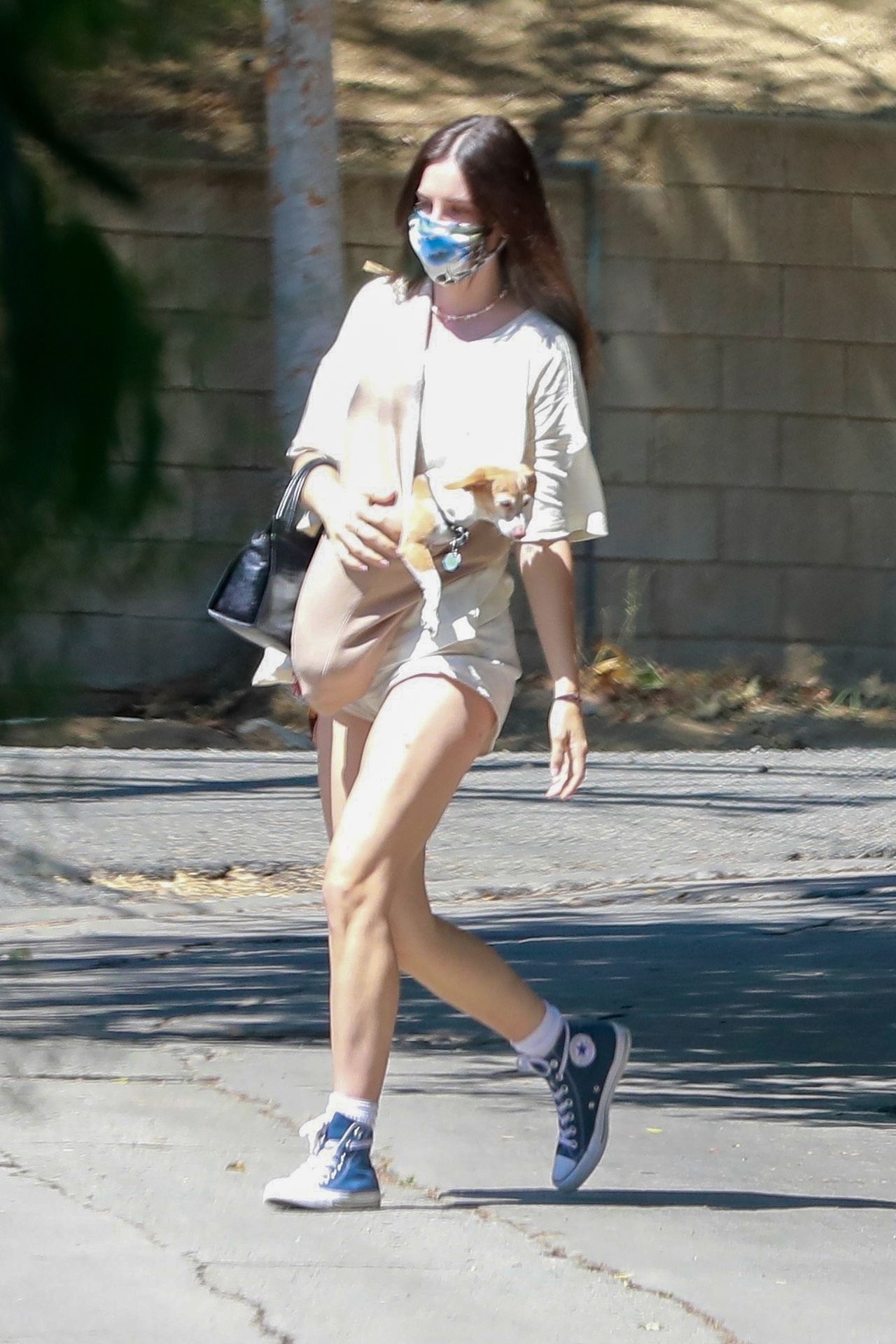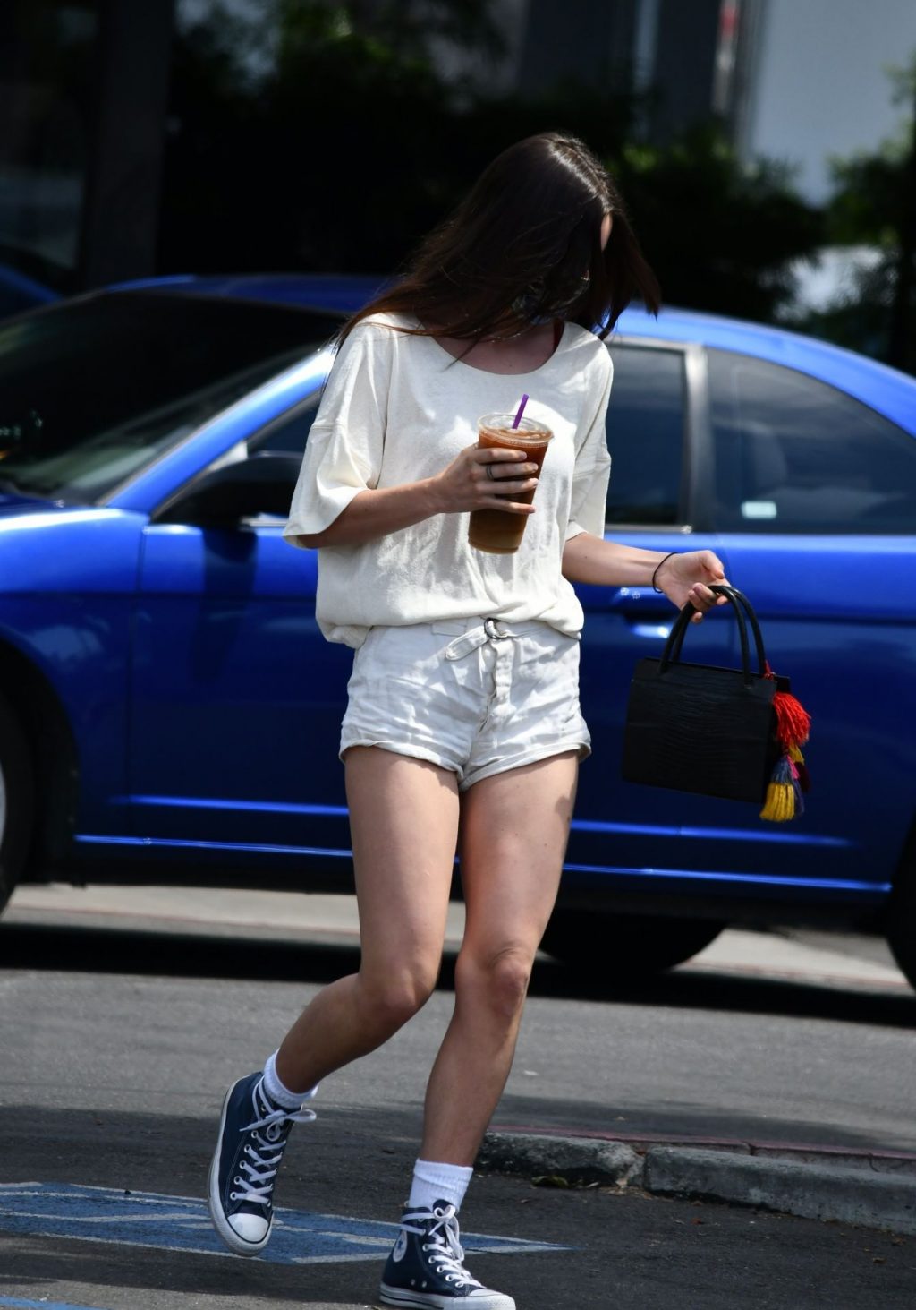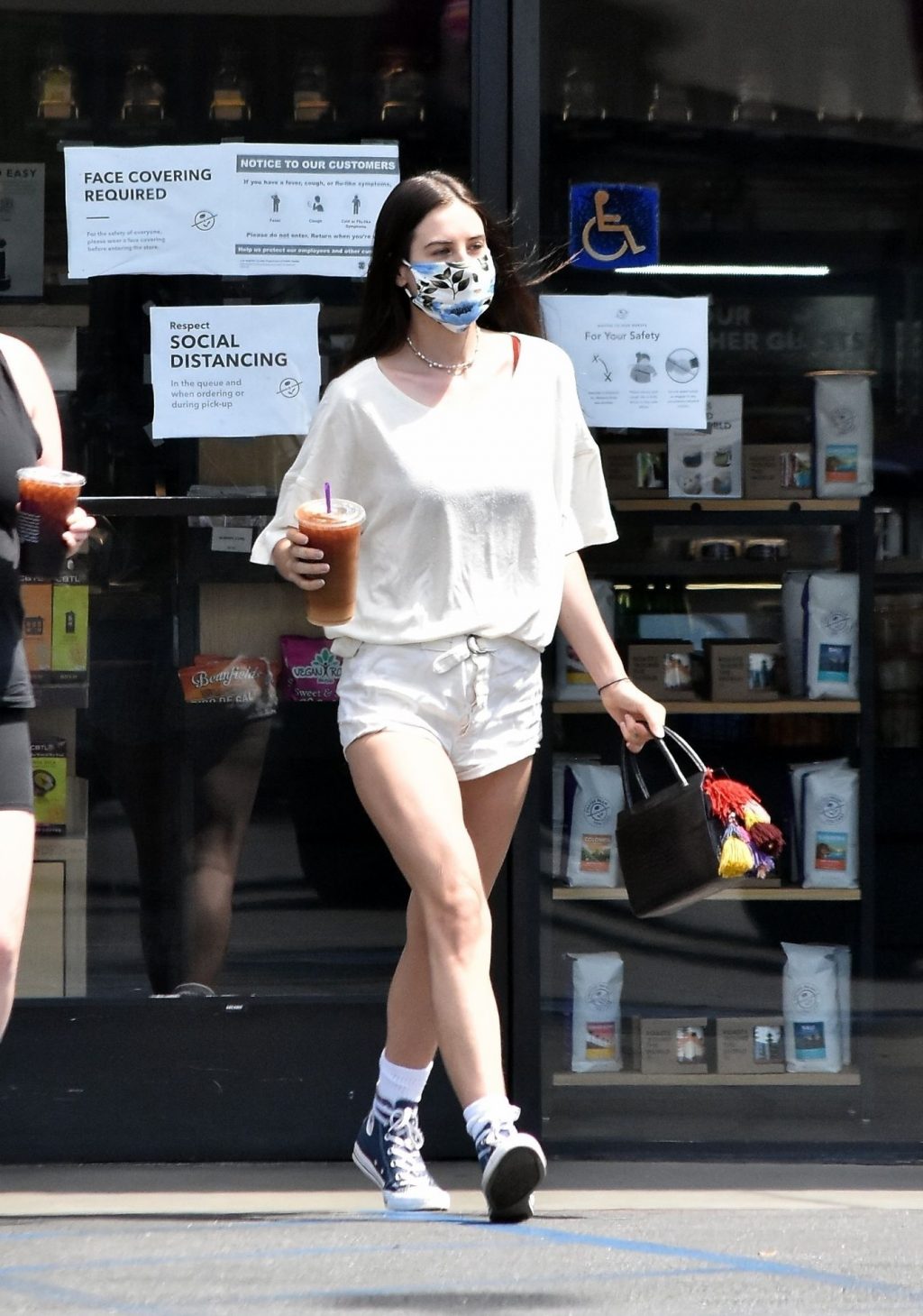 Длинноногая Скаут Уиллис замечена, когда делает остановку в местном Coffee Bean & Tee, чтобы взять холодный кофе в Лос-Фелисе, 12.06.2020. Скаут использовала милую маску с цветочным принтом во время своей кофейной прогулки.