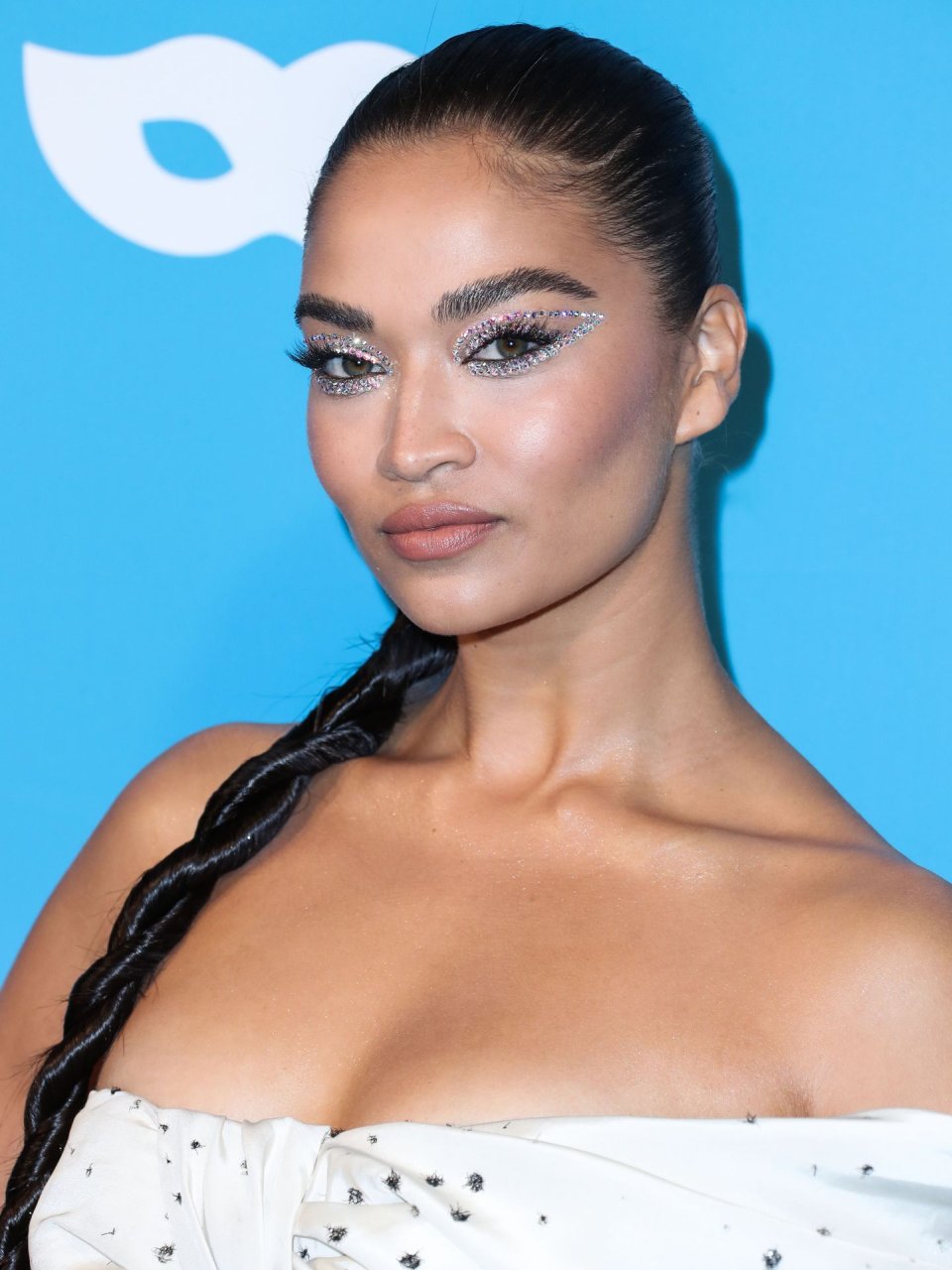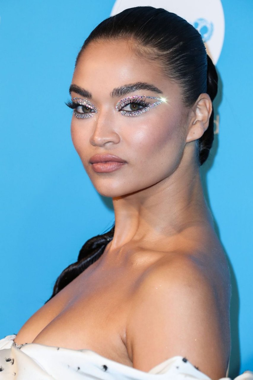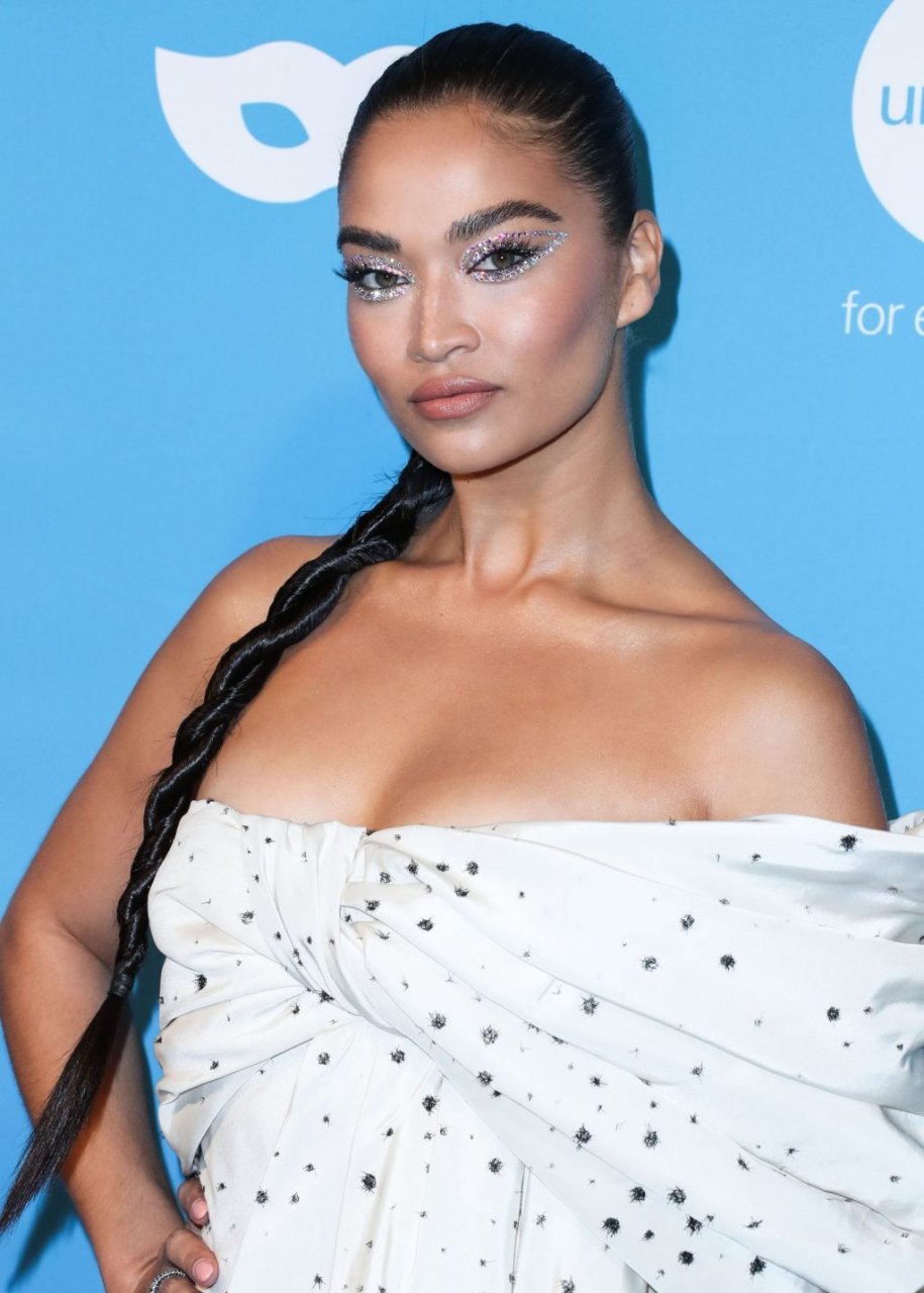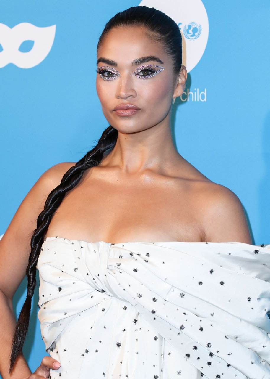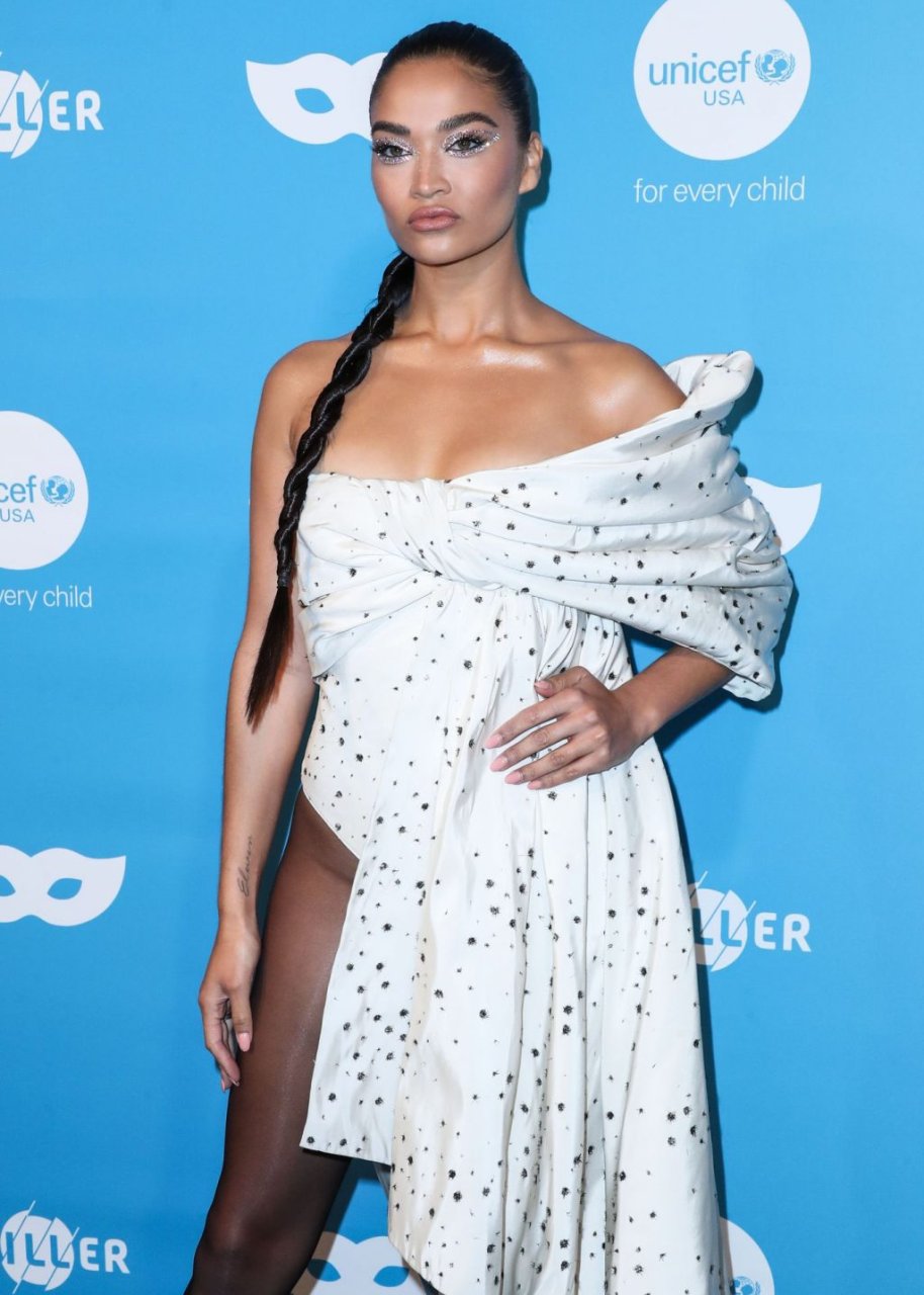 Модель Шанина Шейк была сфотографирована в платье с открытыми плечами на 7-м ежегодном маскарадном балу UNICEF 2019, который проходил в отеле Kimpton La Peer 26 октября 2019 года в Уэст-Голливуде, Лос-Анджелес.