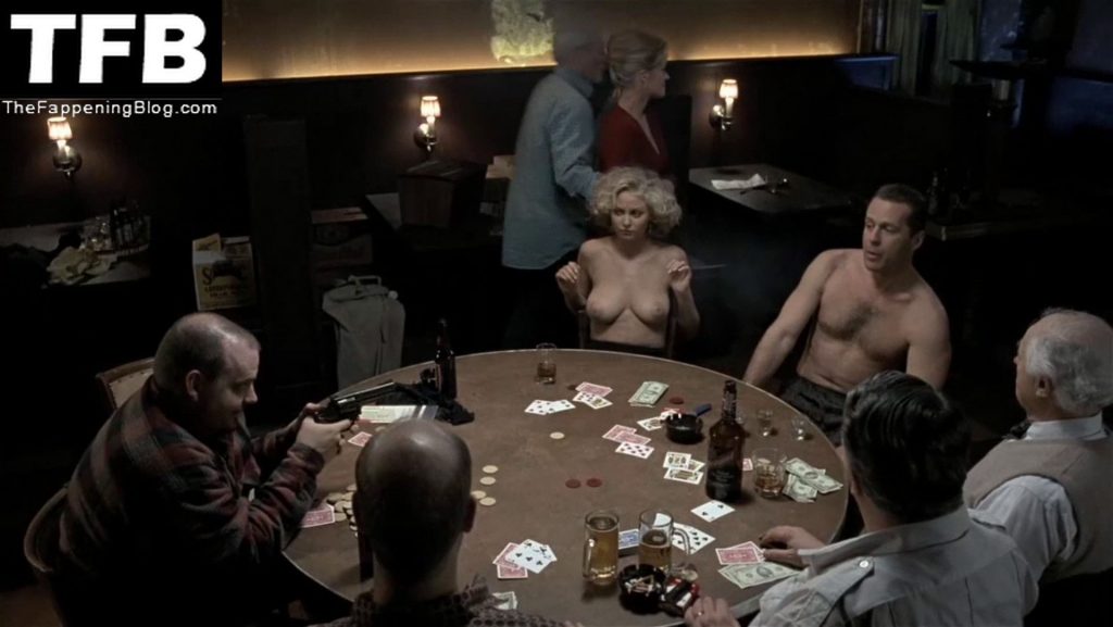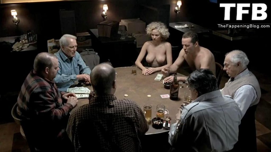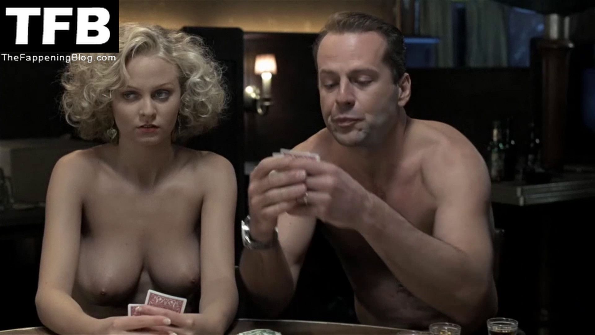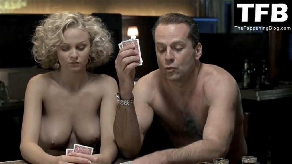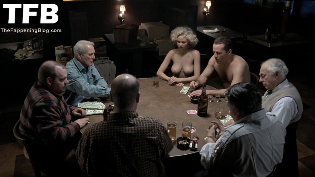 Шанна Лаумейстер сидит топлесс за карточным столом, показывая нам свои красивые груди, пока она сидит рядом с Брюсом Уиллисом, и они играют в покер голыми.