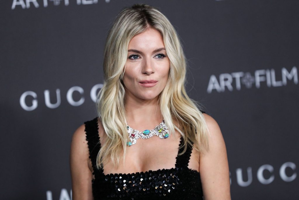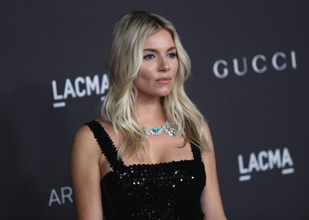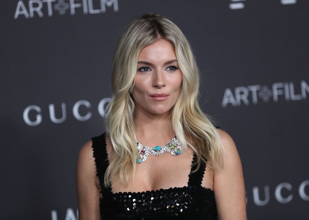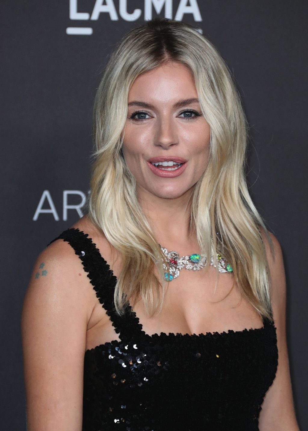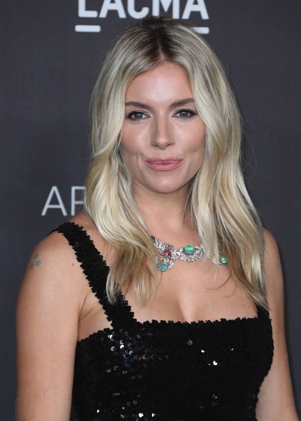 Сиенна Миллер прибывает на гала-вечер LACMA Art and Film 2019 в Музее искусств округа Лос-Анджелес, 02.11.2019. 37-летняя актриса была одета в элегантное черное платье Gucci, украшенное пайетками, и черные сандалии. На шее она носила красивое бриллиантовое ожерелье с цветными камнями.