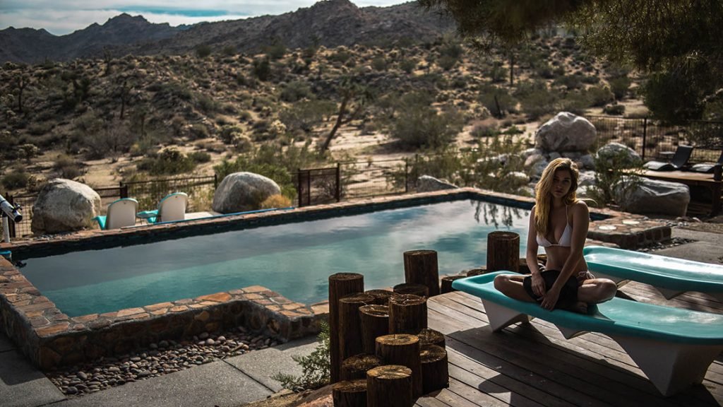 Молодая модель Skye Blue наслаждается солнечным днем у бассейна в Joshua Tree с фотографом Алленом Хенсоном (2018). Она остудила своё горячее тело под душем.